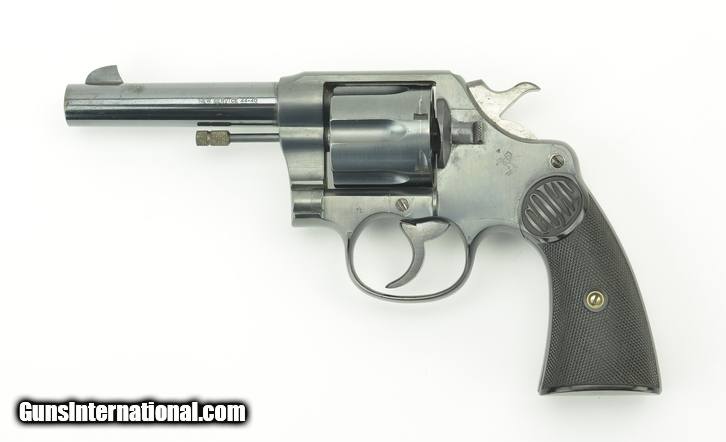 Description: Colt New Service .44-40 caliber revolver. Manufactured in 1933. Popular .44-40 caliber. Barrel length is 4 ½”. Bore is perfect. Gun has 99% bright original blue. In his book, “Colt’s New Service Revolver,” Timothy Mullin shows on page 142 a variation titled, “New Services Assembled with Obsolete Parts.” In a cost cutting effort Colt used obsolete parts on New Services around 1934. The revolver pictured on page 142 is 336699. Our gun is 336645. 54 Guns apart. Both guns exhibit earlier high luster polish barrels and flat cylinder latches. The gun in the book is .38-40, ours is .44-40. Our thanks to Mr. Mullin for pointing out this factory variation. Otherwise we would be besieged by “Experts” saying that the gun was put together out of parts on a cold winter night in New England. Beautiful .44-40 New Service.