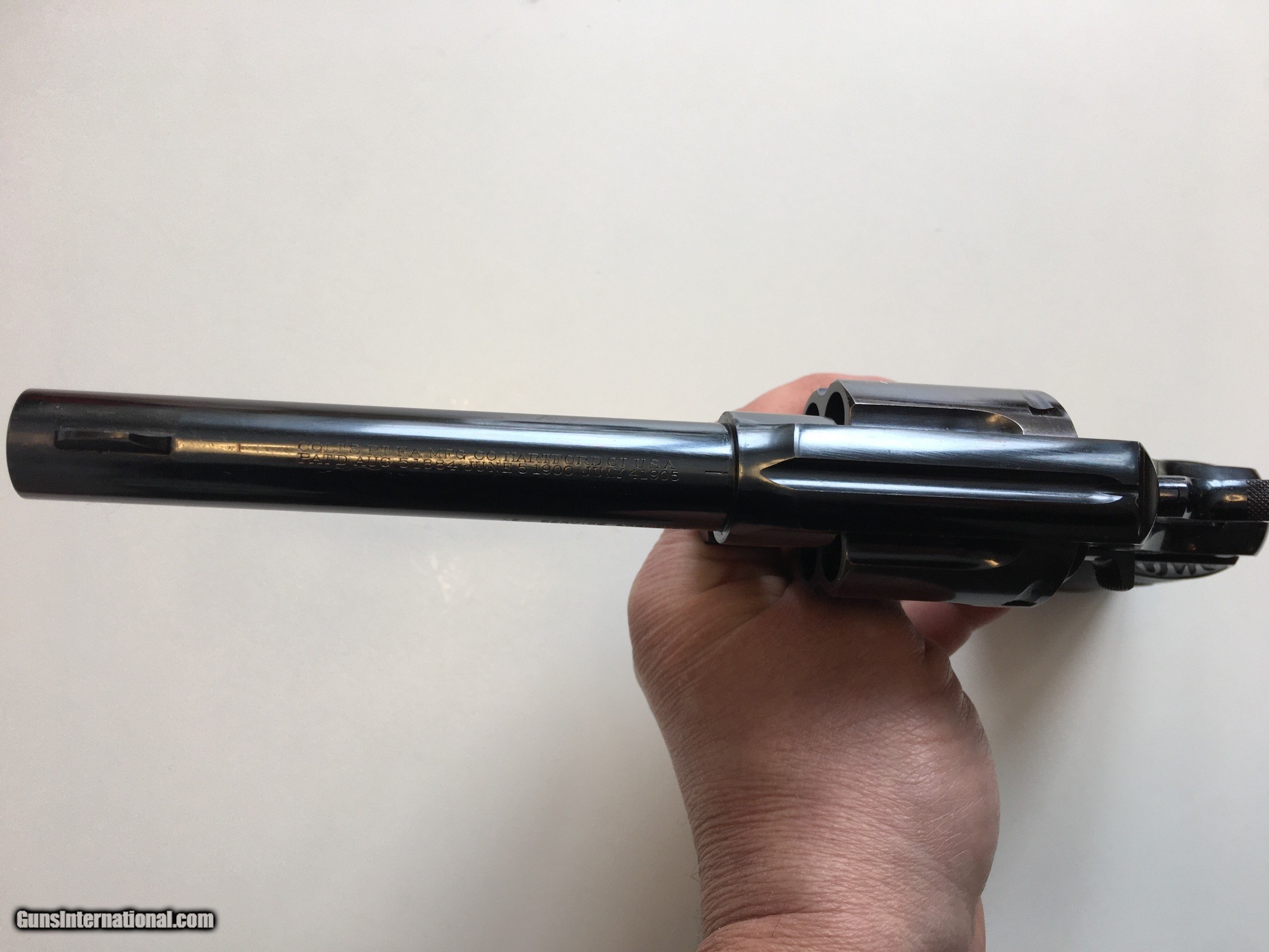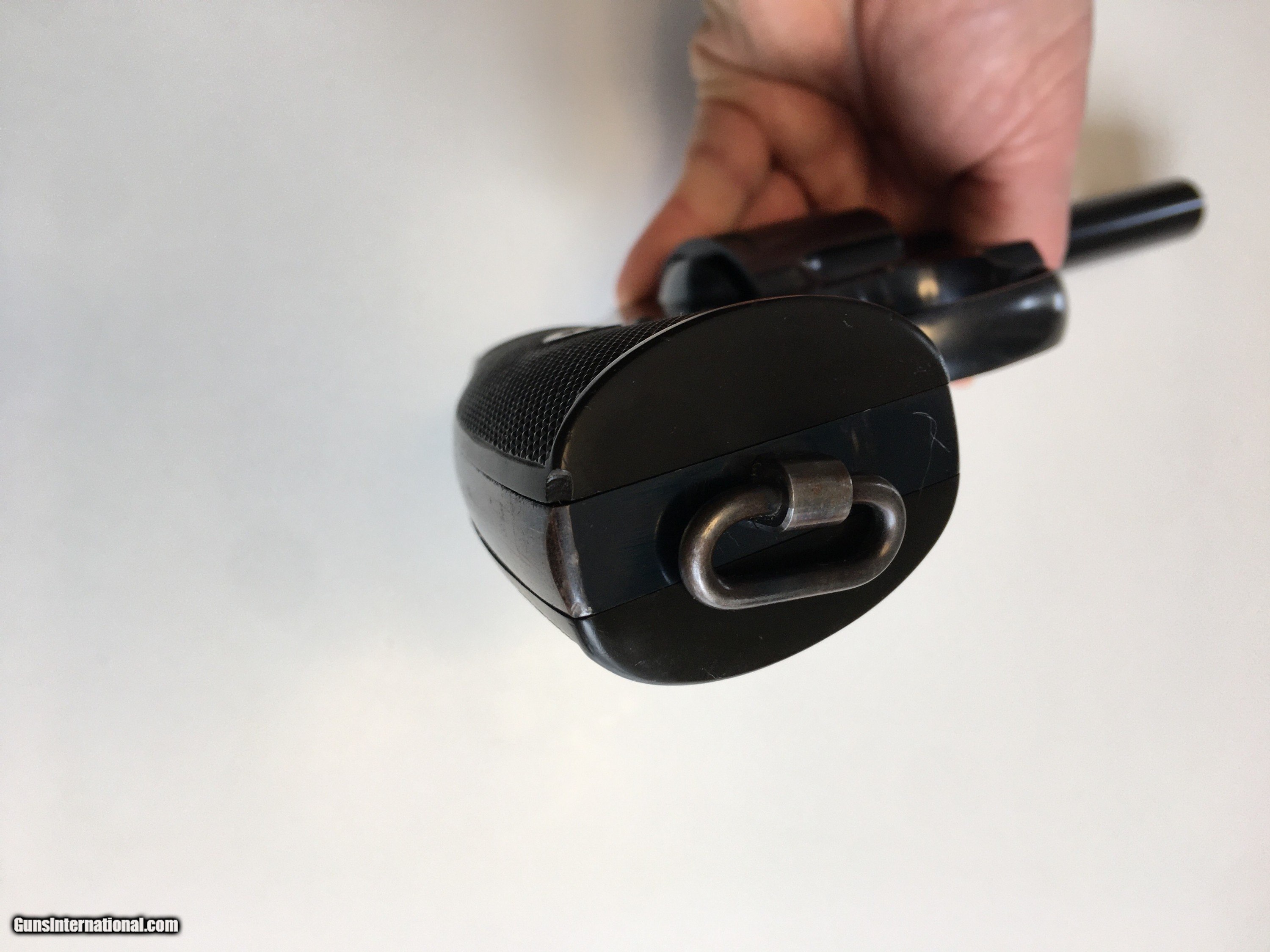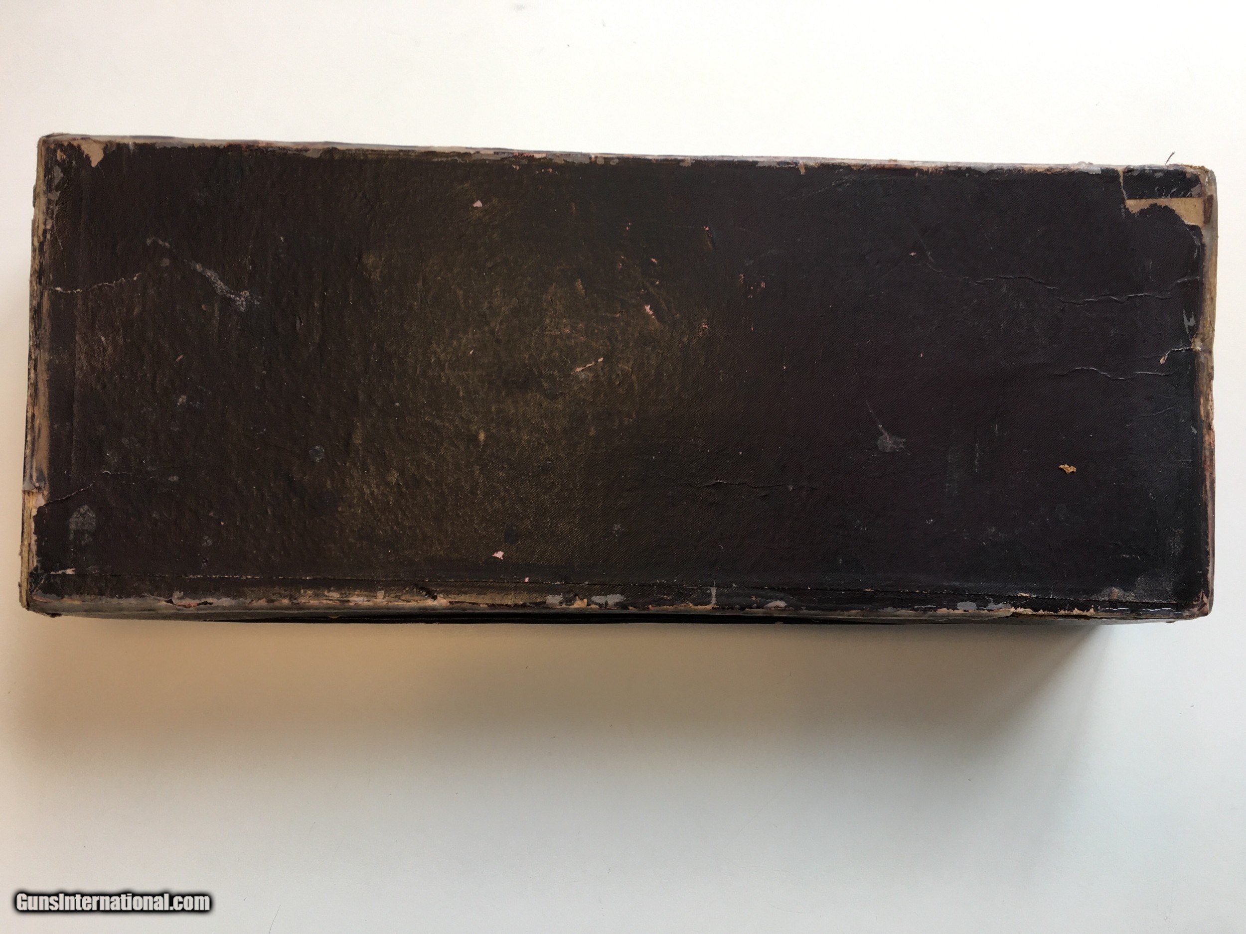 Description: This is probably one of the best examples of an early high polished large frame Colt New Service revolver, made in 1914 and chambered in .455 ELEY. The gun retains nearly all of its high luster original blueing with a couple of small rub marks and some toning/tiny scratches on the cylinder and toning on the rear grip strap. It comes with an original box with intact end label(I have not been able to find a comparable label box anywhere online), with some glue present here and there, but intact and in good shape overall. The factory letter from 2008 confirms shipment to Montreal in 1914. Bore and cylinder chambers are minty with very little evidence of firing the gun on the recoil shield. All the markings are sharp. Very nice grips with a tiny chip on one corner. These high polished guns are very difficult to photograph and the pictures really do not do it justice. Please ask if you would like me to take any other pictures of the gun. No import marks! FFL or C&R (where allowed). $30 shipping in CONUS. 3 day inspection. SOLD |