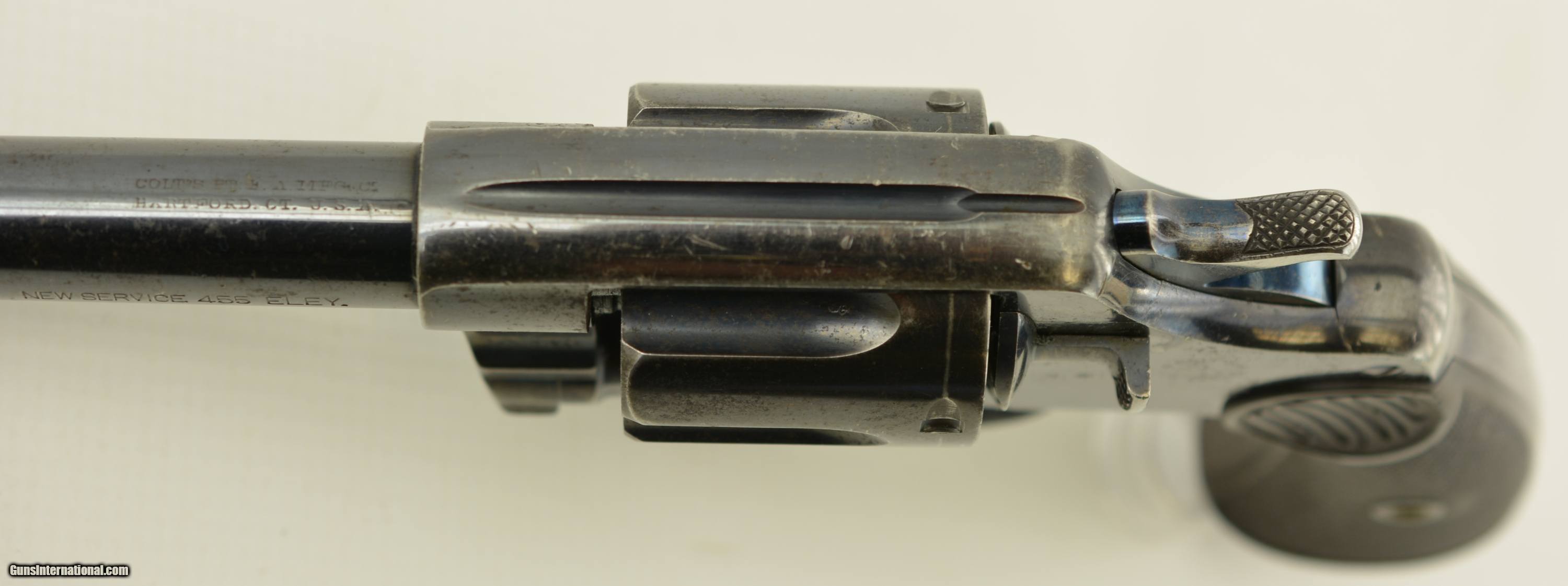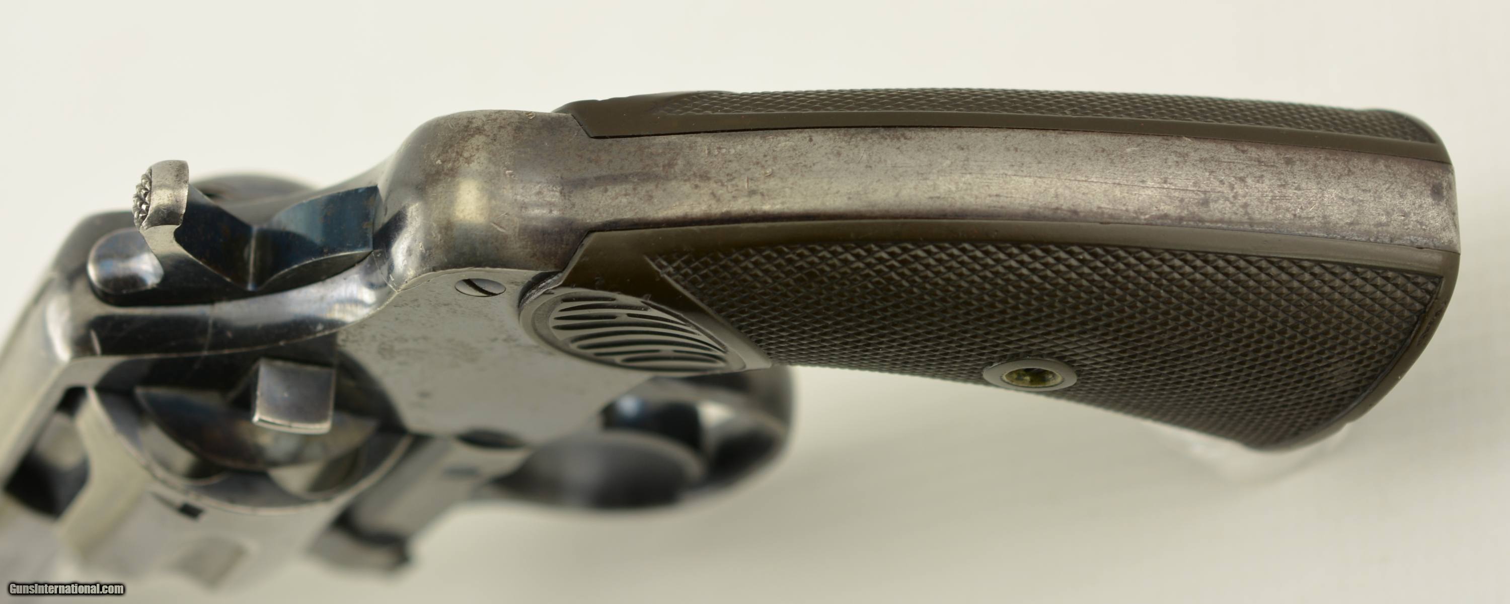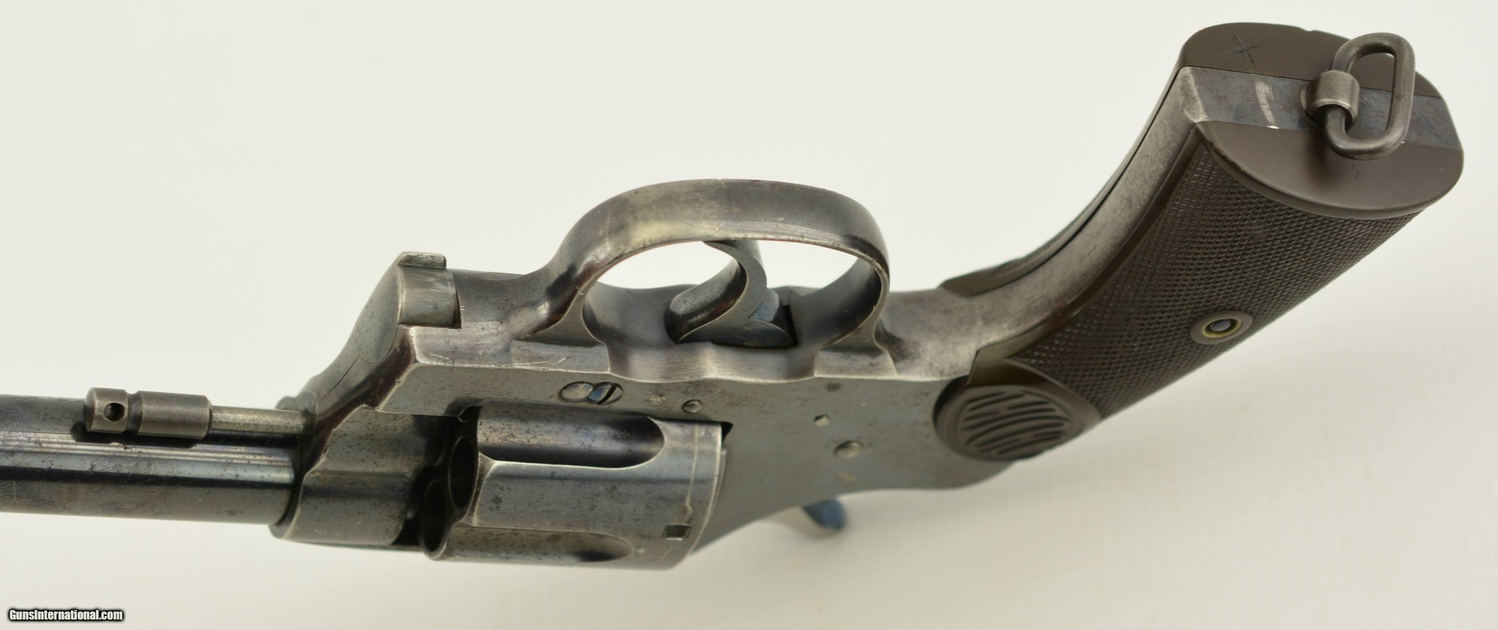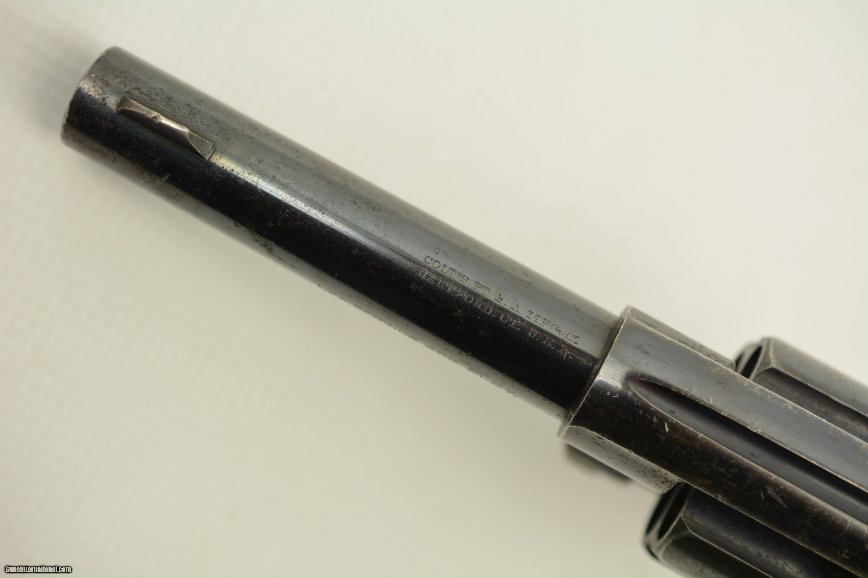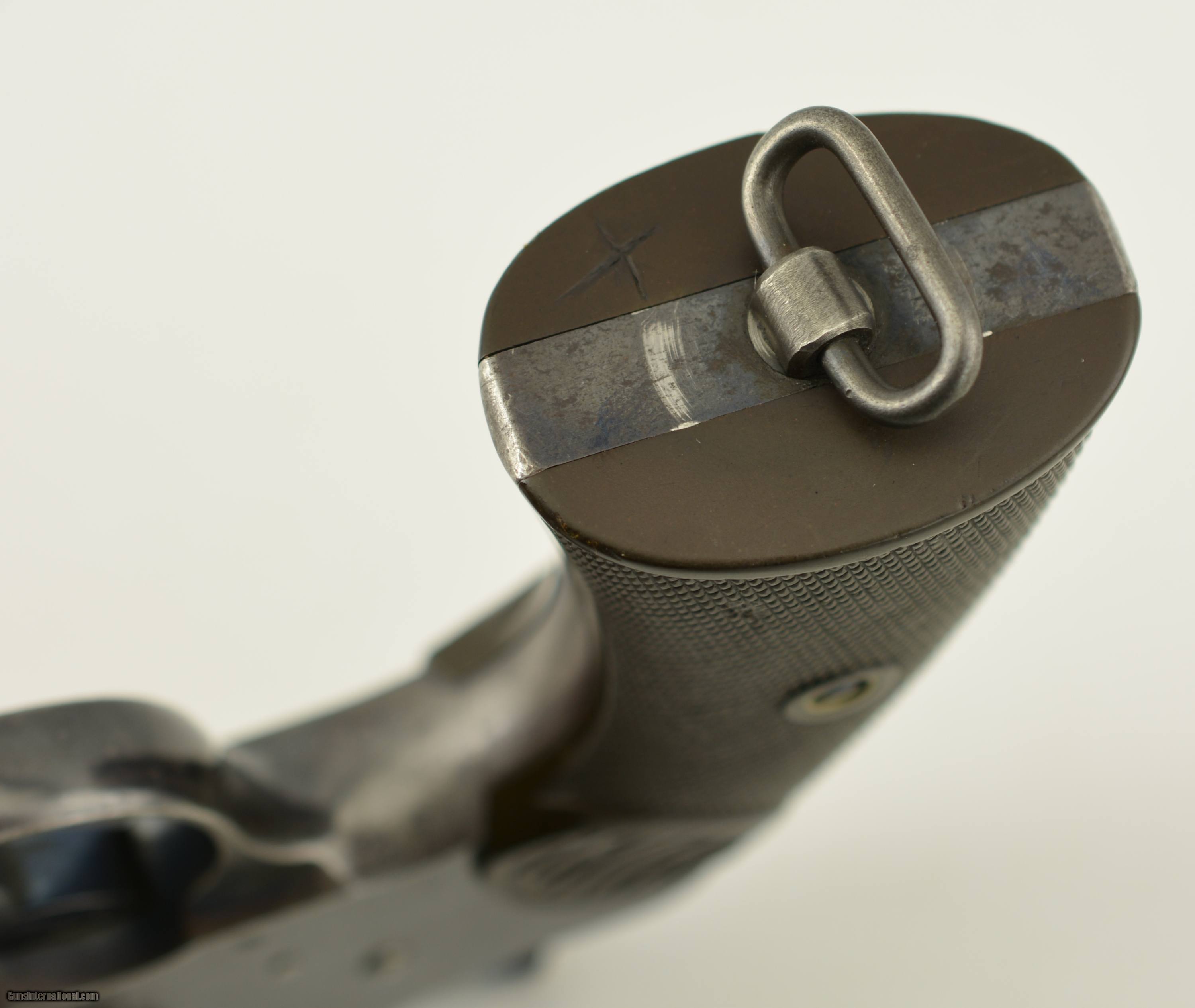 Description: Serial #1073, .45 Colt, 4 1/2" barrel with a very good, bright bore that has some dark freckling within the grooves. This London-proofed revolver was originally chambered in .455 Eley, but was rechambered to .45 Colt at some point. The revolver has correct early features: scalloped front sight, exposed crane stop, long ejector finial, and flat cylinder latch; along with the rarer 4 1/2" barrel length. The metal retains 80-85% of the original commercial quality blue with handling marks and gray fading from use on the muzzle, and along the high and exposed edges. The gripstraps have developed an overall freckled, pewter gray patina. The screws, hammer, and trigger have retained much of their original bright fire blue, with the balance turned to a bright patina overall. The revolver is accompanied by a 2008 dated Colt factory letter that lists a shipping date of March 27, 1899, as part of a 36 gun shipment to Colt’s London Agency. Presumably, the revolver was a private purchase for the Boer War, and rates very good-fine condition overall. FFL or C&R SOLD Curio/Relic: Yes Manufacturer: Colt Model: New Service Serial Number: 1073 Caliber Info: .45LC Gauge Info: .45LC |
