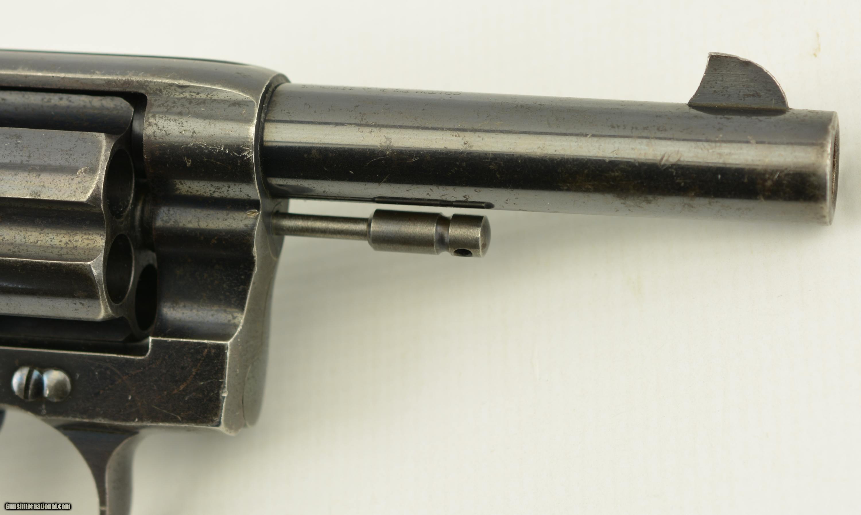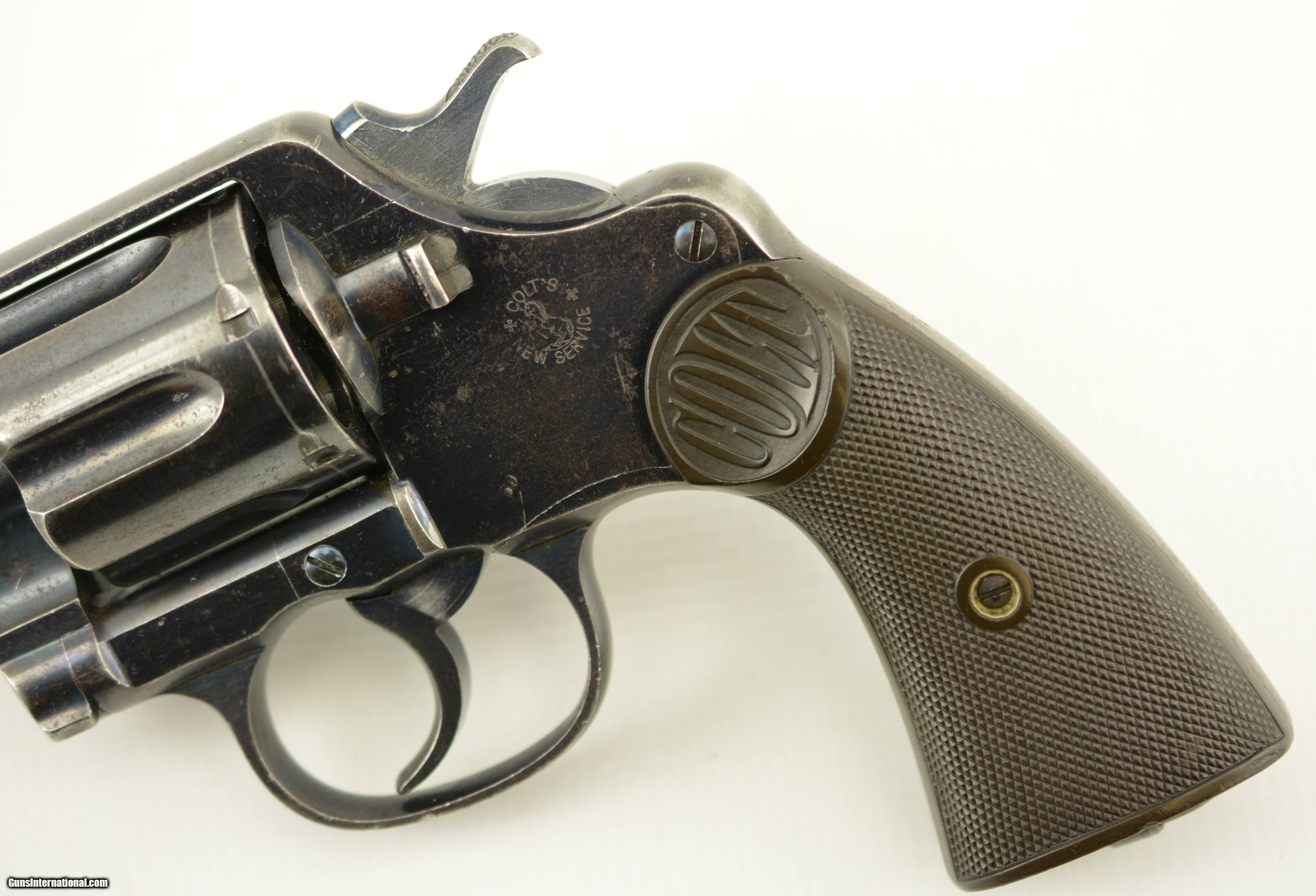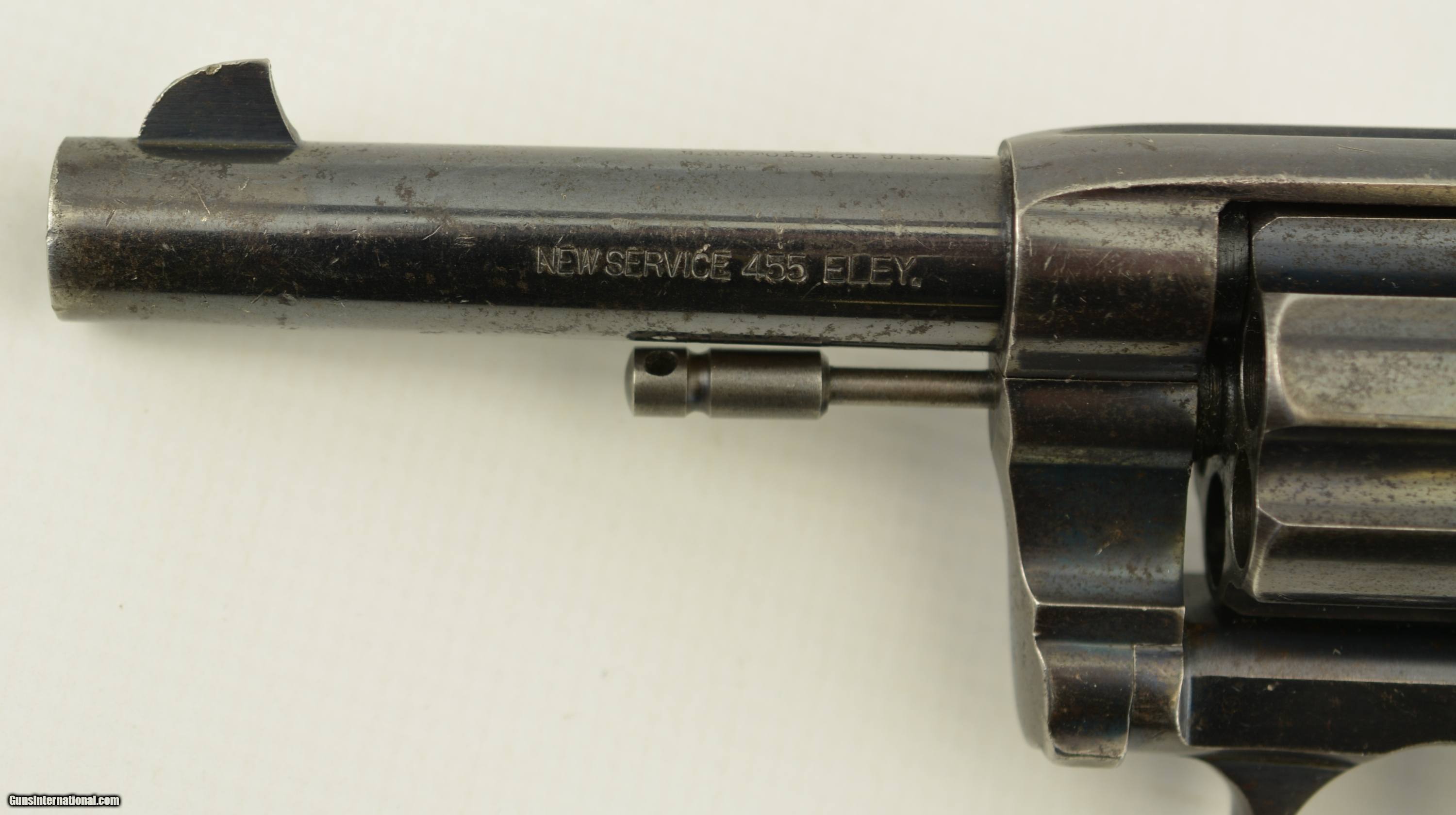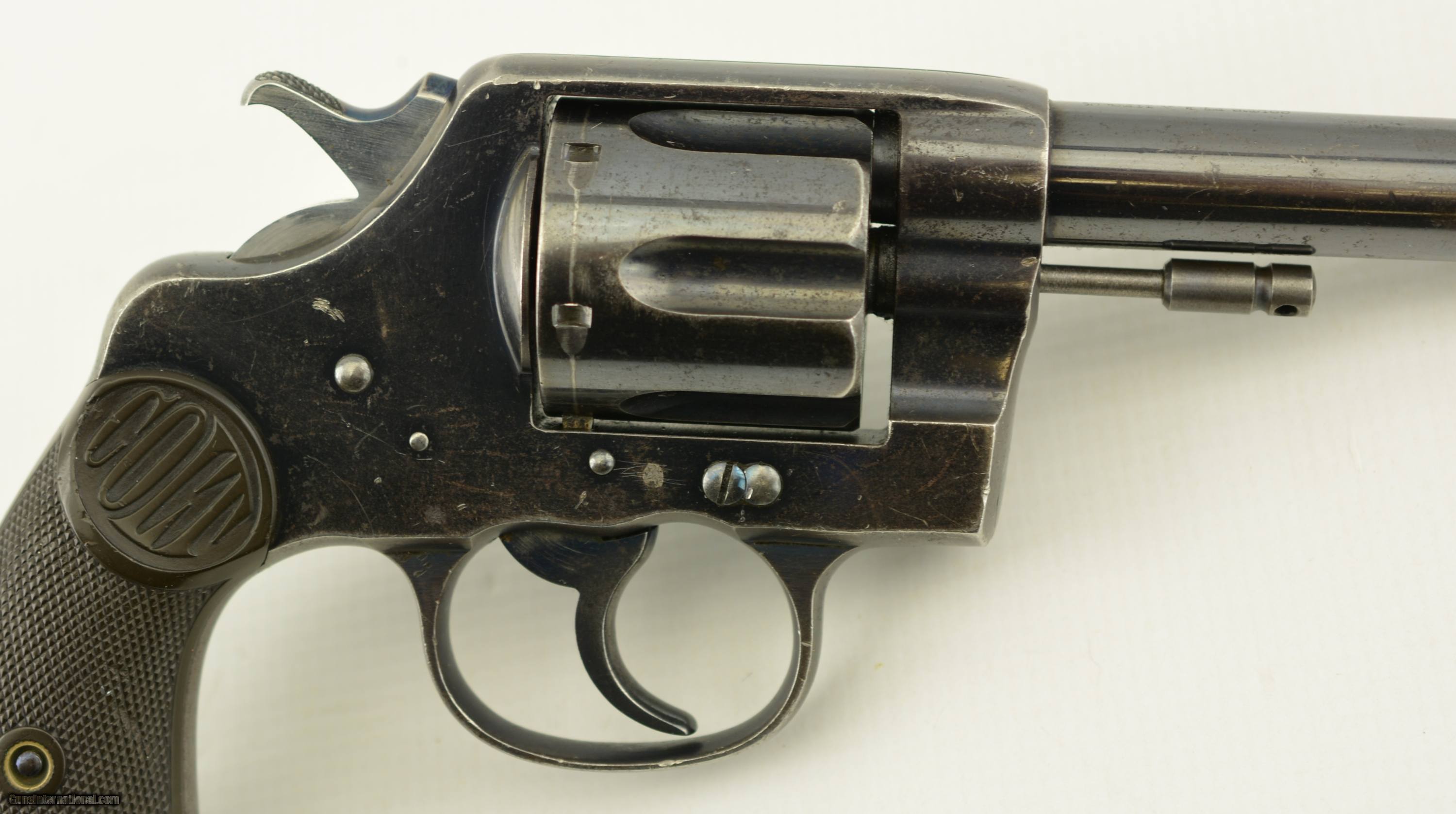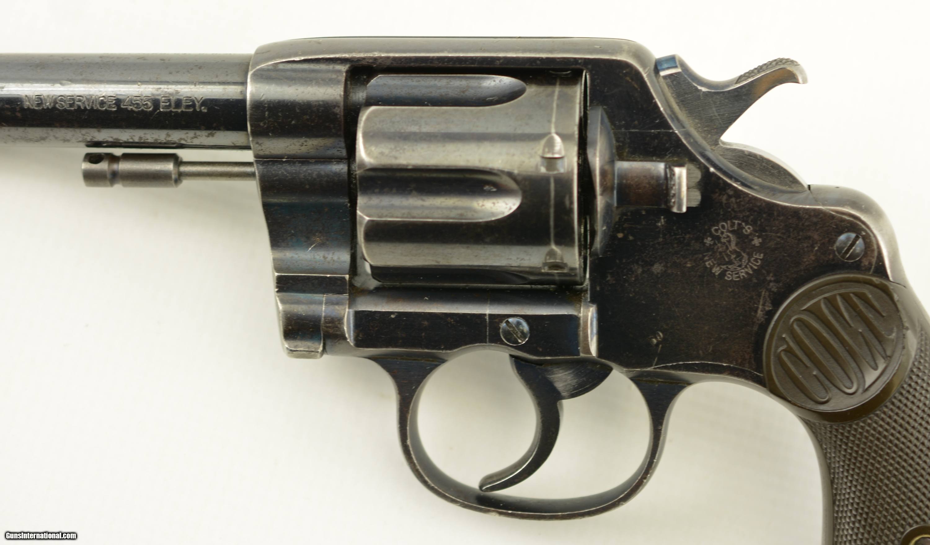 Description: Serial #1073, .45 Colt, 4 1/2" barrel with a very good, bright bore that has some dark freckling within the grooves. This London-proofed revolver was originally chambered in .455 Eley, but was rechambered to .45 Colt at some point. The revolver has correct early features: scalloped front sight, exposed crane stop, long ejector finial, and flat cylinder latch; along with the rarer 4 1/2" barrel length. The metal retains 80-85% of the original commercial quality blue with handling marks and gray fading from use on the muzzle, and along the high and exposed edges. The gripstraps have developed an overall freckled, pewter gray patina. The screws, hammer, and trigger have retained much of their original bright fire blue, with the balance turned to a bright patina overall. The revolver is accompanied by a 2008 dated Colt factory letter that lists a shipping date of March 27, 1899, as part of a 36 gun shipment to Colt’s London Agency. Presumably, the revolver was a private purchase for the Boer War, and rates very good-fine condition overall. FFL or C&R SOLD Curio/Relic: Yes Manufacturer: Colt Model: New Service Serial Number: 1073 Caliber Info: .45LC Gauge Info: .45LC |