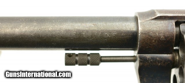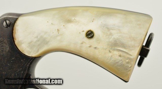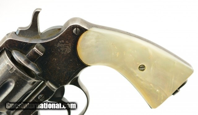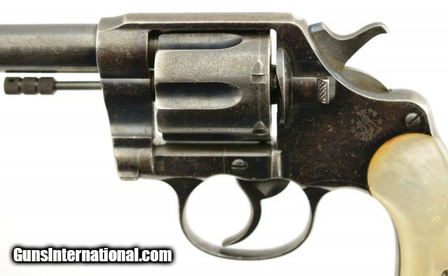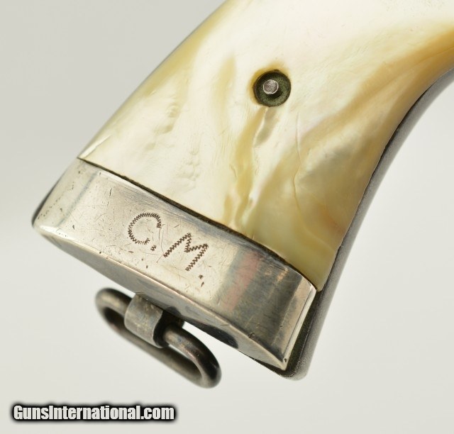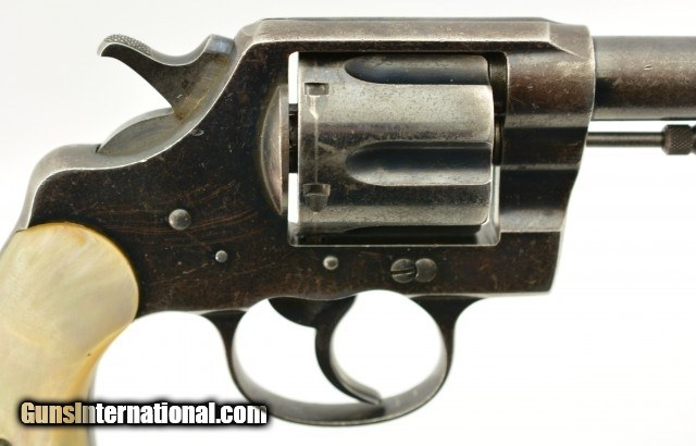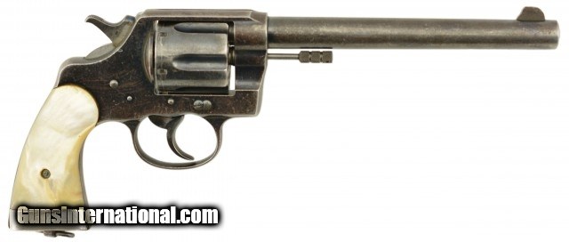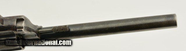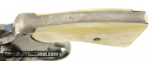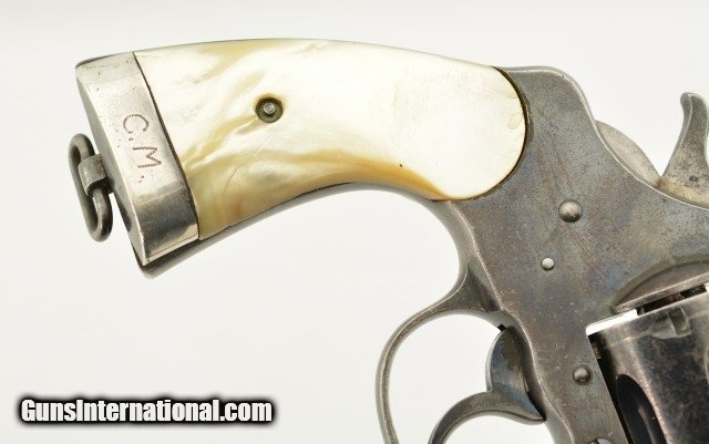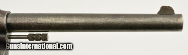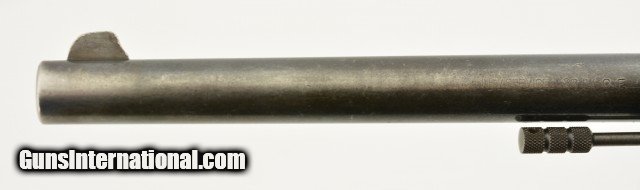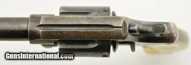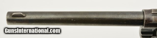 Description: Serial #18959, .38 WCF (.38-40), 7 1/2" barrel with a very good bore that has some freckling and mild pitting within the grooves. This is a 1907-made revolver that retains about 50-60% of the original bright blue finish with the balance faded to a mottled plum-brown or pewter gray patina. Thin pinprick pitting is also present on the face of the cylinder. The cylinder is also serial numbered to a different gun. The hammer and trigger have a good amount of the original, bright fire blue remaining, with the balance turned to lightly freckled gray. A large "S" stamp is present on the left side of the frame, just below the cylinder, and is repeated on the inside of the crane cut. The revolver is fitted with period, genuine mother-of-pearl grips that have a silver bolster on the right panel with a previous owner's initials engraved: "C.M." The grips are in very good condition, with mild age-toning on both panels, as well as some very minor chips and handling marks. The lock-up is tight, and the action functions flawlessly. This was a well-used, but well-looked after revolver that no doubt served its owner well, and is in about very good condition overall. FFL or C&R SOLD Curio/Relic: Yes |