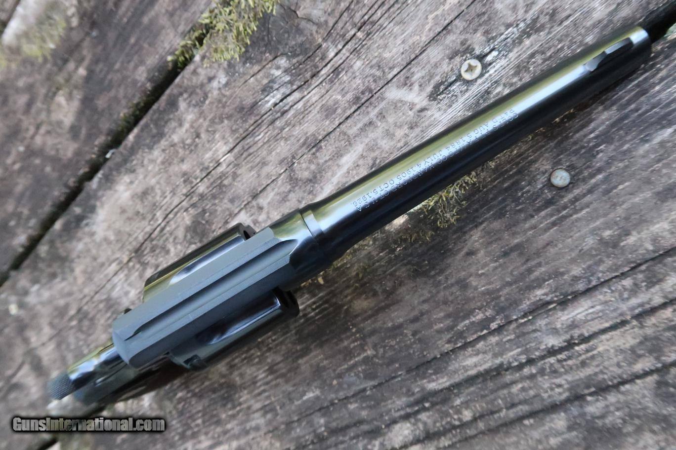 Description: Standard configuration Colt New Service, with 6" barrel, fixed sights, with two-line address and patent markings on top of the barrel, caliber markings on the left, "VP" and "4" on the trigger guard and the Rampant Colt on the sideplate. Fitted with checkered Colt medallion grips. Manufactured in 1937. A perfect companion to the commonly encountered "Shooting Master" in the same caliber, that was made during the same time frame. Synopsis: Beautiful Colt New Service, .38 Special, Wood Grips, Pre War. Condition: Excellent, with 98+% original blue finish, a spot on the right side of frame as carefully photographed. Extremely faint cylinder ring that does not break the finish. Comparable condition grips. Mirror bore. Perfect Manual Mechanics. ~~Insured shipping fee of $75; most packages shipped using FedEx 2nd Day.~~ SOLD Manufacturer: Colt Serial Number: 341258 Caliber Info: .38 Special |