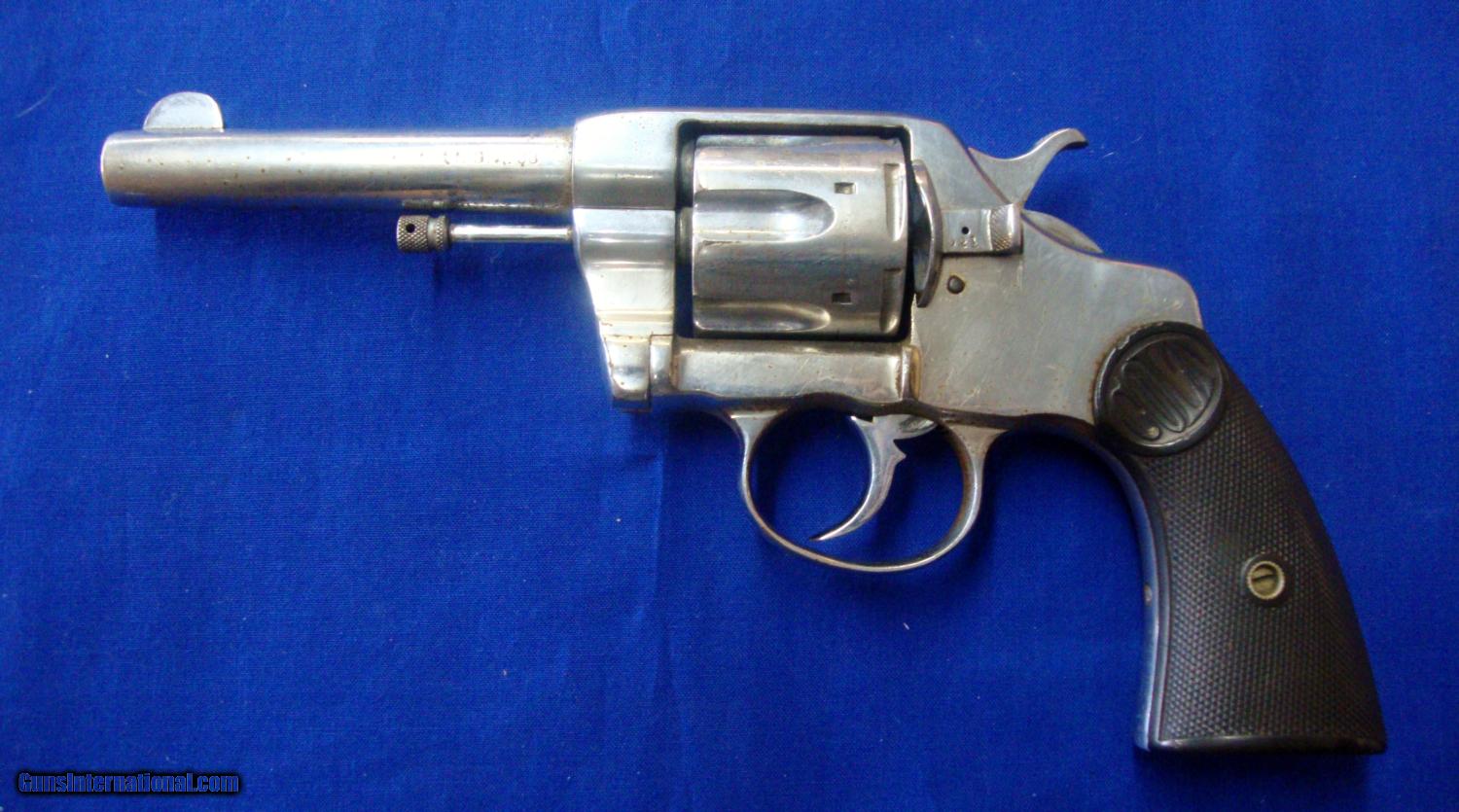 Description: Colt New Service .38 Special Manufactured in 1920, 4.5" barrel with standard sights Six round fluted cylinder Nickel frame and cylinder Colt rubber grips This gun has been re-nickeled SOLD |