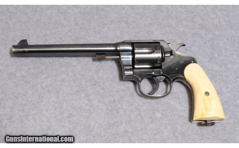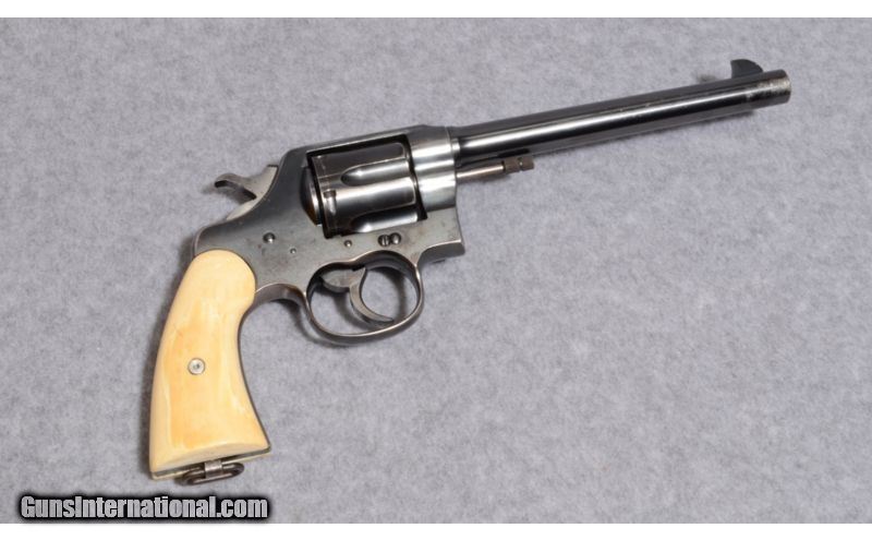 Description: The Colt New Service was introduced in 1898. It was an up-sized and strengthened Colt Model 1892 and Colt Firearms first large caliber revolver with a swing-out hand ejector cylinder. It was made in the popular large caliber revolver cartridges of the day: .38-40, .44-40, .44 Russian, .44 Special, .45 Colt, and .455 Webley. It was made with a blued finish or nickel plating, and with a 4", 4½", 5", 5½", 6", and 7½" barrels. It also came with walnut or hard rubber grips. SOLD Curio/Relic: Yes Manufacturer: 1920 Caliber Info: .44-40 Metal Condition: Excellent Wood Condition: Excellent Bore Condition: Excellent Barrels: 7 1/2 Stock: Ivory Grips Weight: 46 ozs. Sights: Fixed Item Location: Tulalip, WA |