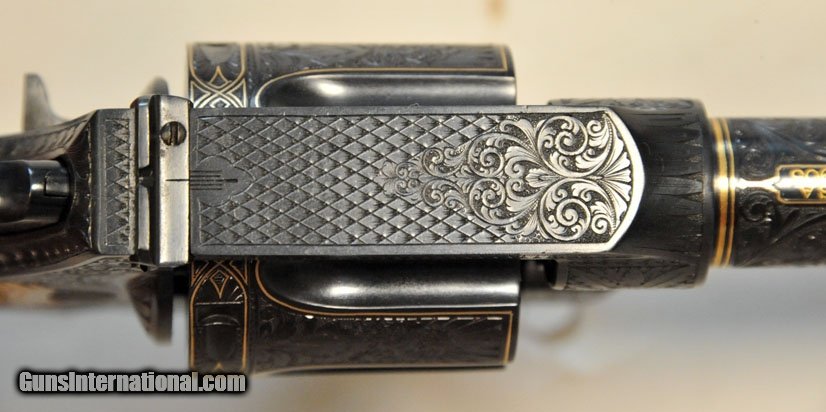 Description: Colt New Service Ser. No. 83312. .45 Colt- 7 1/2" barrel built in 1915. Completely engraved and gold inlaid by John Warren in the mid 20th century. Complete scroll coverage with gold line work on the barrel, cylinder and trigger bow. Inlaid elk on the left frame and eagle on the right frame in three colors of gold. Grips are checkered and carved by Mr. Warren and work is signed by him on the bottom of the grip frame. The very best of the best by one of America's greatest artisans. SOLD Curio/Relic: Yes |