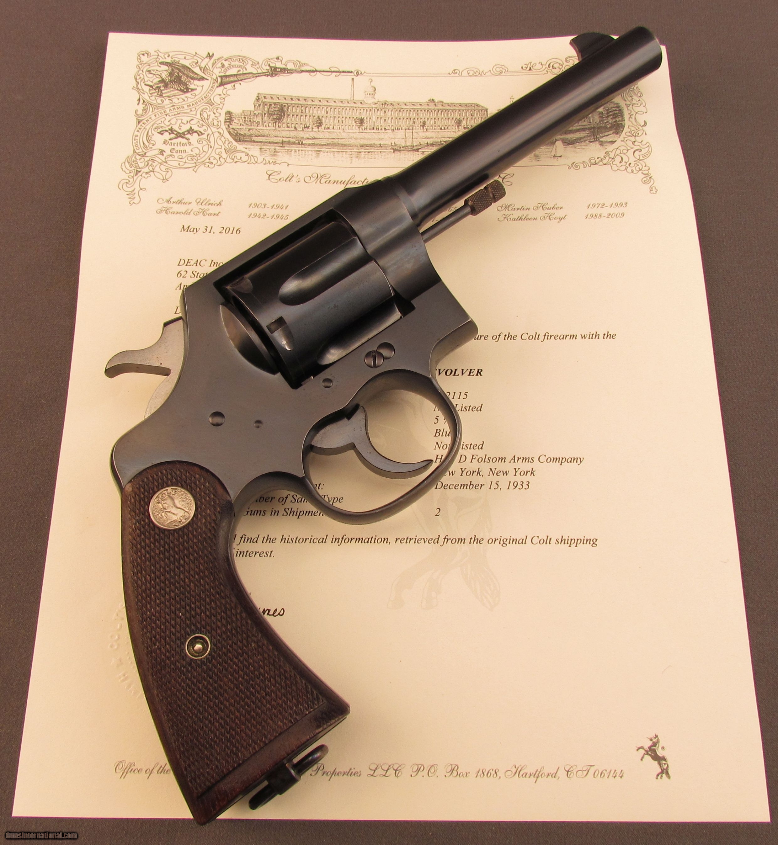 Description: Serial #332115, .45 Colt, 5 1/2” barrel with an excellent, bright bore. This is a handsome revolver that retains nearly all of the original blue finish with only some negligible silvering at the muzzle and along some of the high edges and projections. Despite that, the only real finish loss is a mild turn-ring on the cylinder. The hammer and checkered trigger have virtually all of their original bright blue remaining, and the original checkered walnut, Colt medallion grips are also in excellent condition with only some minor flattening of the points on either side. The lock-up is tight and the action functions flawlessly. The revolver is accompanied by a 2016 dated Colt Factory Letter that lists a ship date of December 15, 1933, to H&D Folsom Arms Co. of New York, NY as half of a two gun shipment. This is a fantastic, almost unused New Service in excellent condition. FFL or C&R SOLD Curio/Relic: Yes Manufacturer: Colt Model: New Service Serial Number: 332115 Caliber Info: .45LC Gauge Info: .45LC |
