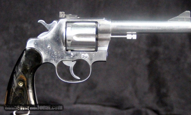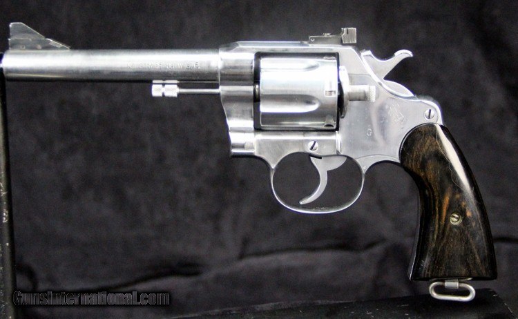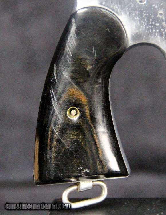 Description: .38wcf, #59591, 5 1/2 inch barrel, buffed metal finish, 2 piece custom (coco bolo?), target sights added, extremely smooth tuned action, "G" staamped on left side of frame, 1913 manufacture. Condition: bright strong bore with pin prick oxidation, metal surfaces have been buffed bright, grips are excellent, marks are very good, excellent mechanically. SOLD Curio/Relic: Yes |