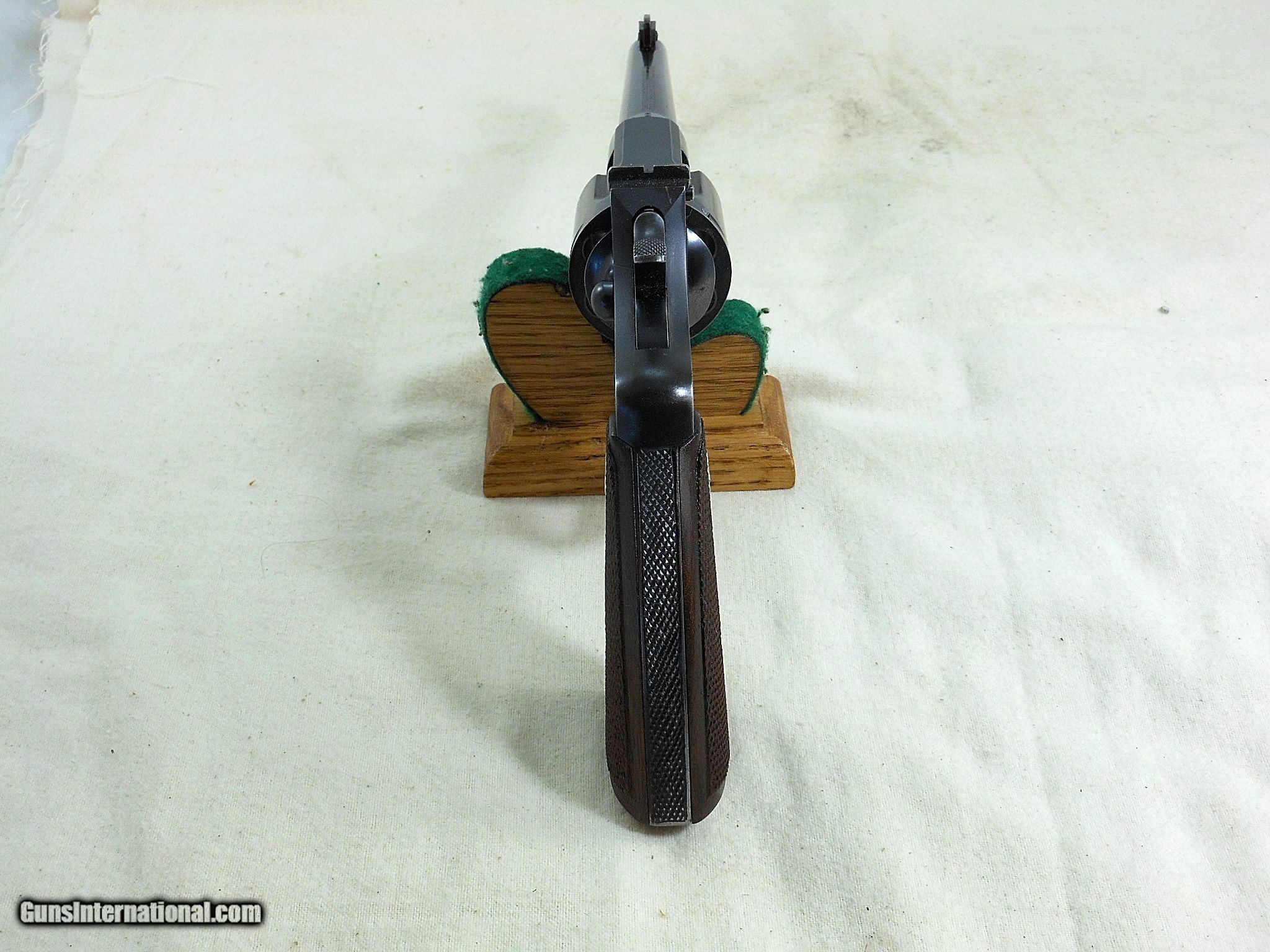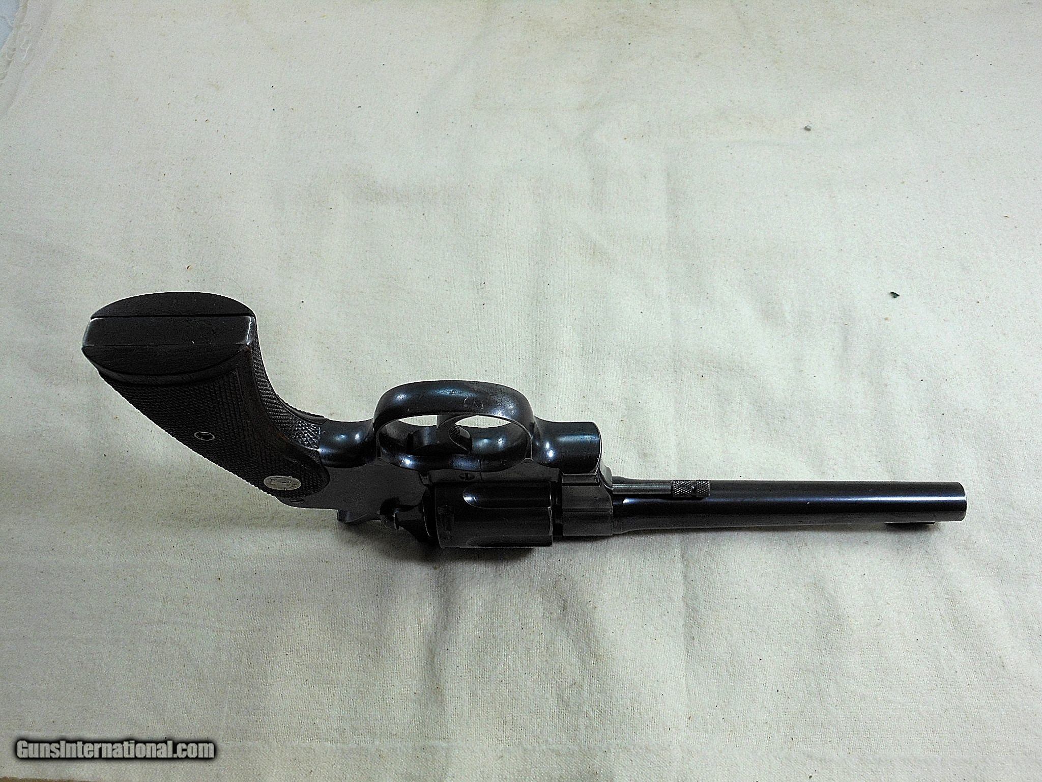 Description: This Colt was produced in 1940. The pistol's serial number is 342042. It has the standard 6 inch barrel. It is chambered for the then new 357 Magnum cartridge. The special order requests on this pistol is stated on the factory letter. It is furnished with a round front sight and a 3 pound trigger pull as special features. It was sent to the Buckeye Cycle Co. Akron Ohio February 19th 1940. This Colt shows light holster use and wear. The cylinder locks up tight with no play. The action works smoothly as you would expect for this model. The pistol shows light shooting wear. The original bluing shows some thinning on the right side plate. Overall, the bluing would rate a 94% condition. The Colt grips are in fine condition. The checkering is sharp with no flattened points. This is a rare Shooting Master as chambered for the 357 Magnum. Most of these Shooting Master's were chambered for the 38 Special cartridge. The special order requests as stated in the factory letter is also a rare feature seldom seen ordered on this model. This is a very fine Shooting Master with rare features complete with the factory letter. This Colt certainly is in the collectors range of highly collectable Colts! Being a Shooting Master, one of the finest revolvers ever built by Colt certainly is a big plus! Search for hlvfineguns on google for more details. Curio&Relic J.M.C. Consn. (11) F. No. 422 -18 SOLD Curio/Relic: Yes Manufacturer: Colt Model: Shooting Master Serial Number: 342042 Caliber Info: 357 Magnum Bore: Very fine Chambers: Very Fine Condition: 94% Overall Wood Condition: Very Fine Bore Condition: Bright With No Issues Barrels: 6 Inch Barrel Type: Target Action: Double Action Finish: Blued Sights: Target Manufacture Date: 1940 Extras: Factory Letter |