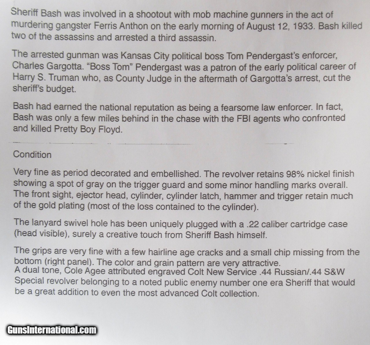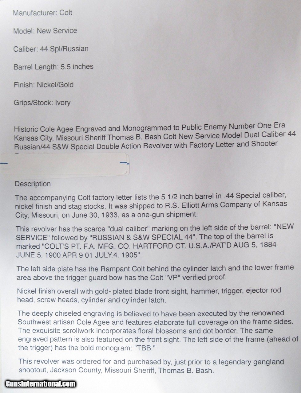 Description: Colt New Service Revolver; Serial No. 328855; See Accompanying Factor Letter and Description; Cole Agee Engraved; Gold and Nickel Finish; Ivory Grips; Made for Jackson County, Missouri Sheriff Thomas B. Bash; His Initials are Engraved on Left Side of Frame Just Below Serial No.; Many Documents Included; See All Photos for Condition; No Texts; Call (254)541-5765 or Email Only; PERSONAL PROPERTY of Harold Wieser; Price: $24,975 + $45 S&H Via USPS PRIORITY MAIL; Payment Address: Harold Wieser - 1466 U.S. Hwy 77 - Rosebud, TX 76570; SEND PAYMENTS VIA USPS PRIORITY MAIL; BEWARE of SCAMS!!! – DO NOT SEND MONEY or CORRESPONDENTS ELECTRONICALLY UNLESS YOU HAVE SPOKEN to HAROLD WIESER FIRST! 254-541-5765 SOLD Manufacturer: Colt Model: New Service Serial Number: 328855 |