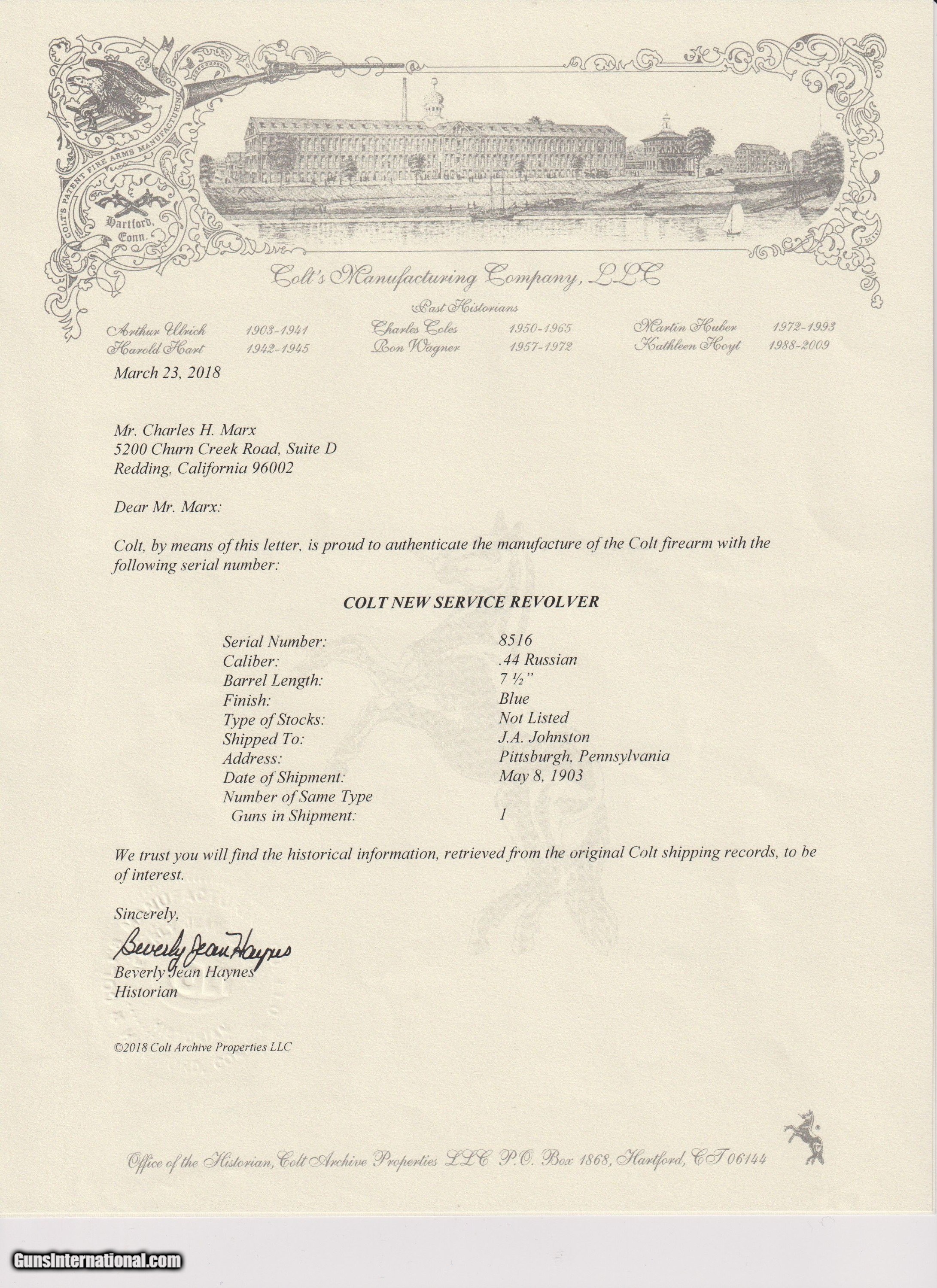 Description: LETTERED 1903 mfr. COLT “NEW SERVICE” .44 Russian DA SIX-SHOT Revolver C&R DESIRABLE SCARCE CALIBER Large Frame Revolver Here Ancestry Guns presents a C&R Factory Lettered Colt “New Service” Model Double Action Revolver chambered in the scarce .44 Russian Caliber, made in 1903 in Hartford, Connecticut. This revolver was conceived to be a serious workhorse for the military, police, and anyone who wanted a large double action revolver in a variety calibers. The U.S. Military would go on to adopt versions that would be known as the Model 1909 and the Model 1917 for the Marines and the Army. Other chamberings that were available throughout the period of manufacture (1898-1946) were .38-40 WCF, .44 Russian, .44-40 WCF, .44 Special, .45 Long Colt, .455 Webley (Eley), and later .45 ACP, .38 Special, .357 Magnum, along with other less common calibers. They would see use in the Spanish American War, the World Wars, and even the Vietnam War. The included factory letter confirms the current configuration, grips not listed, and shipment to J.A. Johnston in Pittsburgh, Pennsylvania on May 8, 1903, as a single gun shipment. After making historical searches, period newspapers appear to show multiple possible matches for J.A. Johnston in Pennsylvania at the time. The overall condition is fine. Original blue finish is preserved. The action is excellent. Shiny bright bore with strong rifling. Fine grips. Markings are clear. Visible numbers match. Own the original! This firearm is classified as a Curio & Relic. Barrel is 7-1/2 inches. Caliber: .44 Russian Overall condition as seen in photos. Very Fast. Very Safe. FREE SHIPPING. Will need to be sent to your local FFL or C&R licensee. This firearm is classified as a Curio & Relic. Guaranteed AUTHENTIC & Includes CERTIFICATE OF AUTHENTICITY. $4800 #259682 Curio/Relic: Yes Price: $4,800.00 Buy Now Pay with