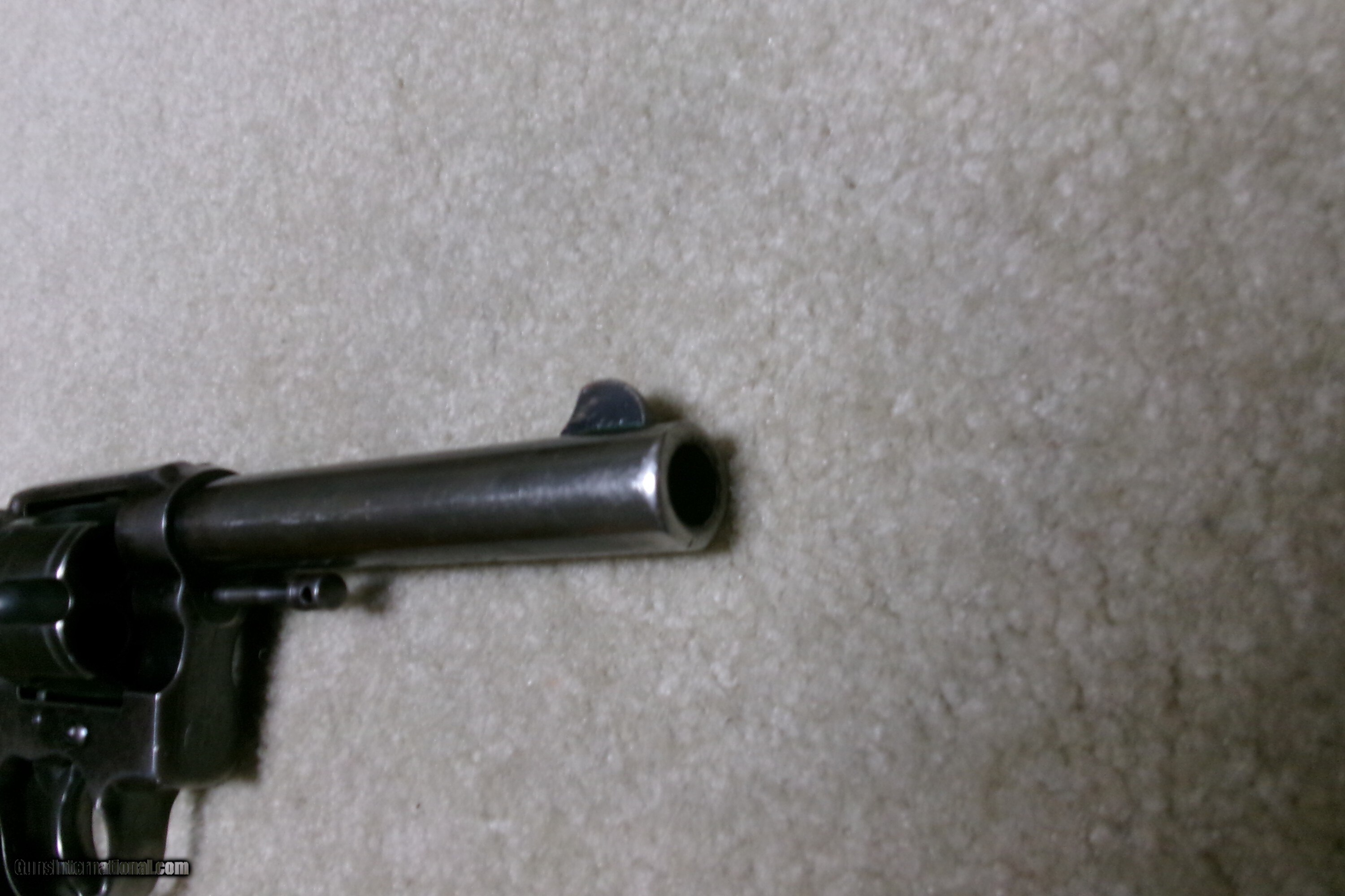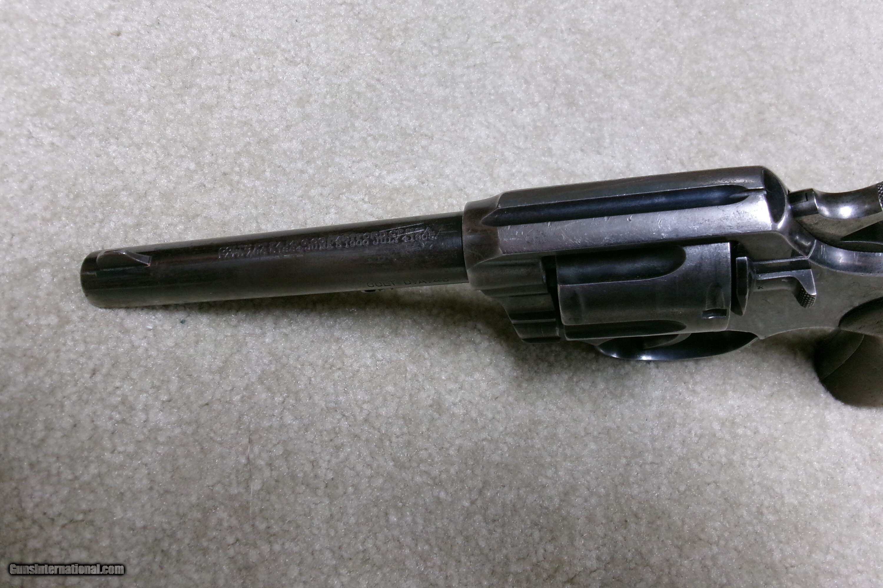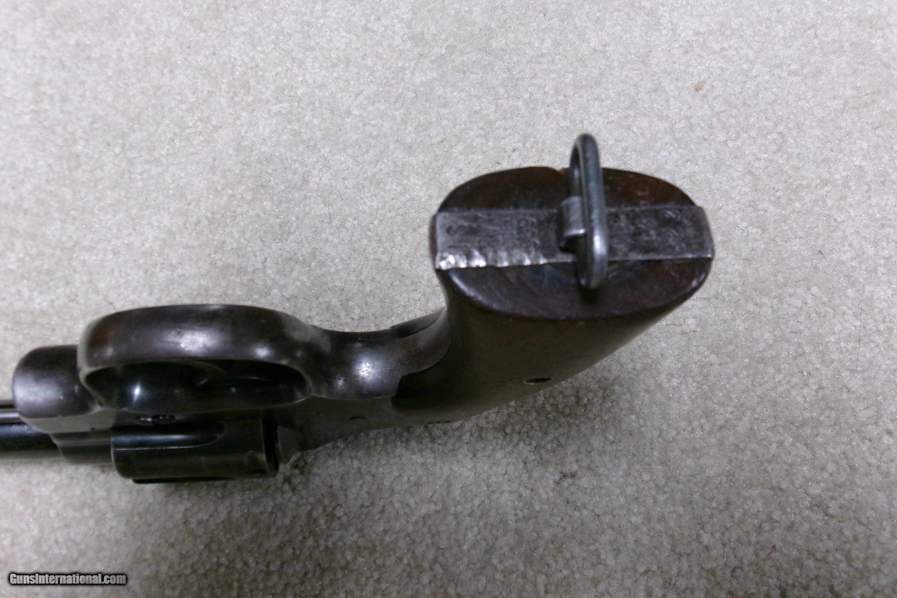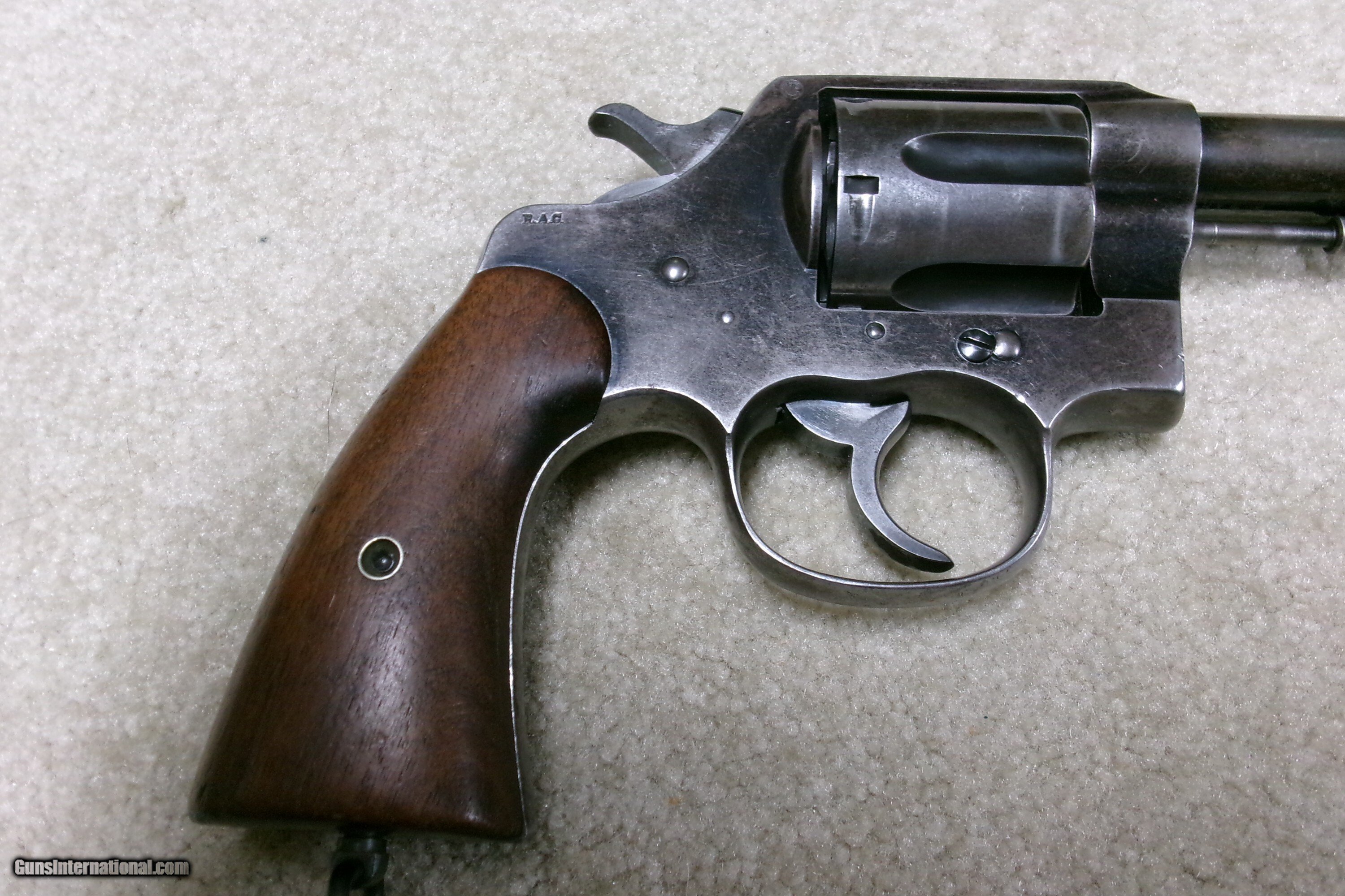 Description: MODEL 1909 U. S. ARMY .45 COLT NEW SERVICE REVOLVER, #43XXX. This was the last of the .45 Colt revolvers issued to our armed forces. It was replaced with the famed M-1911 .45ACP auto pistol soon after being introduced. Many, if not most, saw service in the Philippine Islands after the Spanish American War which lasted until 1915 as the Filipino-American War. This example was obviously issued and used, but cared for. The blue shows wear on the barrel sides and grip straps. The cylinder blue is thinning and stronger in the flutes. Frame shows good high polish blue with normal holster wear areas. All sharp markings, correct government inspector stamps including the RAC stamping on cylinder, frame and barrel. The barrel retains the important “UNITED STATES PROPERTY” stamping on the bottom- this marking often ground off. Fine walnut grips, lanyard ring intact, front sight has not been altered or filed. Fine correct U.S. Army 1909 markings on the butt with matching serial number to frame. Butt shows some dings. Mechanically extremely tight with no cylinder play. Exc. bright bore. Curio/Relic: Yes Handgun Caliber: .45 Colt Manufacturer: COLT Model: 1909 U.S. ARMY Serial Number: 43XXX Barrel Length: 5 Condition: VG Bore Condition: EXCELLENT Price: $1,350.00 Contact Seller |