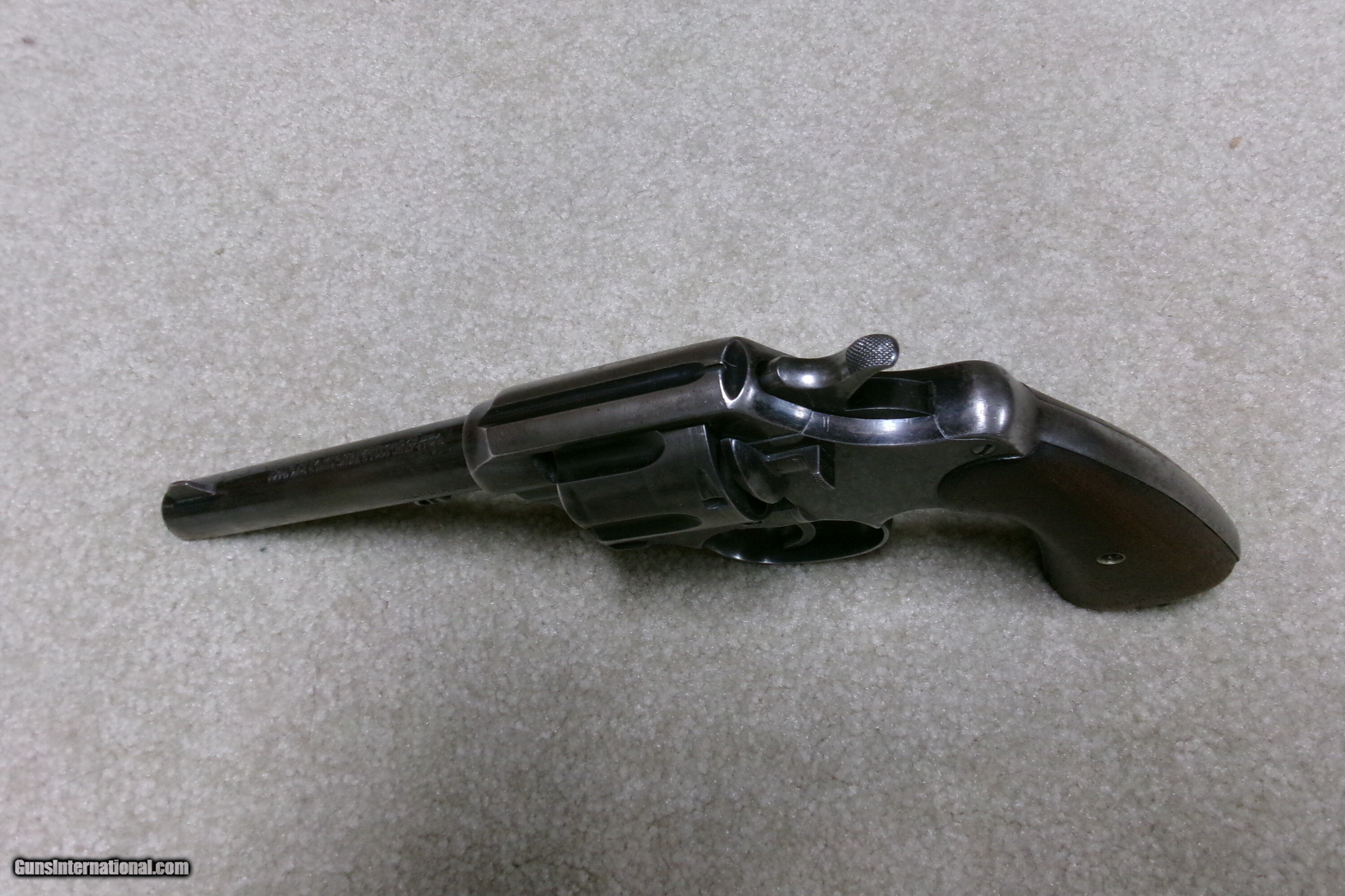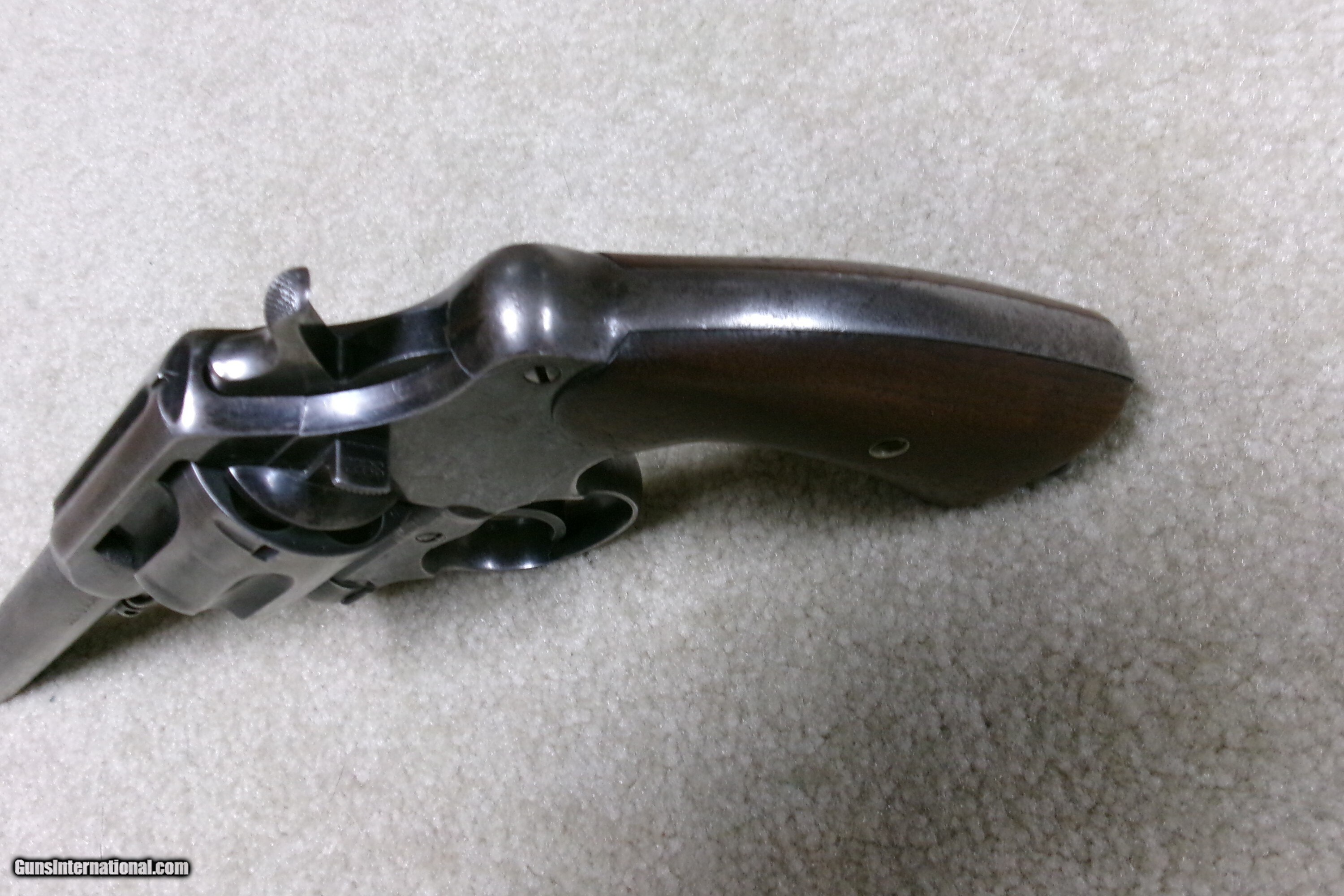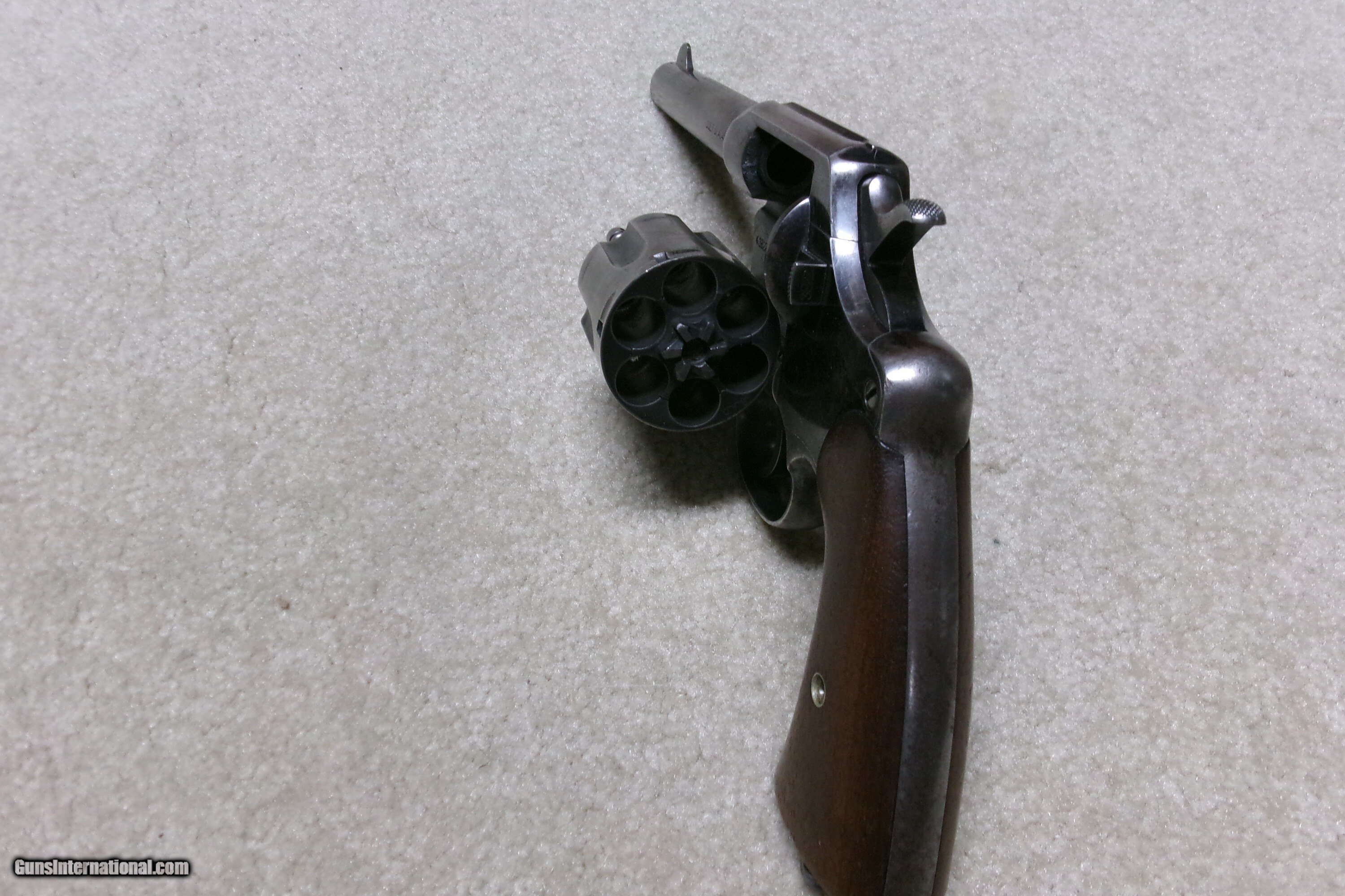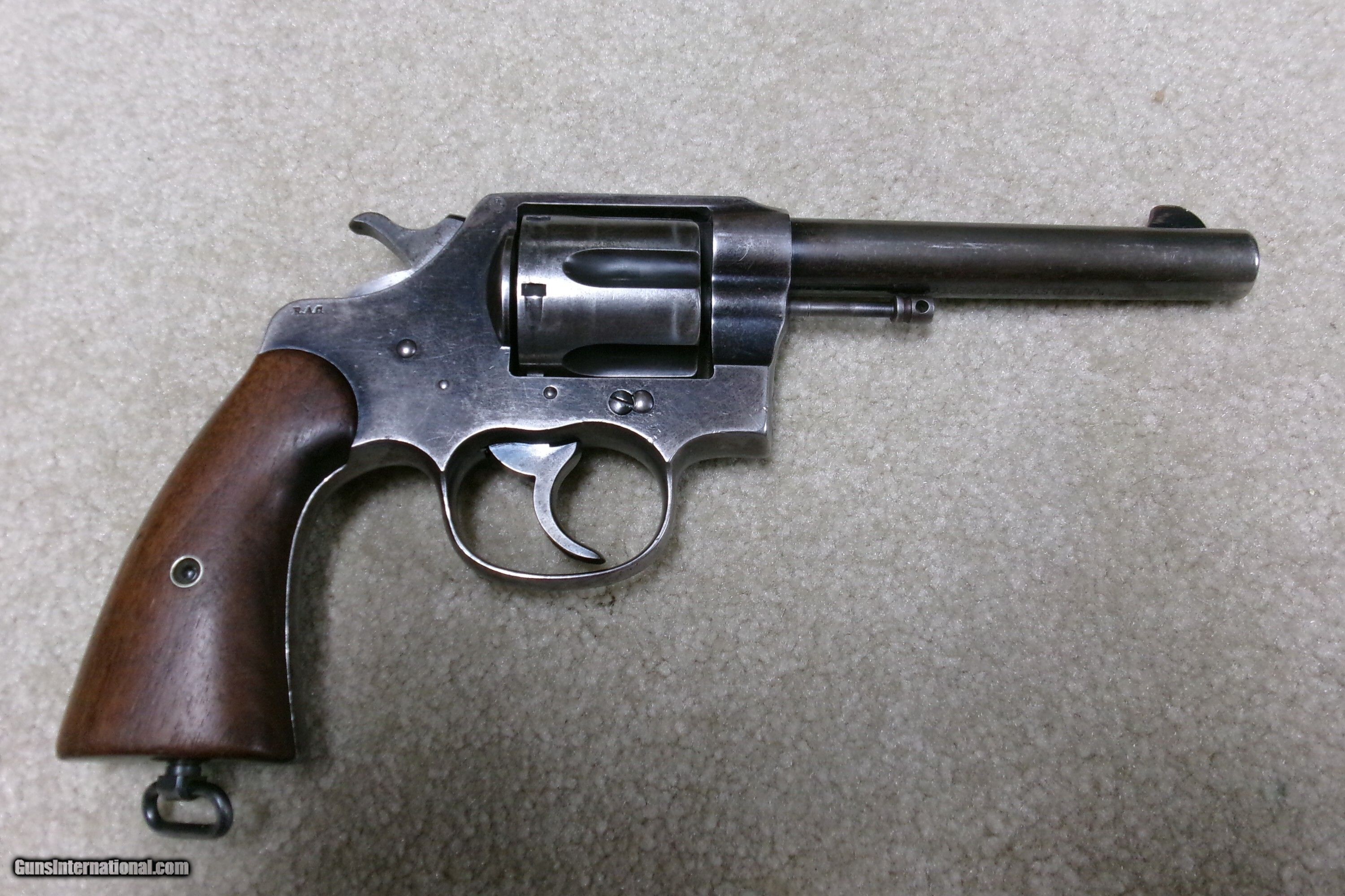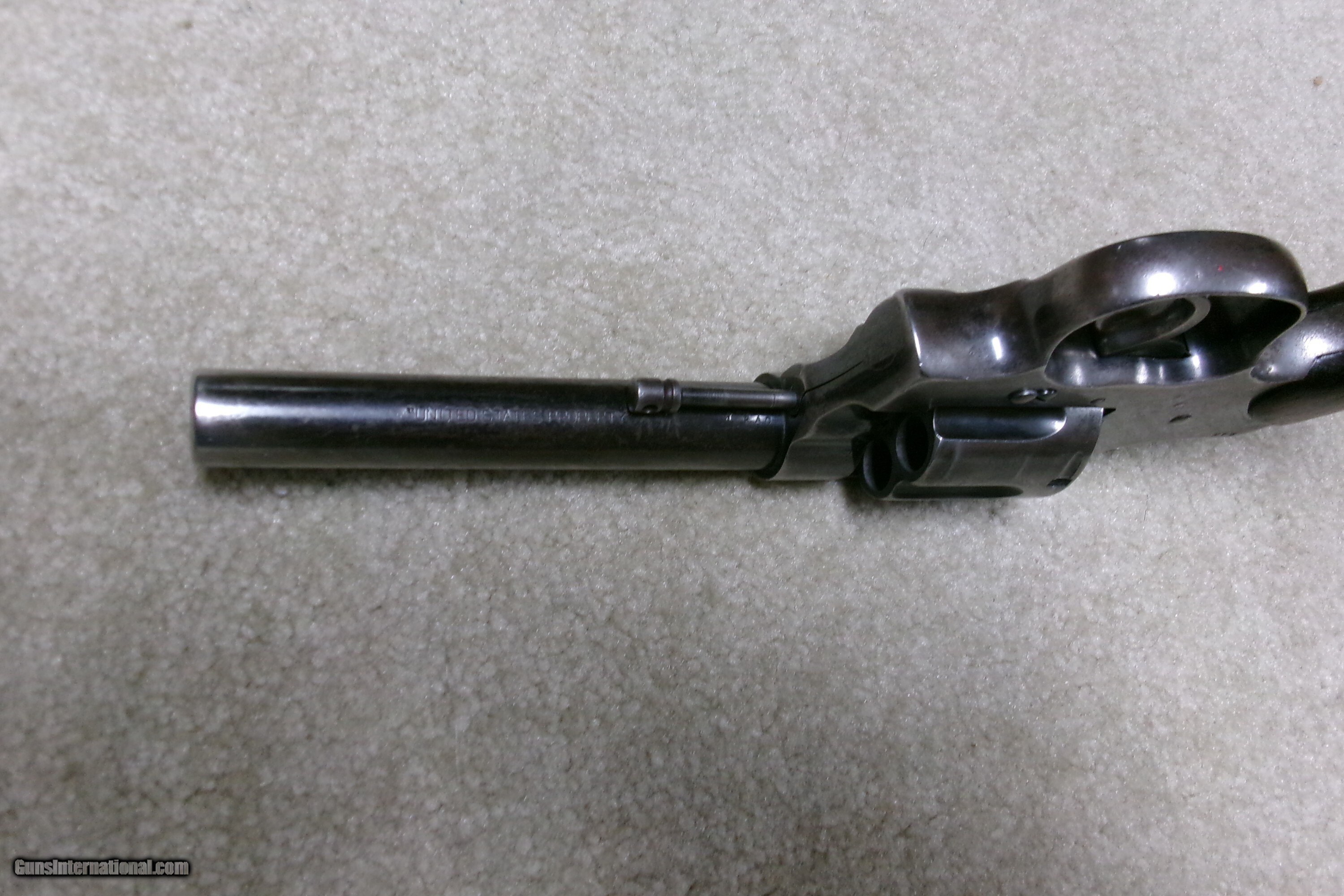 Description: MODEL 1909 U. S. ARMY .45 COLT NEW SERVICE REVOLVER, #43XXX. This was the last of the .45 Colt revolvers issued to our armed forces. It was replaced with the famed M-1911 .45ACP auto pistol soon after being introduced. Many, if not most, saw service in the Philippine Islands after the Spanish American War which lasted until 1915 as the Filipino-American War. This example was obviously issued and used, but cared for. The blue shows wear on the barrel sides and grip straps. The cylinder blue is thinning and stronger in the flutes. Frame shows good high polish blue with normal holster wear areas. All sharp markings, correct government inspector stamps including the RAC stamping on cylinder, frame and barrel. The barrel retains the important “UNITED STATES PROPERTY” stamping on the bottom- this marking often ground off. Fine walnut grips, lanyard ring intact, front sight has not been altered or filed. Fine correct U.S. Army 1909 markings on the butt with matching serial number to frame. Butt shows some dings. Mechanically extremely tight with no cylinder play. Exc. bright bore. Curio/Relic: Yes Handgun Caliber: .45 Colt Manufacturer: COLT Model: 1909 U.S. ARMY Serial Number: 43XXX Barrel Length: 5 Condition: VG Bore Condition: EXCELLENT Price: $1,350.00 Contact Seller |