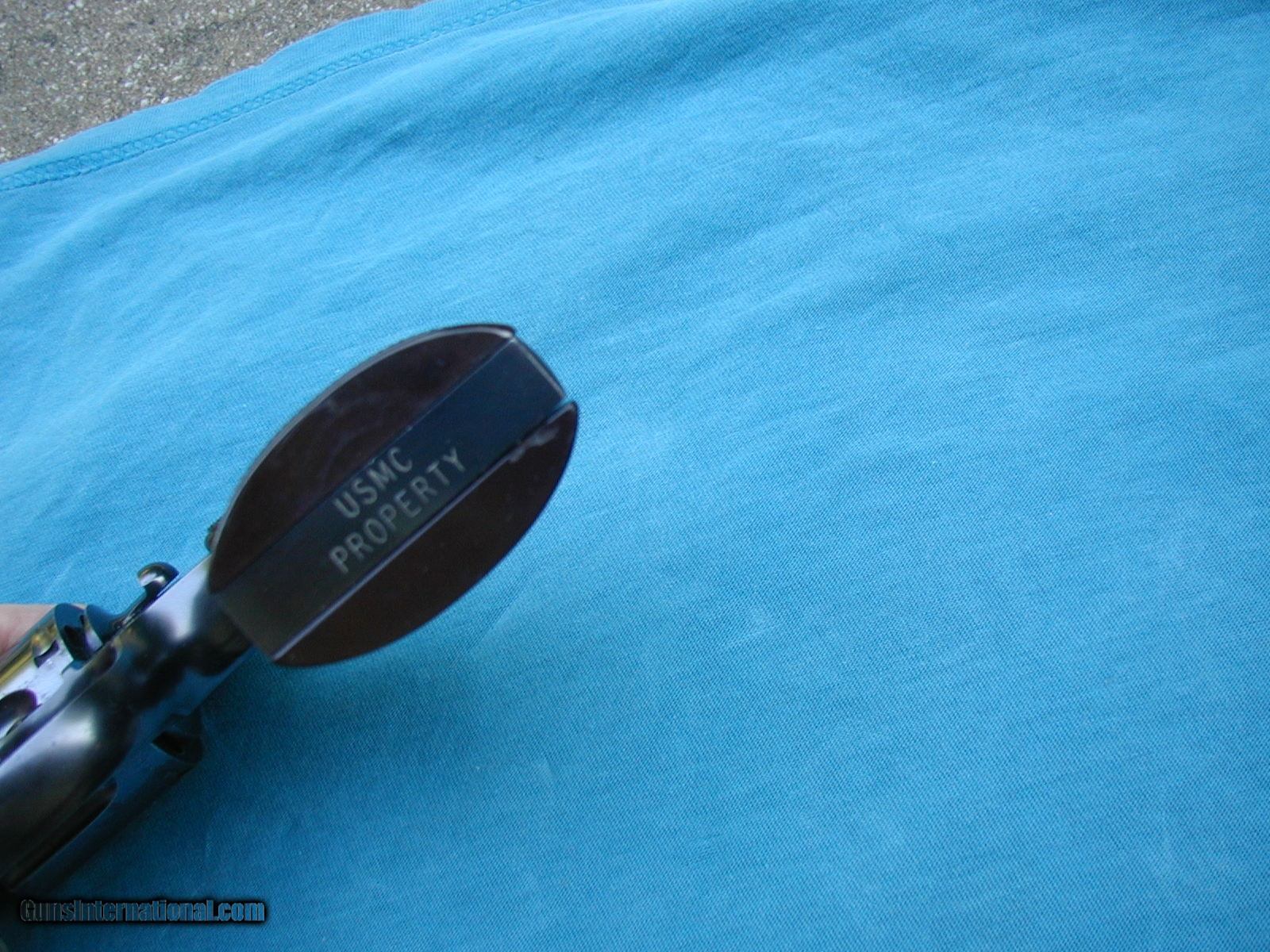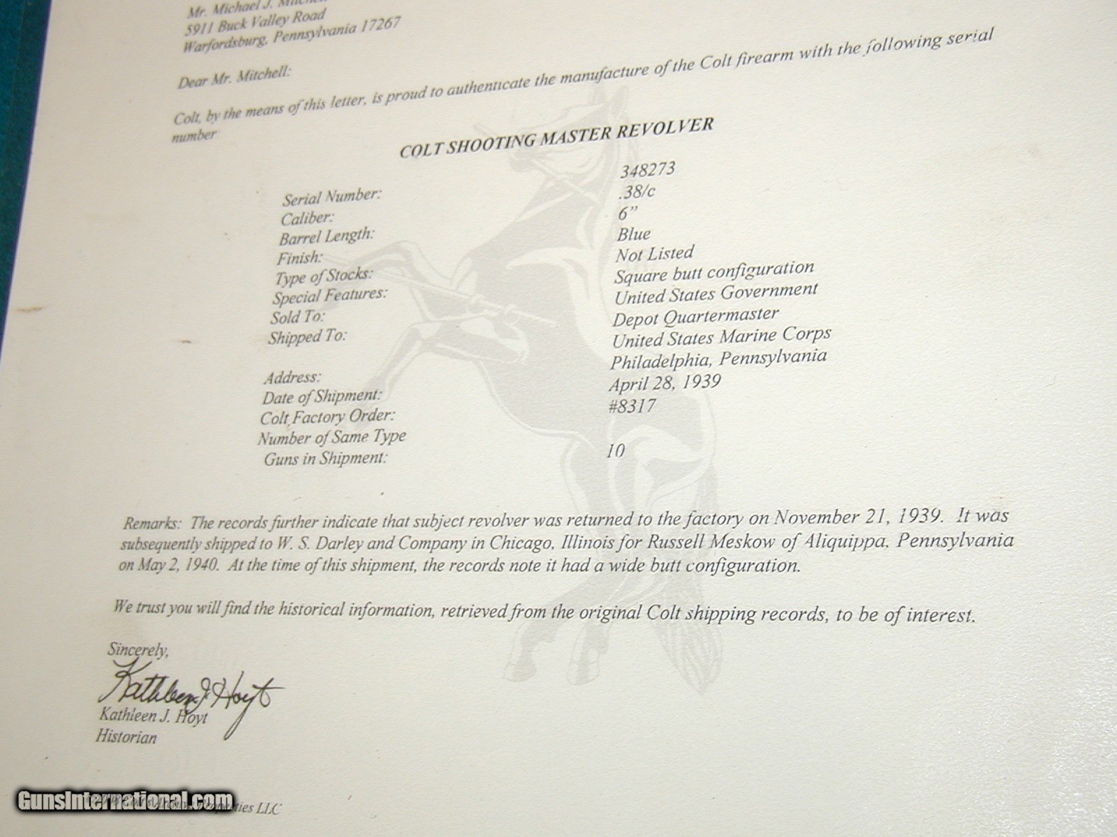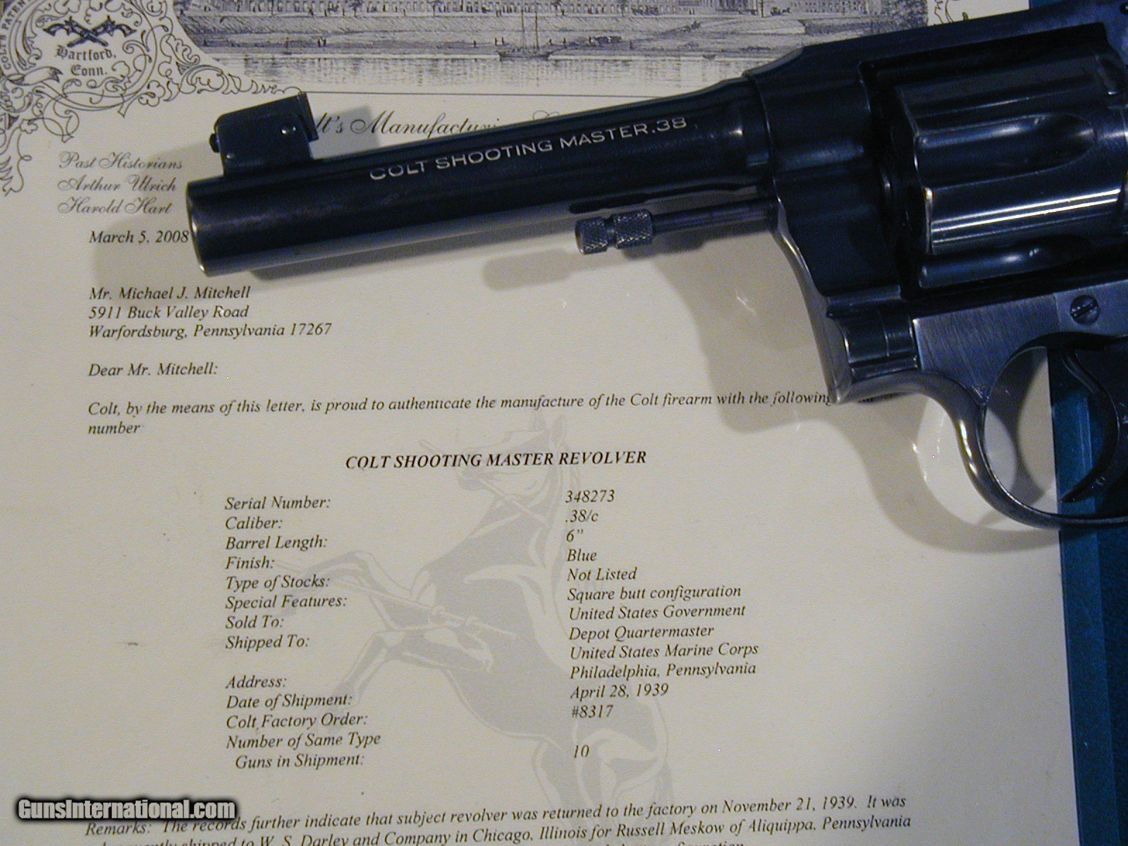 Description: THIS IS AN EXTREMEMLY RARE COLT SHOOTING MASTER MFD. IN 1939 THAT WENT TO THE U.S.M.C. , FOR INTER/INTRA SERVICE COMPETITION. COMES WITH A FACTORY LETTER. IT IS IN EXCELLENT, 97% ORIGINAL CONDITION WITH A PERFECT BORE AND ACTION. LETTER STATES 6" BARREL AND HAS A 5" CORRECT BARREL ON IT . FACTORY ERROR? . ORIGINAL OFF-SET FACTORY HAMMER UNIQUE TO SHOOTING MASTERS . VERY RARE MODEL USMC COLT. SOLD Curio/Relic: Yes |