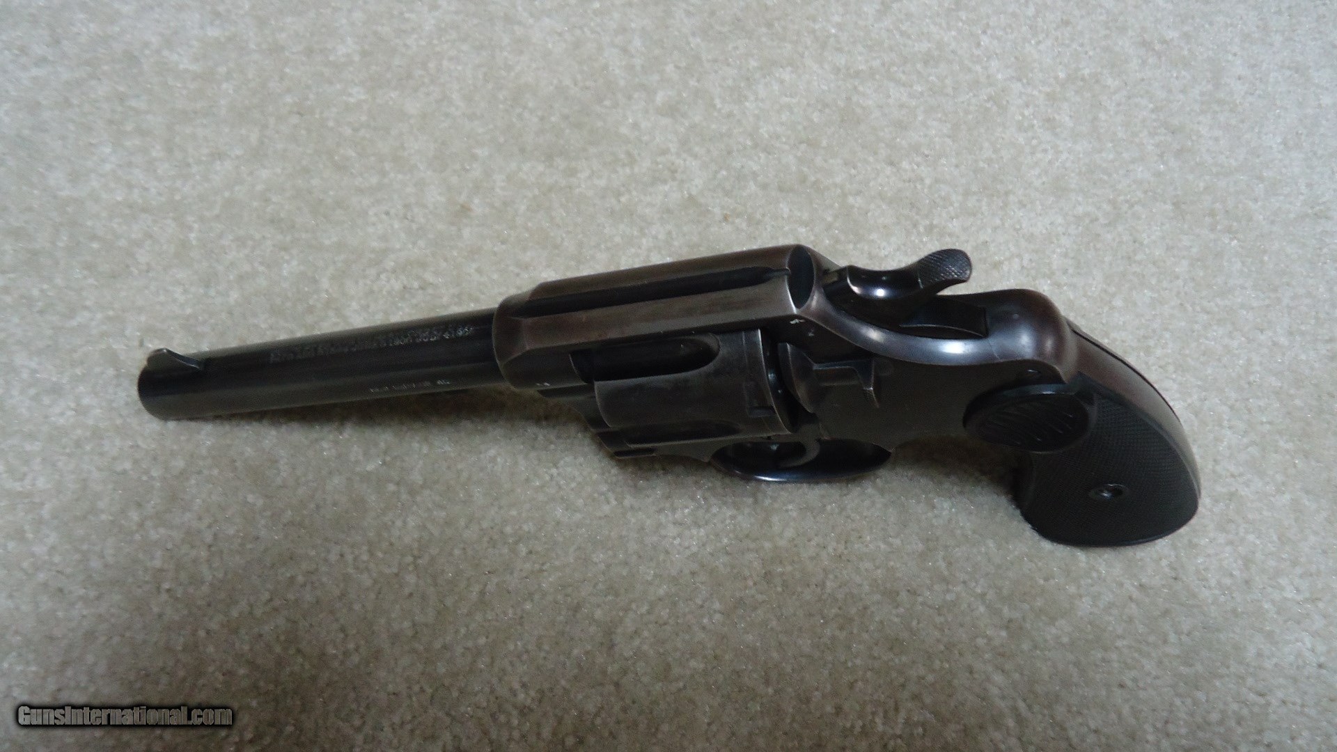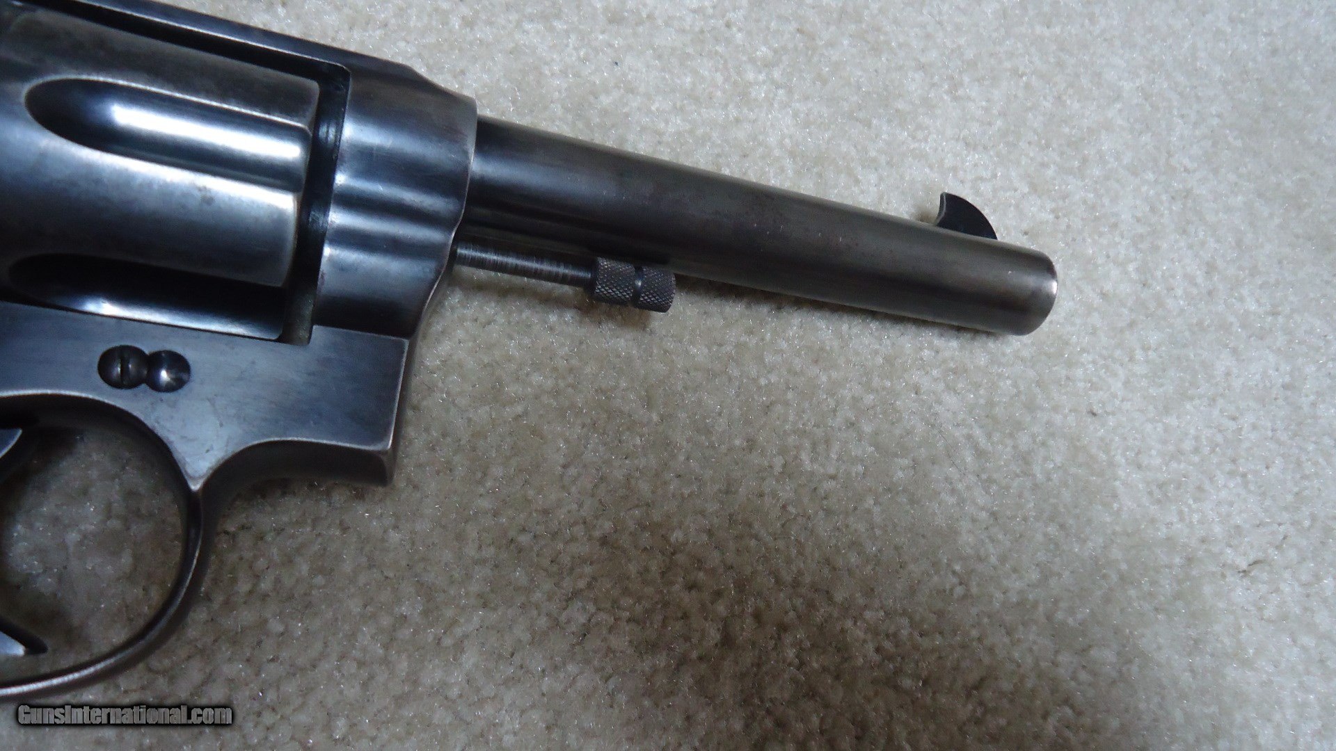 Description: WORLD WAR I NEW SERVICE IN .455 ELEY, BRITISH PROOFED, #134XXX, MADE 1917. This is a classic example of an issued revolver that no doubt saw service in the trenches, but was cared for. Also, this one has NOT been altered or bored out to .45 Colt caliber etc. as so many have been. All markings and proofs are sharp and clear. The front sight has not been filed or altered, the action is tight and the bore is bright and excellent. The grips are the correct style and fit well, but may be replacements. Only the lanyard swivel has been removed with a filler stud in its place. Overall good blue that shows normal handling and holster wear on the grip straps and some thinning on the barrel sides and frame. There is still nice fire blue on the back of the hammer. Nice appearance. SOLD Curio/Relic: Yes Manufacturer: COLT Model: NEW SERVICE Serial Number: 134XXX Barrel Length: 5 1/2 Caliber Info: .455 ELEY Condition: FINE Bore Condition: EXC. |