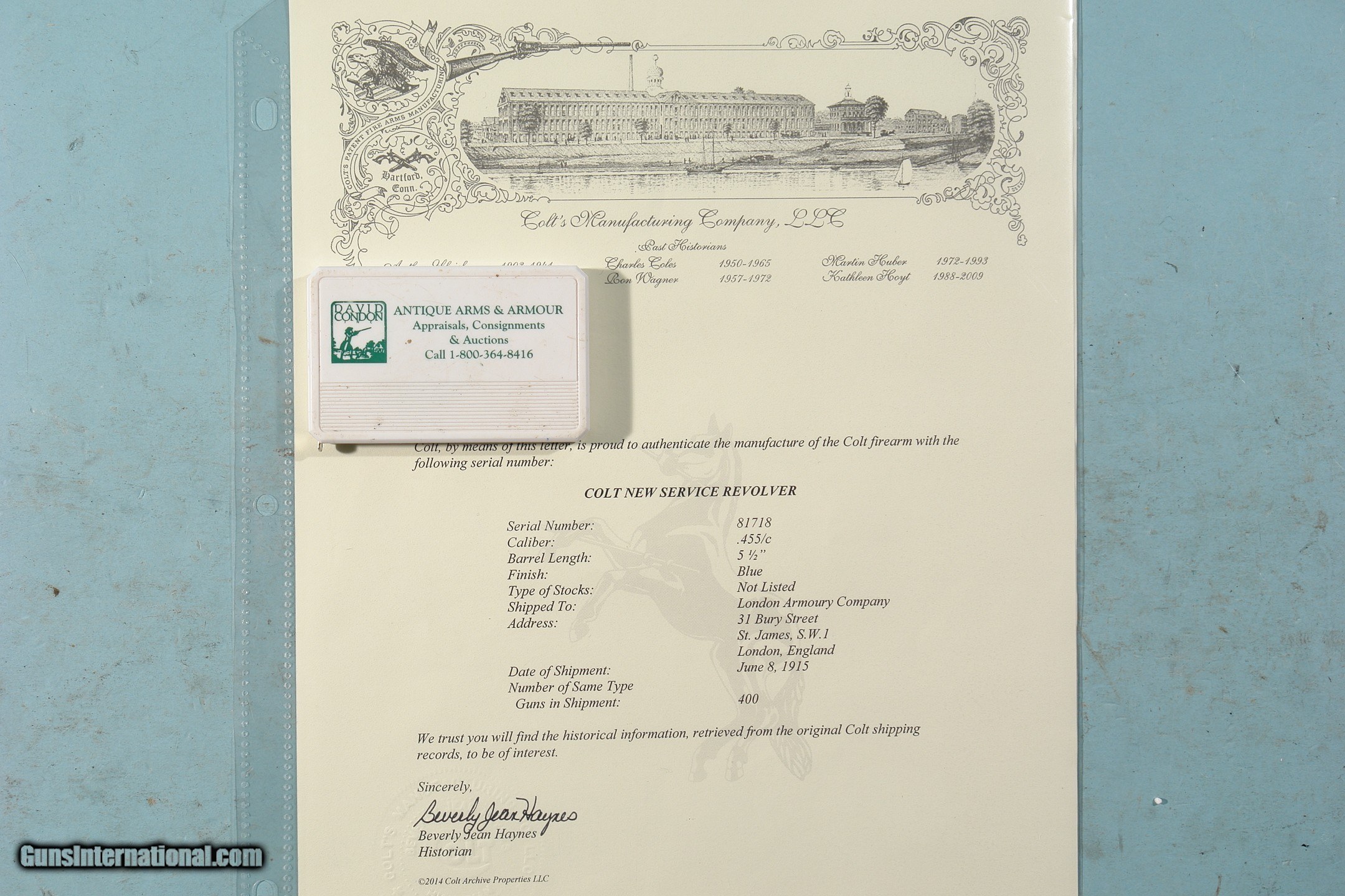 WW1 BRITISH ORDNANCE INSPECTED COLT NEW SERVICE DOUBLE ACTION .455 ELEY CAL. REVOLVER CIRCA 1915 W/FACTORY LETTER.