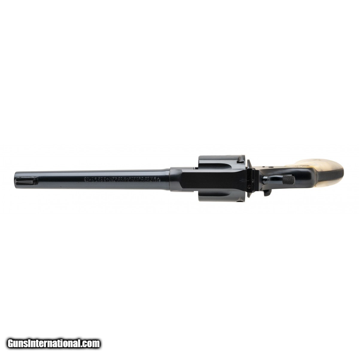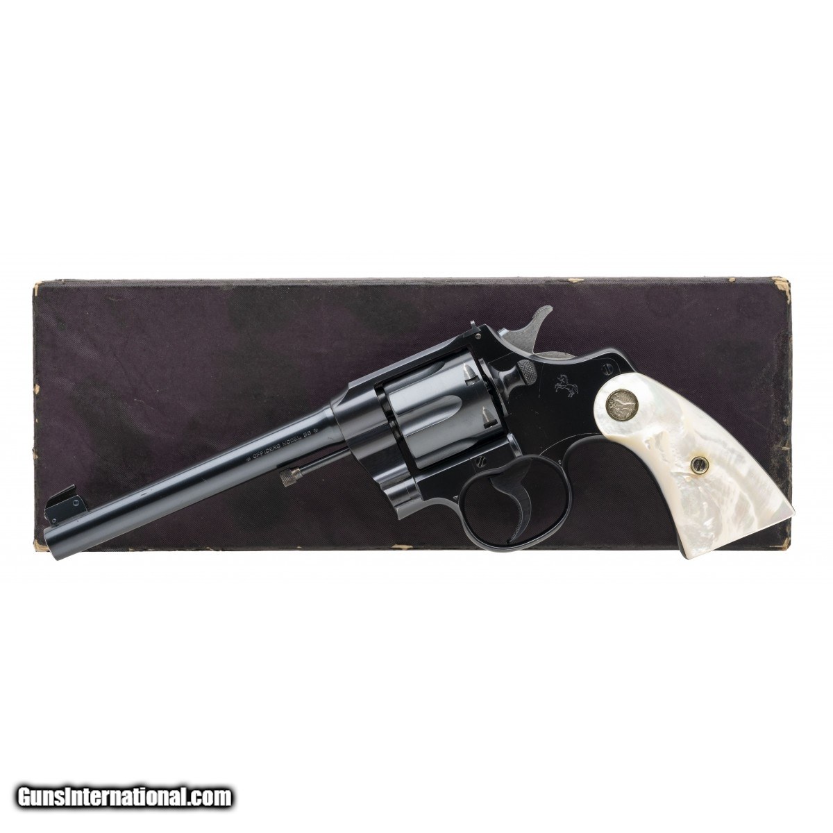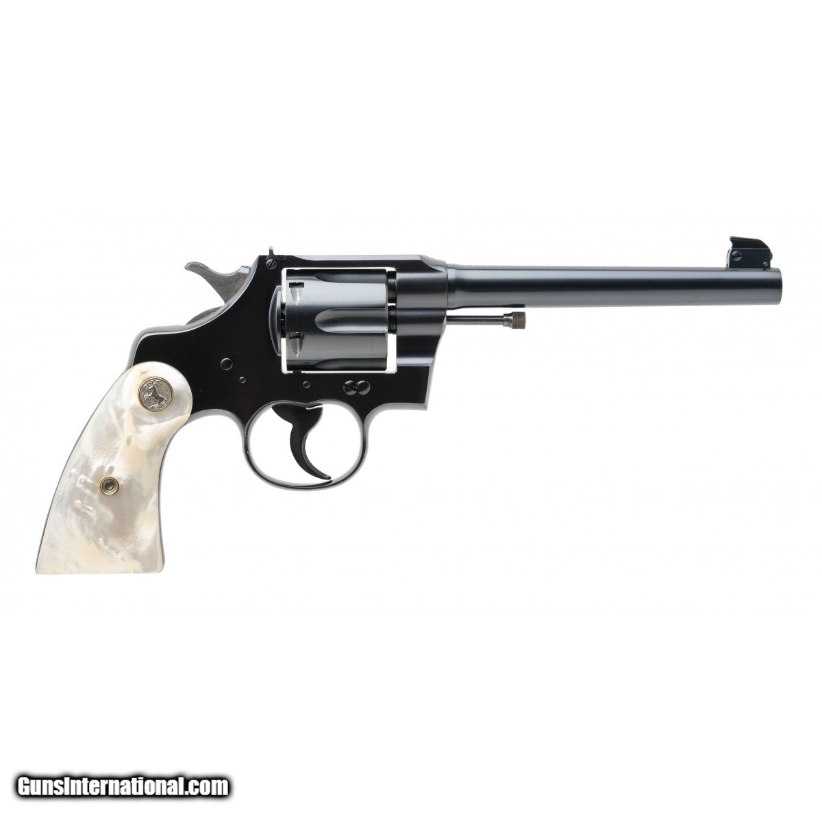 Description: "SN: 525519. Made in 1926. .38 Special with a 6"" barrel. Bore is shiny with strong rifling. Pre-war Colt double action revolver with factory pearl grips. Revolver retains 98% of factory finish with only minor wear noted on the left side of the frame. Factory pearl grips are in excellent condition. Action functions properly. Comes with box, cleaning tool, and factory letter. Overall near excellent condition. (Consignment) SOLD Curio/Relic: Yes |