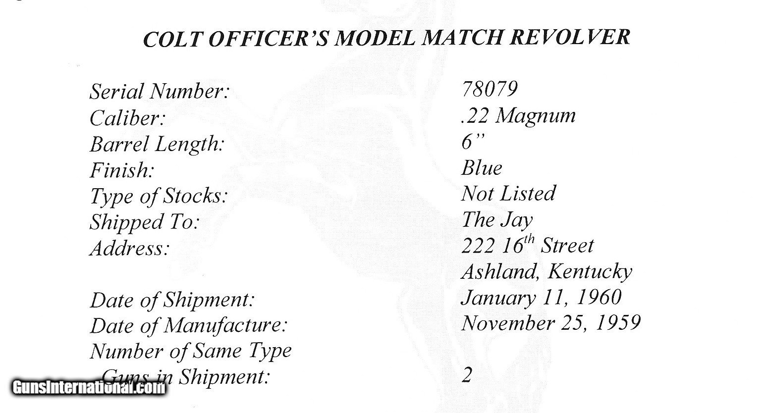 Description: Sold Pending Funds - 1959 Colt Officer's Model Match revolver chambered for the .22 Magnum cartridge, this revolver wears a 6" tapered heavy barrel with adjustable target sights. .22 Mag is a scarce variation as documented in the Colt Factory Archive letter specifying a special factory order of 5 guns. Only 850 were manufactured. Overall condition is excellent with only very light wear and some collector type marks and rubbing on the frame and barrel. The stocks are in excellent shape showing only a few minor handling marks and free of cracks or chips. The mechanics are in perfect working order with good timing and lock-up. The bore is also in excellent shape and exhibits bright, sharp rifling throughout. The forcing cone is pristine. This item qualifies as a C&R. Please view the photos here for purpose of evaluating the condition. Shipping: $45 No International or California sales. Prop rod not included in sale – for display purpose only. Buyer is responsible for knowing their own local and state laws and whether or not you are prohibited from taking possession of, or owning this firearm. By participating, you are attesting to being of at least 21 years of age. ***The purchaser assumes all risks and should have a qualified Gunsmith evaluate the firearm before attempting to shoot it. *** Please contact me within 3 days of close of for payment. Payment must be by bank certified (cashiers) check or Postal Money Order. Shipping & insurance by FedEx is $45 to eligible lower 47 states. Shipping to AK or HI will have additional costs for which buyer is responsible. I will need a copy of an FFL dealer license to ship the gun. There is a 3 day, no-shoot, no disassembly inspection period and the buyer is responsible for cost of shipping both ways if returned. If your FFL dealer will not accept shipment from an individual, I will need an additional $35 to ship through my FFL SOLD Curio/Relic: Yes Manufacturer: COLT Model: Officer's Model Match Caliber Info: .22 Magnum Manufacture Date: 1959 Extras: Factory Archive Letter |