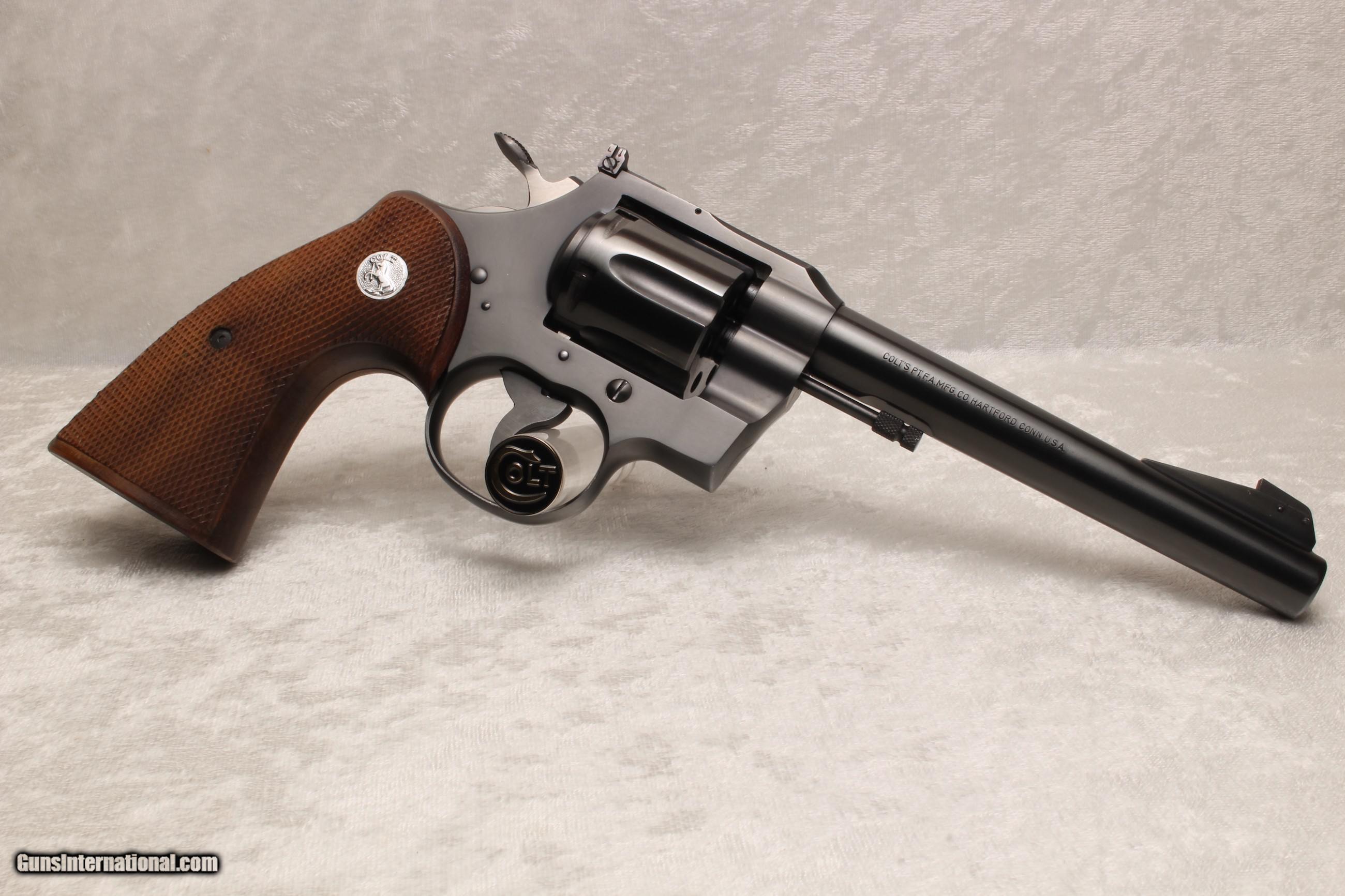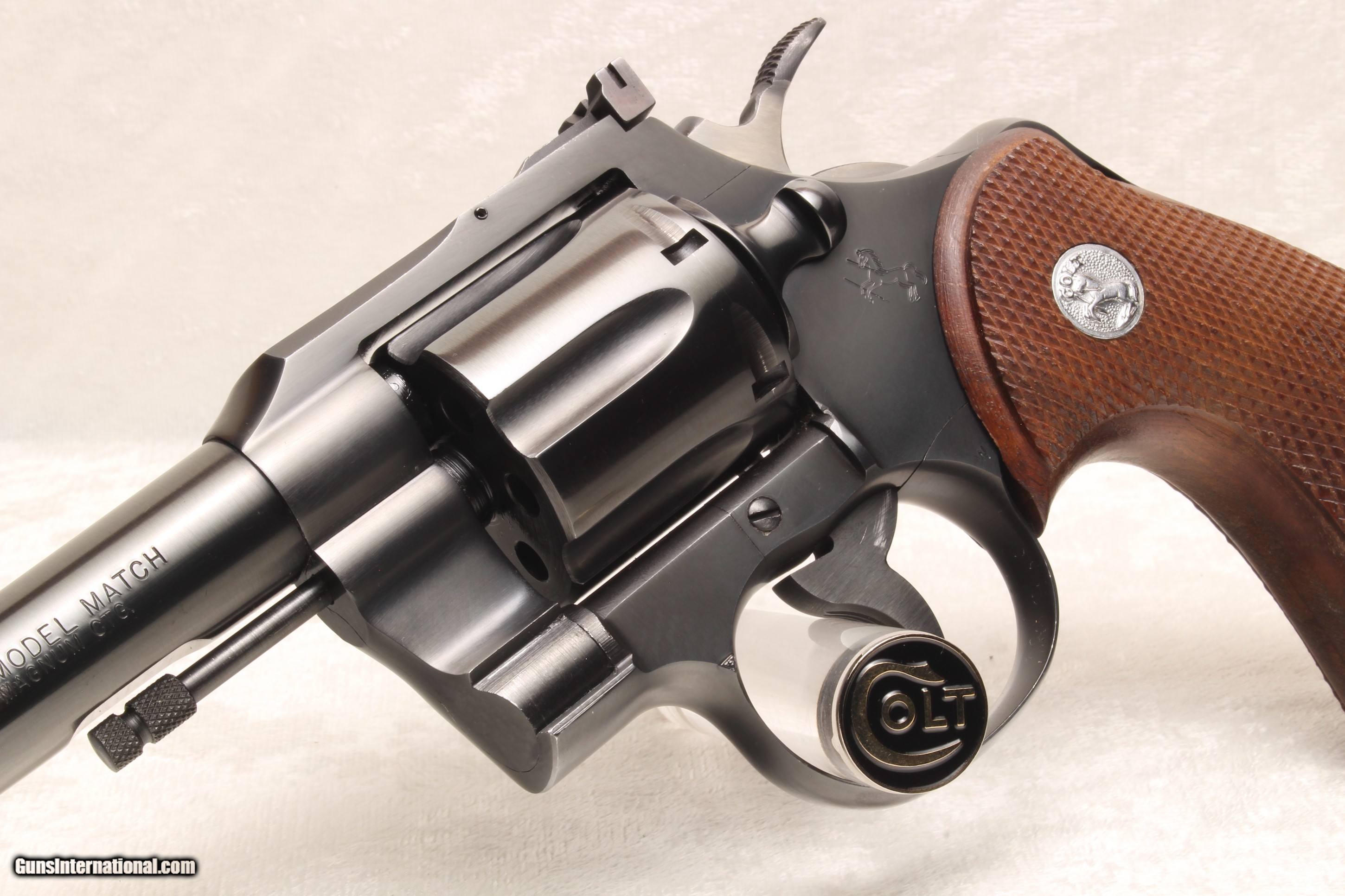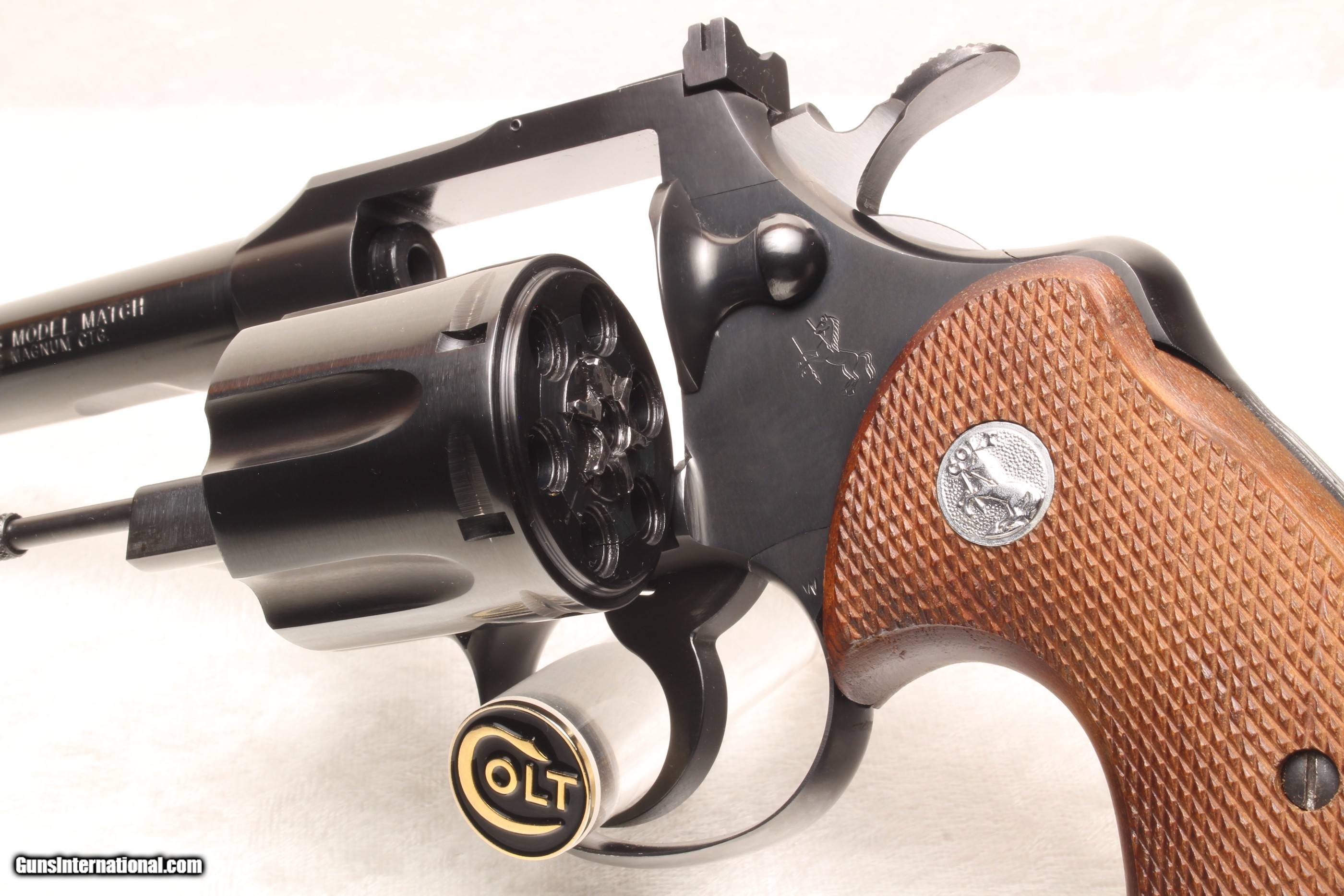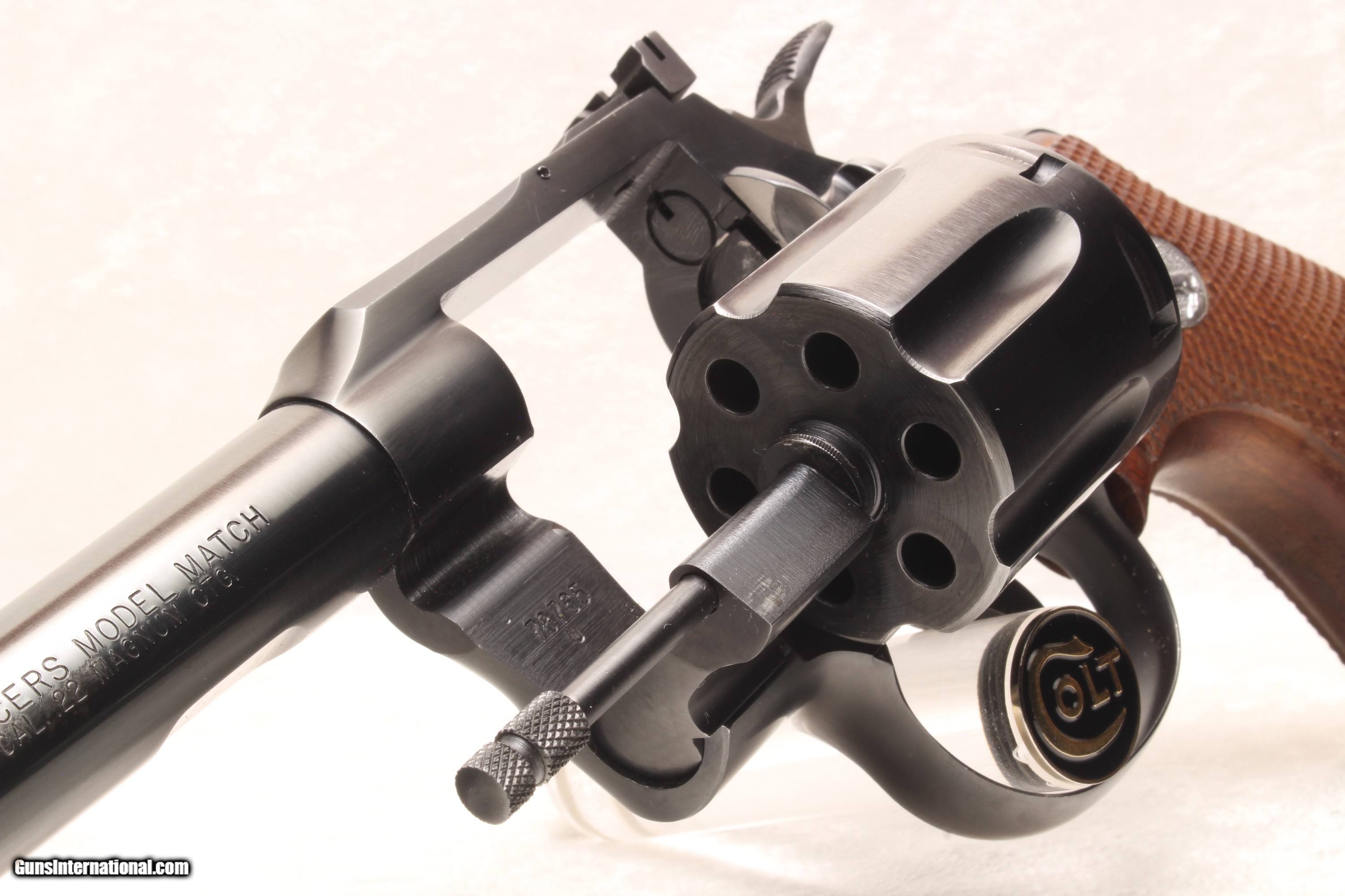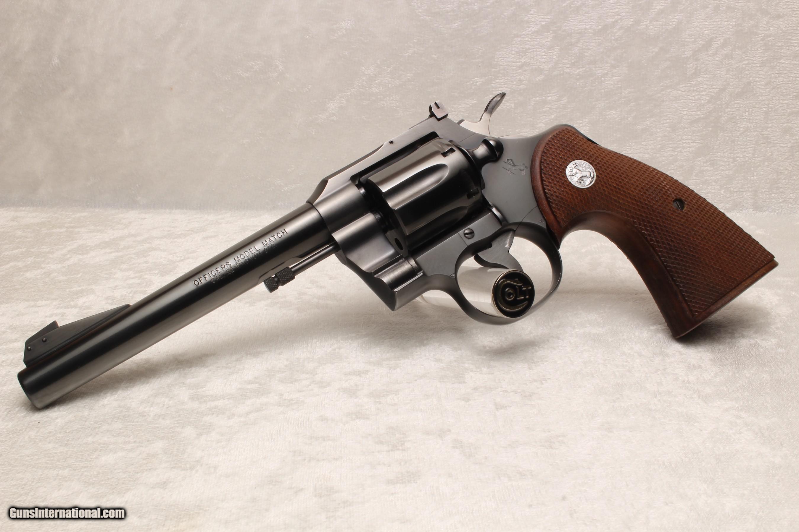 Description: Colt Officers Model Match fitted with a 6 inch tapered heavy barrel, wide spur target hammer, under-cut patridge front sight, Accro adjustable rear sight, target grips, and chambered in .22 Magnum. This early 1960 vintage, Officers Model Match is in excellent condition, retaining 98% original blue finish, with only a very small blemish near the caliber stamping on barrel. The cylinder face, recoil shield, and forcing cone are very clean with only a light turn line on the cylinder itself. The action is crisp with tight lock up, and the bore is clean with strong lands/grooves. The factory full checkered walnut grips are exceptional. The full checkered grips were correct for the first half of the 1960 model year. Colt switched to the "smiley" style, oil finished grips late in the year. During the entire production run of the Officers Model Match, very few were manufactured in this caliber. Published estimates put the total number at about 850, making this gun somewhat rare especially in this condition. Sorry, no box or paper-work. Free Shipping... SOLD Curio/Relic: Yes Handgun Caliber: .22 WMR (.22 Magnum) Manufacturer: Colt Model: Officers Model Match Condition: Excellent Manufacture Date: 1960 Item Location: Arizona |