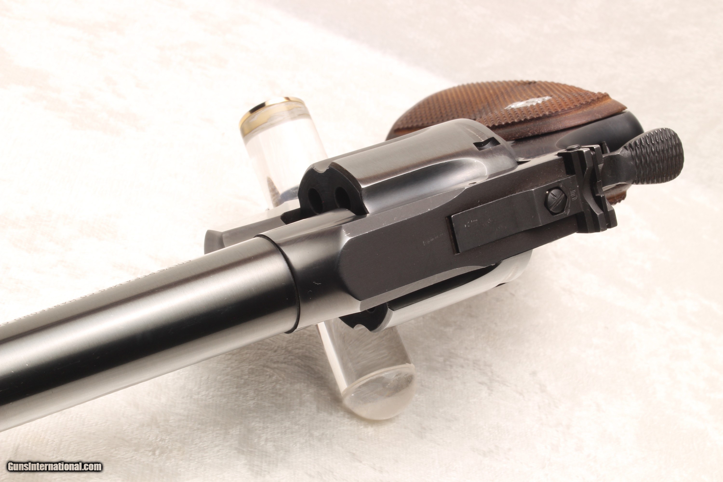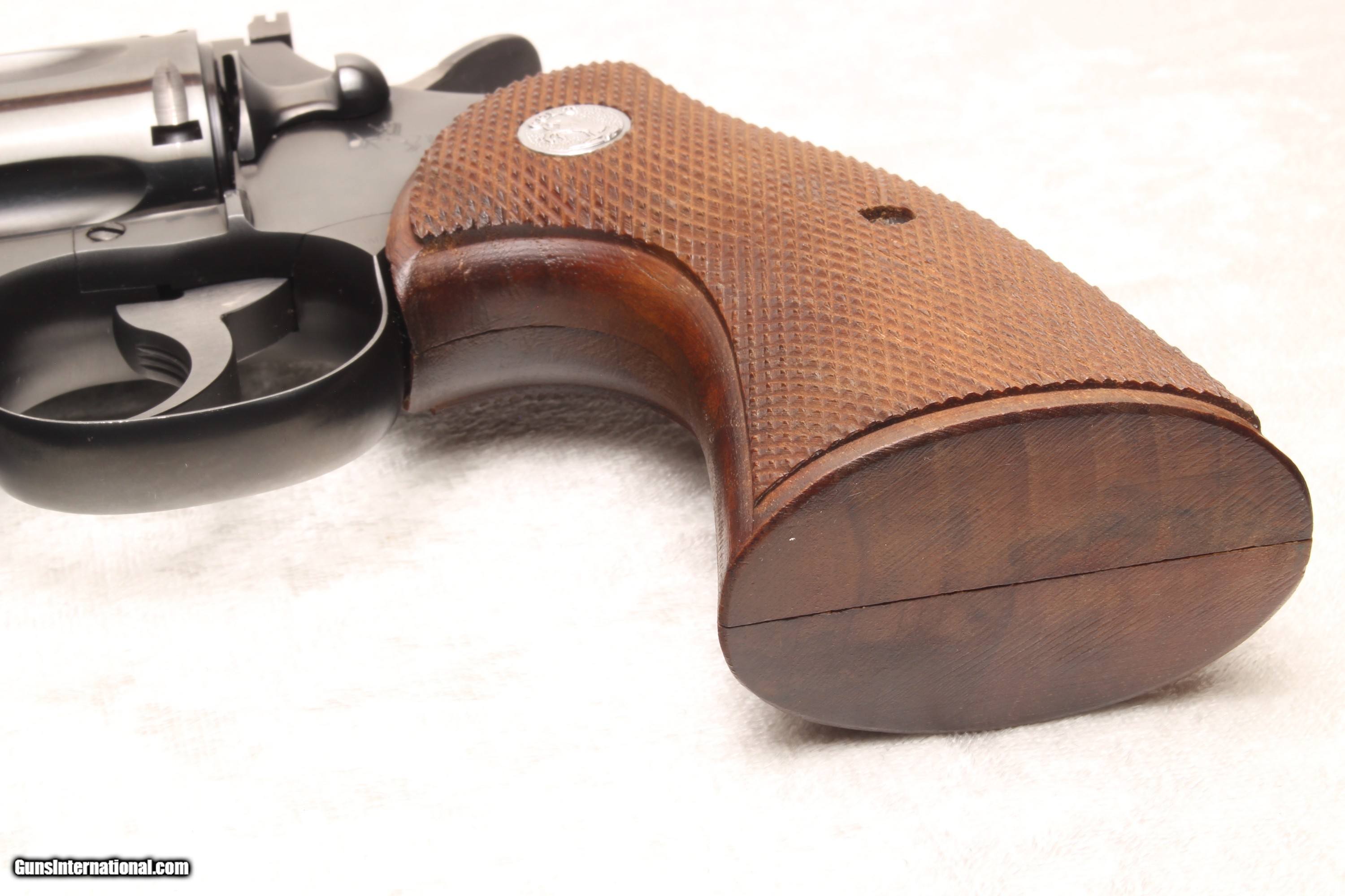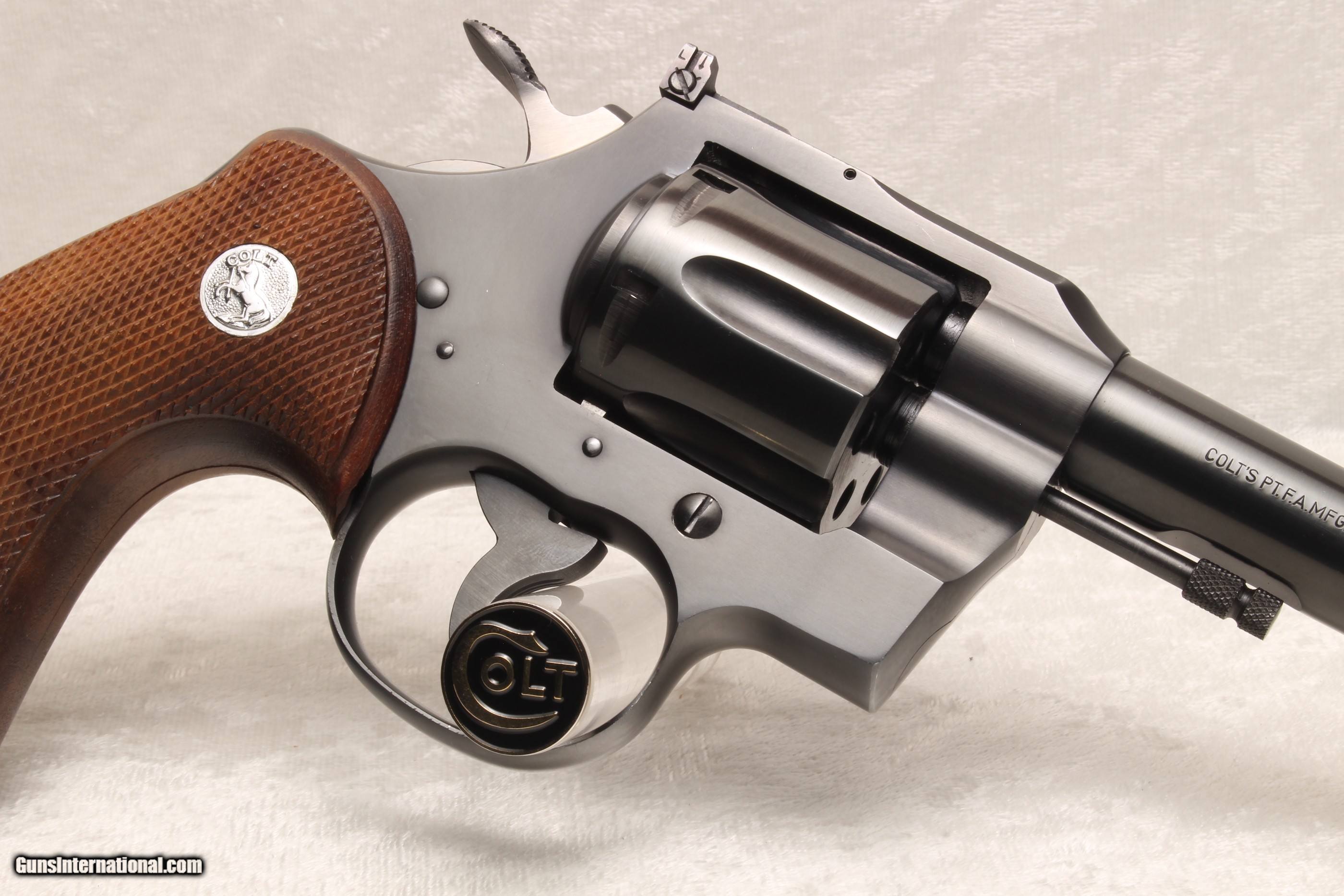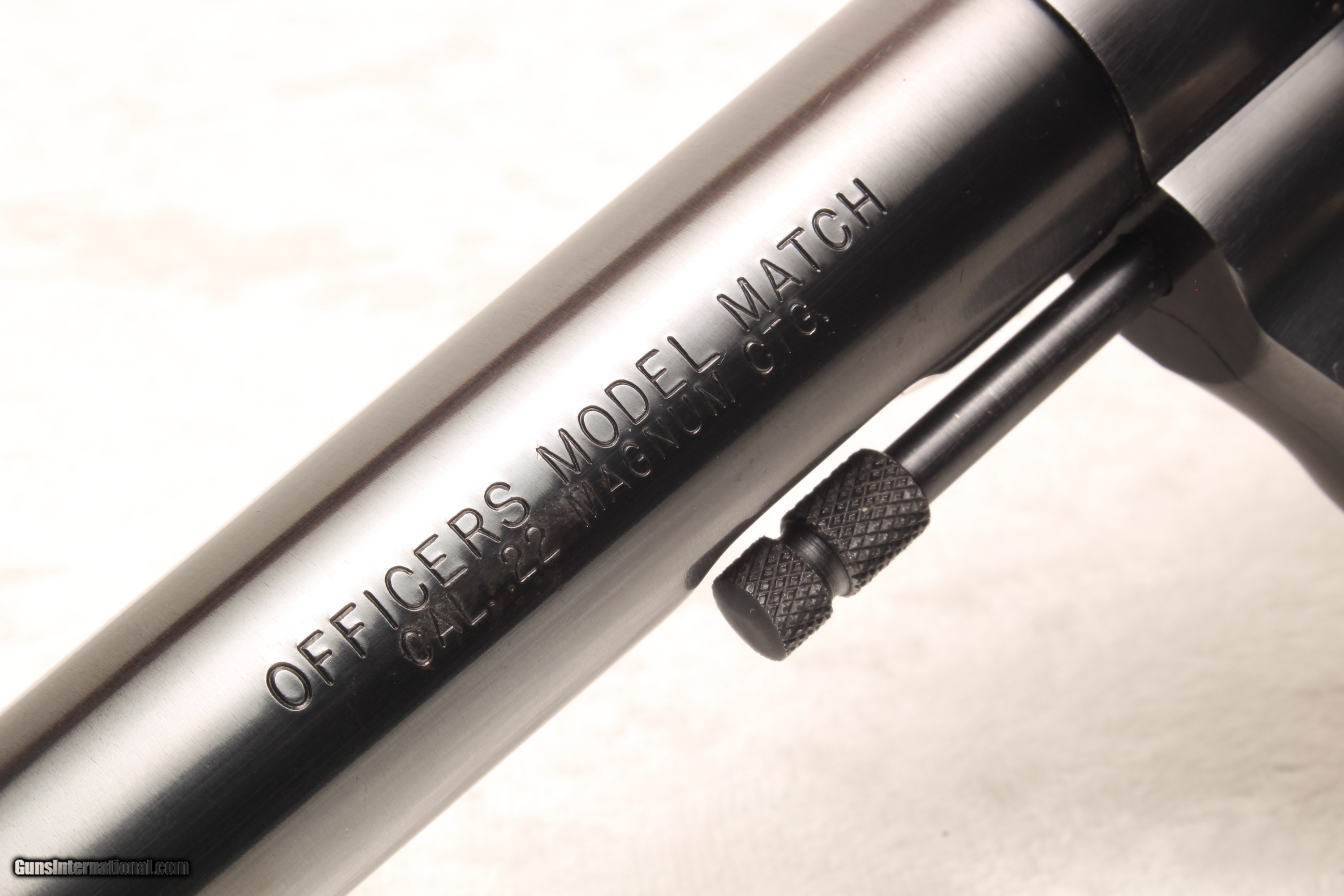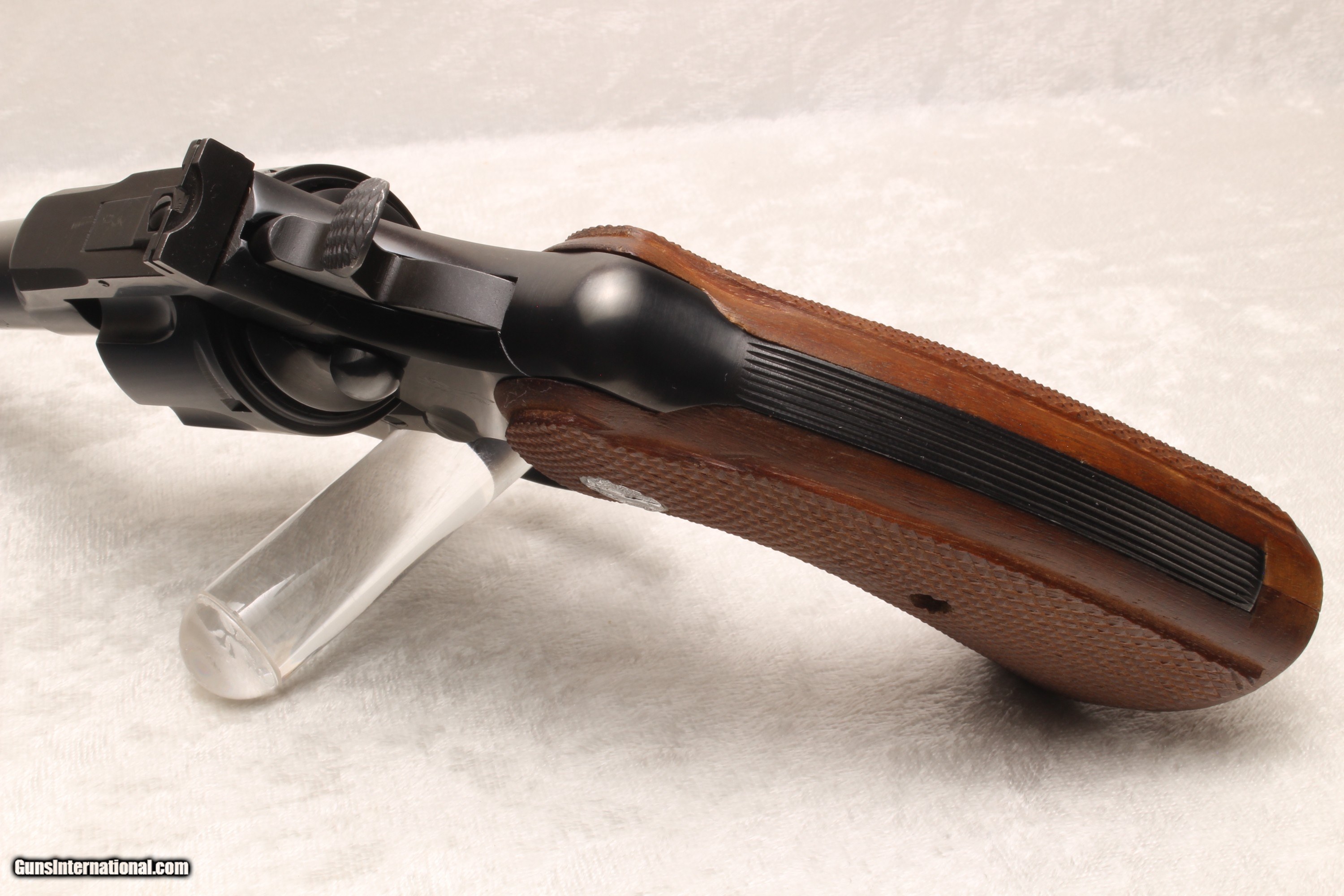 Description: Colt Officers Model Match fitted with a 6 inch tapered heavy barrel, wide spur target hammer, under-cut patridge front sight, Accro adjustable rear sight, target grips, and chambered in .22 Magnum. This early 1960 vintage, Officers Model Match is in excellent condition, retaining 98% original blue finish, with only a very small blemish near the caliber stamping on barrel. The cylinder face, recoil shield, and forcing cone are very clean with only a light turn line on the cylinder itself. The action is crisp with tight lock up, and the bore is clean with strong lands/grooves. The factory full checkered walnut grips are exceptional. The full checkered grips were correct for the first half of the 1960 model year. Colt switched to the "smiley" style, oil finished grips late in the year. During the entire production run of the Officers Model Match, very few were manufactured in this caliber. Published estimates put the total number at about 850, making this gun somewhat rare especially in this condition. Sorry, no box or paper-work. Free Shipping... SOLD Curio/Relic: Yes Handgun Caliber: .22 WMR (.22 Magnum) Manufacturer: Colt Model: Officers Model Match Condition: Excellent Manufacture Date: 1960 Item Location: Arizona |