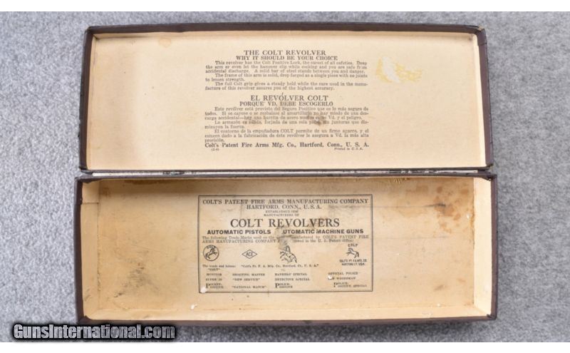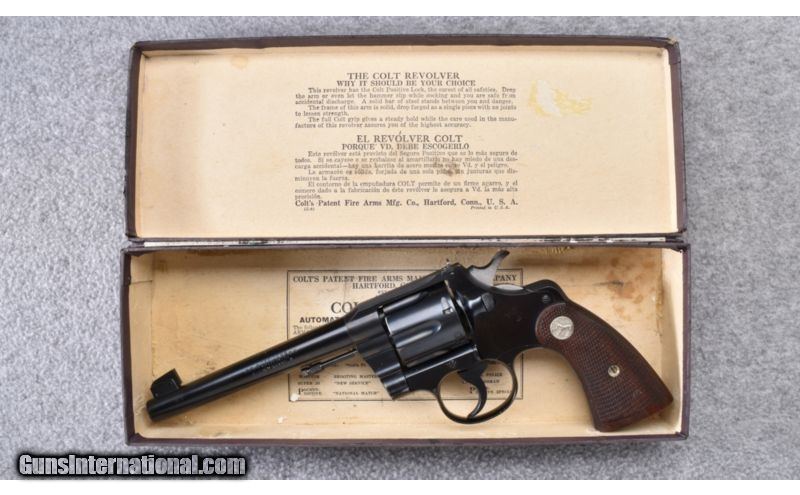 Description: Grips are solid showing little wear. Bluing shows very light wear at the muzzle and trigger guard. Bore and chambers are excellent! Comes with Colt .38 Heavy Barrel Officers Model .38 box with non-matching serial number. SOLD Manufacturer: S/N 650616 Caliber Info: .38 Metal Condition: Excellent Wood Condition: Excellent Bore Condition: Excellent Barrels: 6 Triggers: Factory Checkered Stock: Checkered Walnut Grips Weight: 34 OZ Sights: Patridge Front - Square Notch Rear Item Location: Chesterfield, MI |