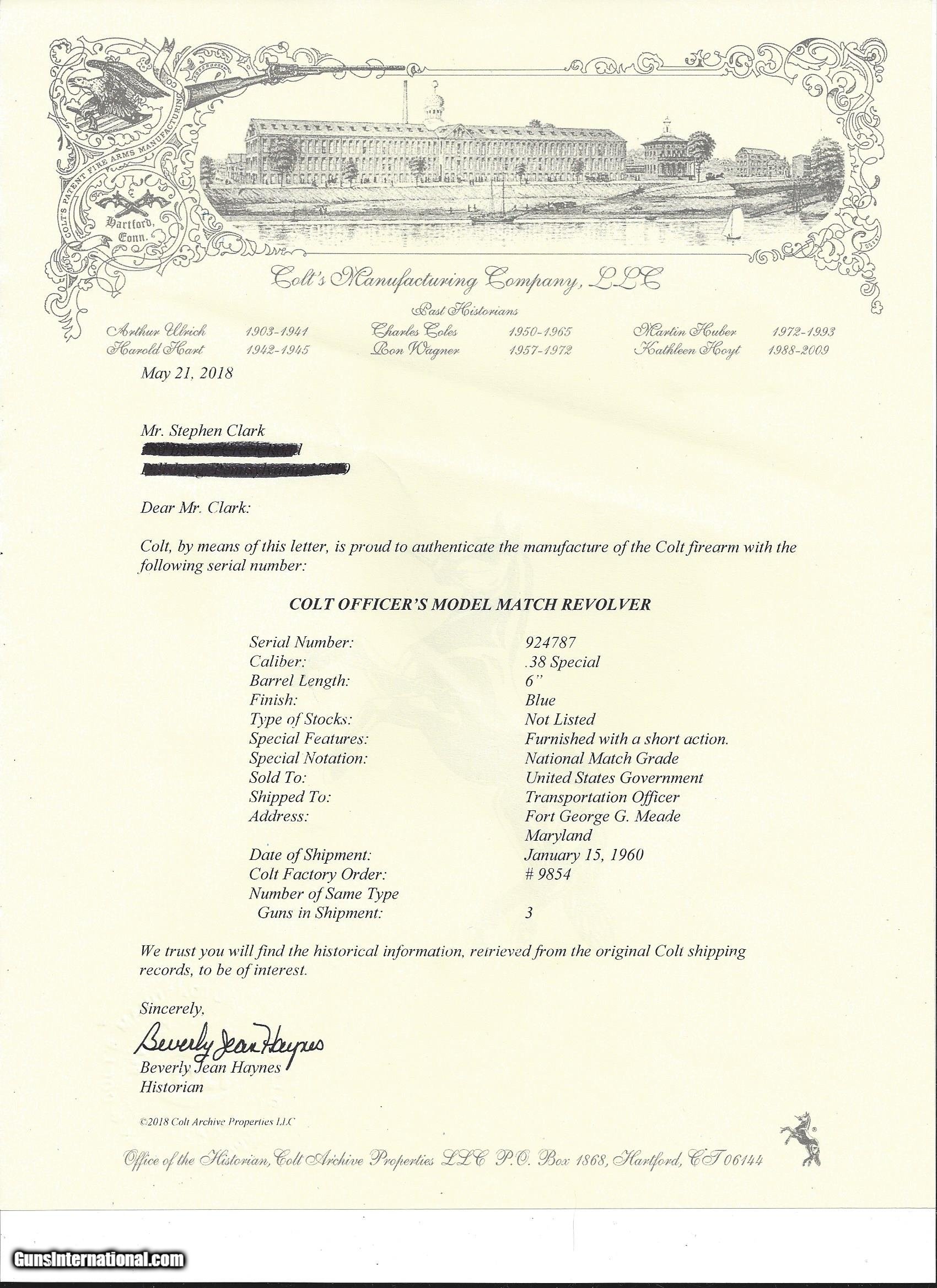 Description: This listing is for a Consecutive serial numbered PAIR of Colt Officers Model Match Revolvers. They are National Match Grade and furnished with “Short Actions”. To clarify, pulling the trigger, as in double action mode, indexes the cylinder but does not move the hammer. Cocking the hammer, as in single action mode, indexes the cylinder as you would expect. This disconnect between single and double action allows the trigger to be tuned to National Match standards. This pair of National Match revolvers were 2 of a 3 gun shipment from Colt to Fort George Meade MD on Jan 15, 1960. Each revolver is accompanied by a Colt History letter. SN 924786 was subsequently shipped from Letterkenny Army Depot in Chambersburg and is accompanied by the shipping box as can be seen in one of the photos. I applied a Pink sticker to revolver 924786 for purpose of photo identification. The pieces are very closely matched in condition. Bores are excellent, and the actions / trigger is about as perfect as possible. The single action pull is very lite and crisp. Each gun has a slight bit of wear to the muzzle edges from resting in a box otherwise they are 99% with just a few tiny handling marks. 924786 appears to be shot very little judging from the bolster, 787 shows just a bit more wear from target history. Neither grip is numbered to the gun which is correct for the era. These Colt Officers Model Match revolvers are an excellent investment grade collectable. With the added Military Providence, the National Match features, “short action” and consecutive pair status they are in a whole new league. AND…Someone has the Third consecutive SN from this shipment. These Colts are an investment grade firearm that will certainly increase in value. Serial Numbers 924786 and 924787, Cal. .38 Spl. w/ 6” Barrel. C&R or FFL Req’d. Beaver Creek Arms TERMS & CONDITIONS Objective: As a collector of 35 years and Licensed Firearms Dealer since 1989 I have a clear definition of a satisfactory transaction. I will be paid as we agreed to, and you will be satisfied with your purchase. My goal is to establish a client list of satisfied repeat customers who will recommend me to other collectors. It’s just that simple. Exiled Saudi princes with secret funds needing change from an over paid purchase need not apply. Notice: ALL Federal, State, & Local firearms laws will be followed. I will take NO shortcuts in the process of a legal sale or transfer, so please don’t ask. SHIPPING: Normally shipments are made via U.S.P.S. Priority Mail, Insured, with a return receipt. Typical Packing, Shipping and Insurance cost for a handgun is $35.00, and for a Long Gun is $45.00. Checks are to be made out to: Steve Clark, and mailed to: 380 Beaver Creek Road, Dillsburg PA 17019 Availability: All items are in stock and available for immediate shipment. Please call or email and an Item will be held up to a week with your Name, Address, & Phone Number. Items marked Reserved are being held for awaiting payment or on layaway. If you are interested in a reserved item, please call or E-Mail to be placed on a backup list. FIREARMS: Modern firearms, post 1898, can only be shipped to a Type 01 Federal Firearms License address. Curio-Relic firearms, as defined by the BATF list, can usually be shipped to a Type 03 Collectors License address. Some states have additional restrictions such as CA, CT, DC, IL, MD, NJ and NY. A signed valid FFL license copy either mailed or emailed will be required for shipment to only the license address. Antique firearms, pre 1898 do not require a Federal License. For purchase, a copy of a Government Issued Identification (Driver’s License, Etc.), showing date of birth and current address will be required. GUARANTEE: Your complete satisfaction is assured, see objective above. If you are not satisfied, please contact me within 3 days of receipt. Please don’t fire the weapon, safety, function and accuracy are NOT Guaranteed. Any weapon offered by Beaver Creek Arms is never test fired nor is there any representation the gun is functional and safe to fire. These guns are sold for collectors and only represented as used firearms that must be checked by a competent person, observe all the necessary safety precautions prior to attempting to load and fire one of these weapons RETURNS: Returns must be made within 3 days of receipt. They must be received in exactly the same condition with no parts exchanged. If it has been altered, damaged, or fired, a refund will not be made. Packing, shipping and insurance cost will not be refunded. All layaway purchases are returnable for merchandise credit only. Sales: All sales are made with the buyer’s full acceptance of the stated terms of sale. All sales are made in strict compliance with all Federal Firearms Laws. No items contained in thissite are offered for sale where prohibited by any Federal, State or Local laws. By ordering, the buyer certifies that their purchase will be in full compliance with all Federal, State and Local laws. All transactions shall be deemed to occur in Pennsylvania regardless whether by telephone, mail, internet or the physical location of the buyer. All transactions will be subject only to Federal and Pennsylvania State law. Any disputes will be resolved in a Pennsylvania Court. PAYMENT: Bank check, Personal check, and Money Orders are preferred. Visa and MasterCard are accepted with a 3% processing fee. For Visa and MasterCard orders please provide the account number, code number, expiration date, name on card, phone number and card billing address. This information can be phoned in, or E-Mailed. All orders must be paid in advance, C.O.D. orders are not accepted. Checks, both Bank and Personal must clear before the order will be shipped, usually a 2 week delay. LAYAWAYS: A 20% deposit is required. Balance is due in 60 days. Deposits are non-refundable and are forfeited after 60 days. Layaway sales are returnable for merchandise credit only