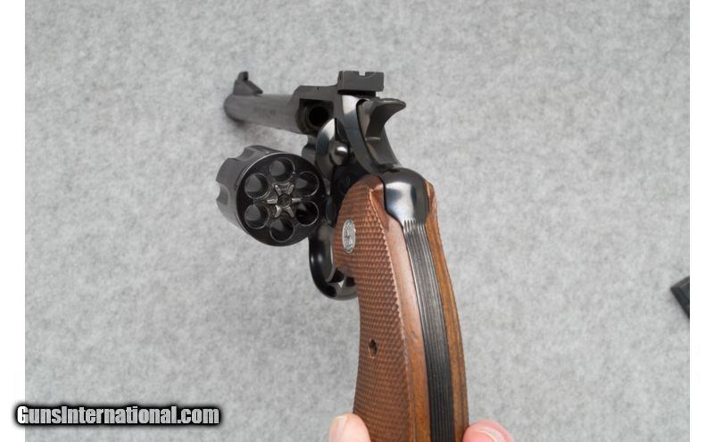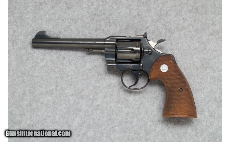 Description: Used. SOLD Caliber Info: .38 SPL Metal Condition: Excellent Wood Condition: Excellent; couple of small marks Bore Condition: Clean and sharp Barrels: 6 Triggers: Grooved, blued steel Stock: Checkered walnut grips with Colt Medallions Weight: 37 oz. Sights: Adjustable target rear; blade front Extras: No box. Item Location: Sun Prairie, WI |