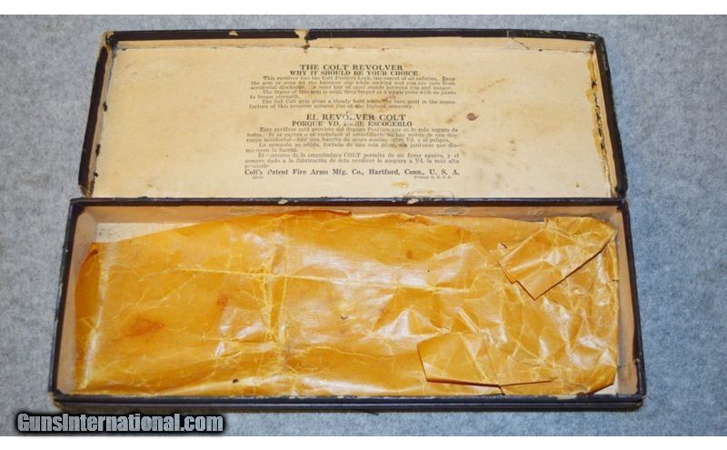 Description: High condition Officer's Model Target Revolver with original box in very good condition. SOLD Curio/Relic: Yes Manufacturer: CA. 1939 Caliber Info: .22 LR Metal Condition: Excellent Wood Condition: Excellent Bore Condition: Excellent Barrels: 6 Triggers: Factory Checkered Stock: Colt Medallion Checkered Walnut Weight: 39oz. Sights: Patridge Front Sight / Rear Notched Item Location: Charleston, WV |