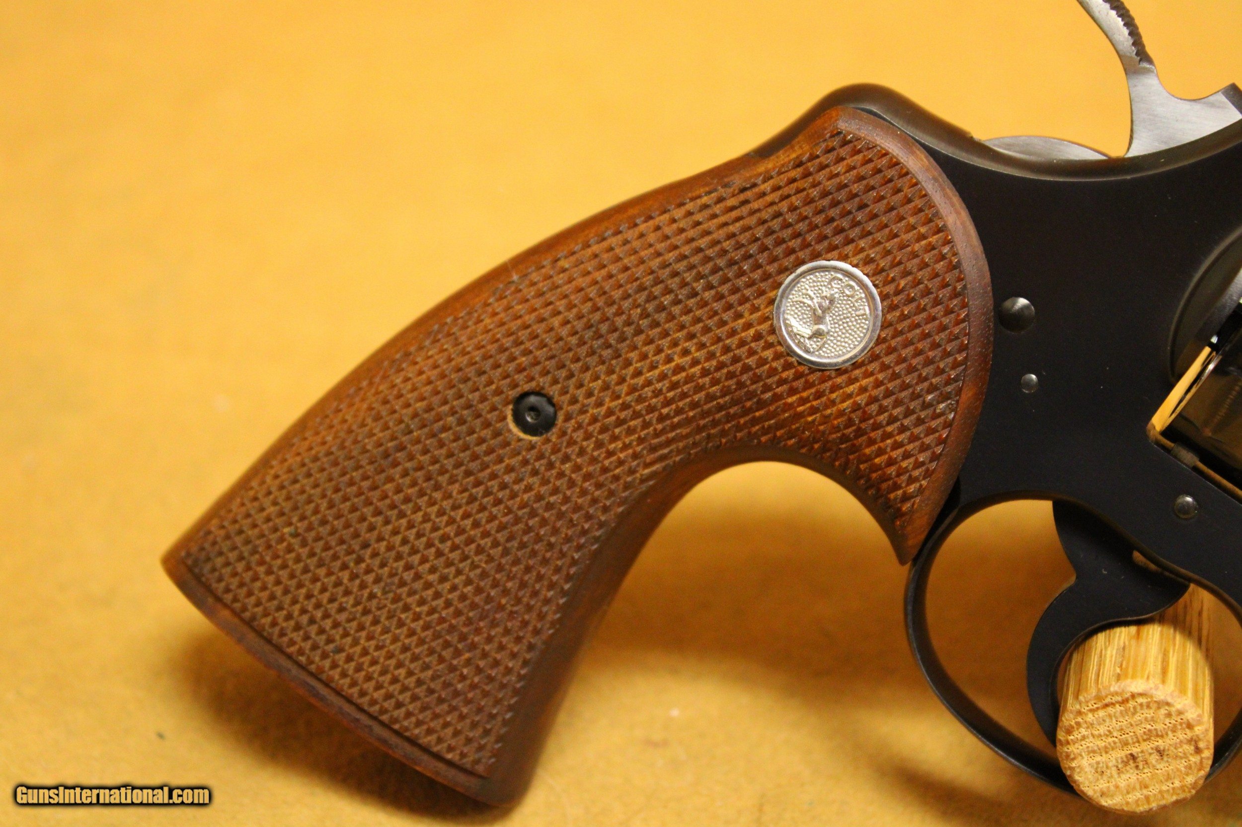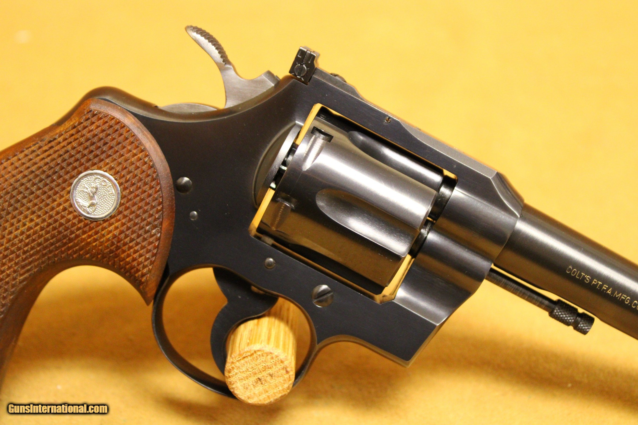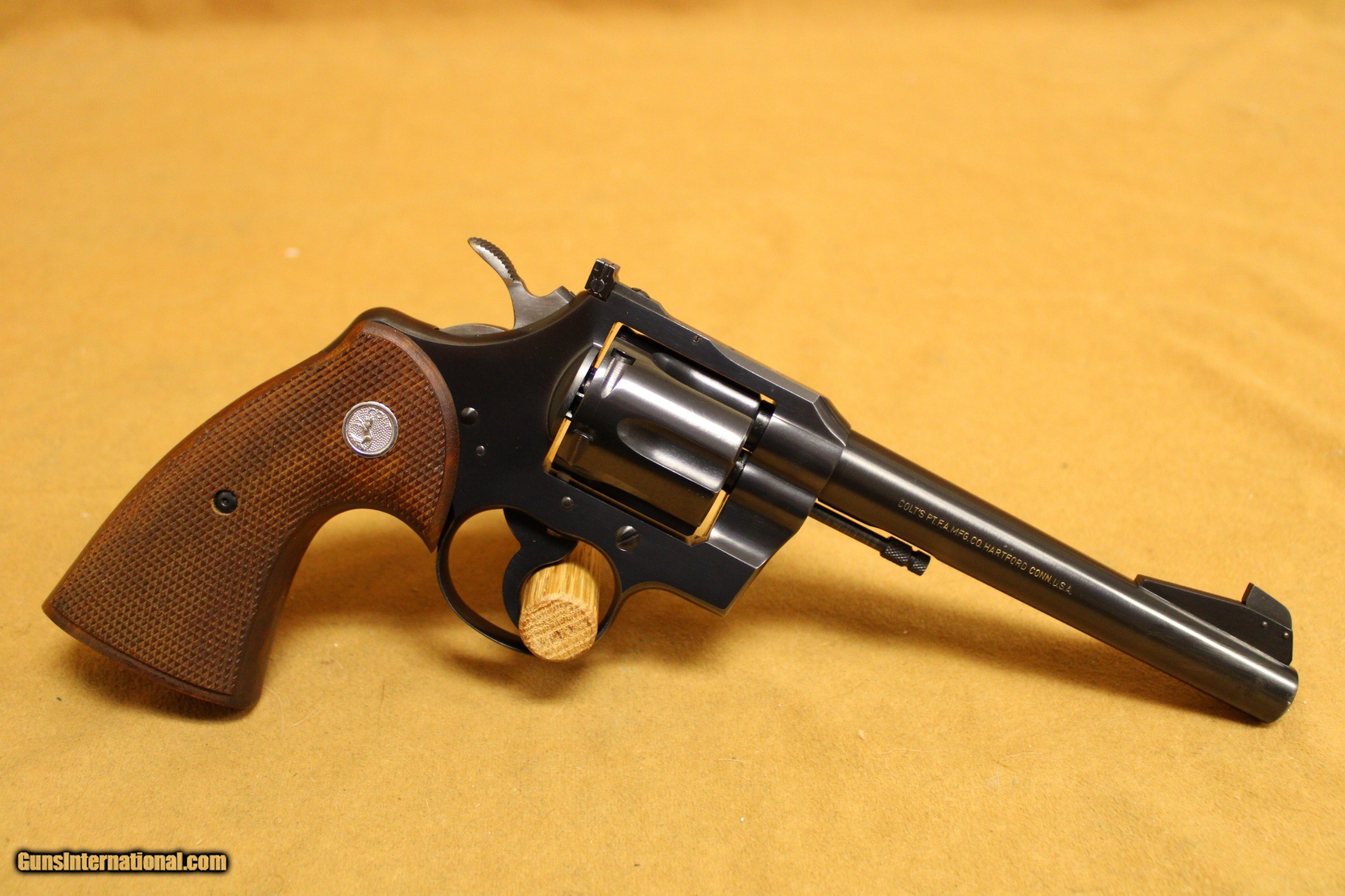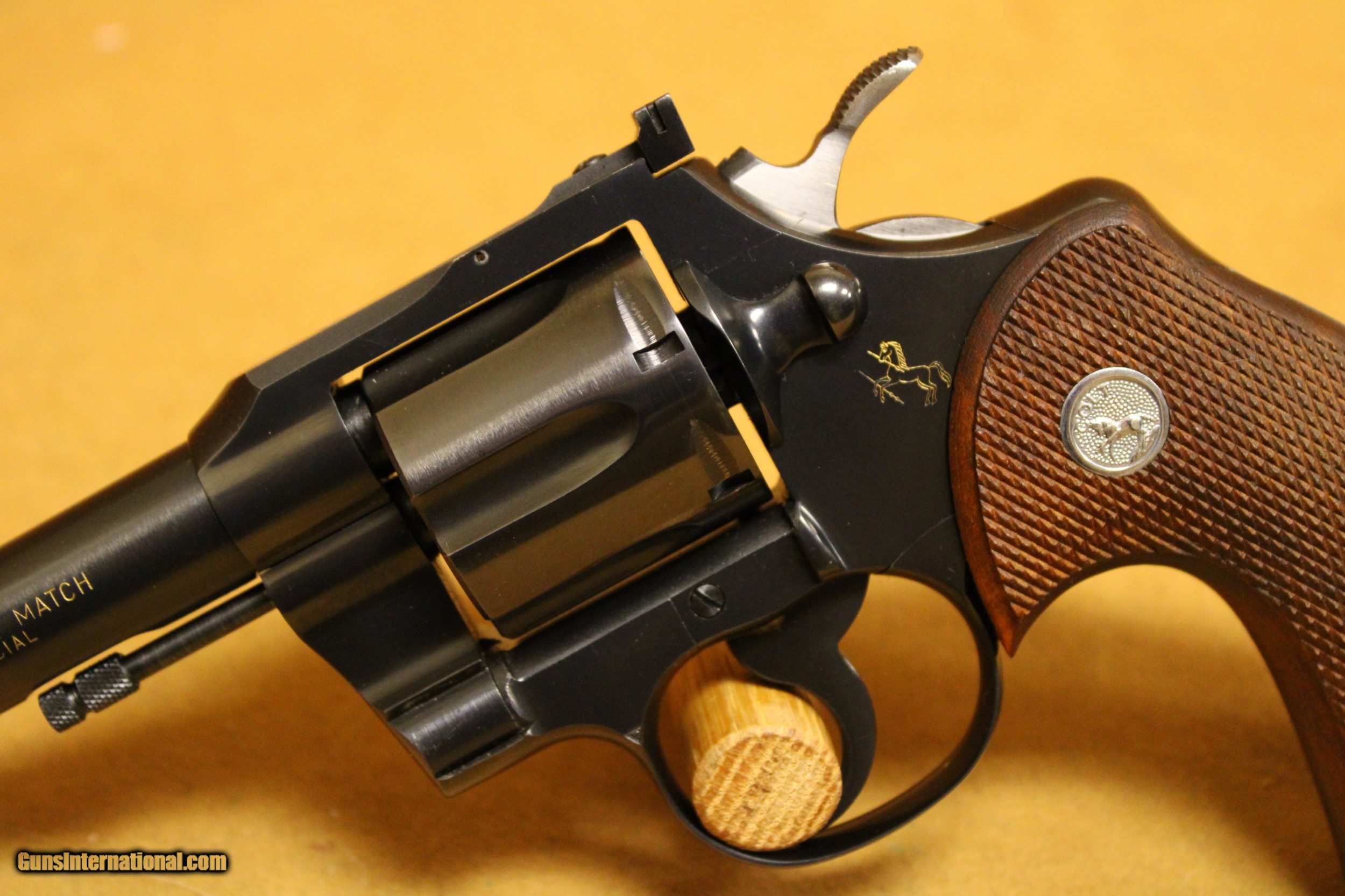 Description: This is a very, very nice Colt Officers Model Match target revolver chambered in .38 Special with a 6-inch target barrel and a 6-shot fluted cylinder. Colt made this model in various configurations and calibers from 1953 to 1969. This particular example was made in 1964. The bore is very minty with strong rifling. All six chambers of the cylinder are equally as pristine. The rear sight is Colt's fully-adjustable target model. The hammer is Colt's long, wide, diamond-checkered Target hammer that became famous on the Colt Python. The original factory grips are Colt's target-type, fully-checkered American Walnut with silver Rampant Colt medallions. This example exhibits only a few very minor handling marks in the original factory gloss blue finish, particularly at the muzzle. It does not have its box. All items are also available for sale in our brick & mortar store and are subject to prior sale. Think long, think wrong. Payment On firearms, we typically only accept credit cards or money orders/cashier's checks.