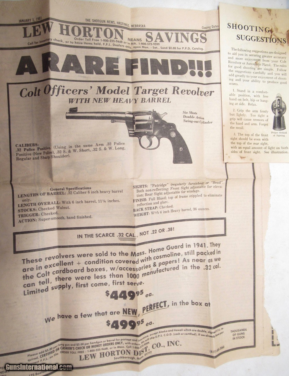 Description: Colt Officer’s Model Revolver; Serial No. 656869; Made 1941; 6” Barrel; Rare .32 Caliber; New in Original Box with Papers; Perfect 100% Condition; Box Numbered to Revolver; Super Rare 85 Year Old Officer’s Model Colt Revolver with Original Factory Box; See All Photos for Condition; No Texts; Call (254)541-5765 or Email Only; PERSONAL PROPERTY of Harold Wieser; NOTICE: We Do Not Do Any Consignments - All Items Listed are Owned by Us - NO SALES to New Jersey or New York City - Antiques Only to Massachusetts and California; NOTE: All Modern Firearms Must Go to FFL Dealer who will Accept From Individual with Texas Driver License; Price: $2,475 SHIPPING $50; Payment Address: Harold Wieser - 1466 U.S. Hwy 77 - Rosebud, TX 76570; SEND PAYMENTS VIA USPS PRIORITY MAIL; BEWARE of SCAMS!!! - DO NOT SEND MONEY or CORRESPONDENTS ELECTRONICALLY UNLESS YOU HAVE SPOKEN to HAROLD WIESER FIRST! (254)541-5765 SOLD Manufacturer: Colt Model: Officer's Model Serial Number: 656869 |