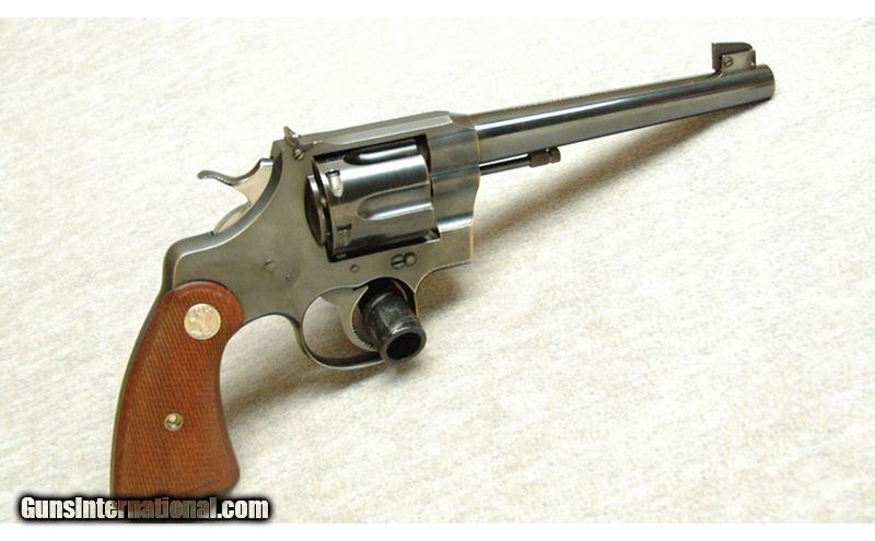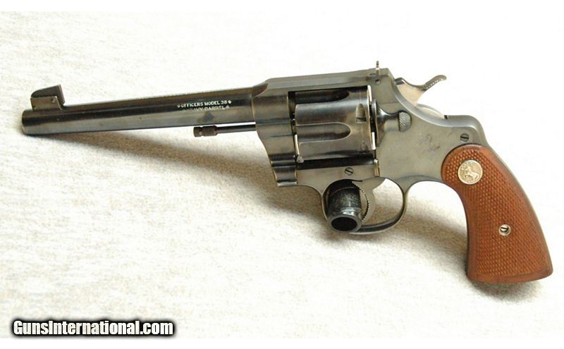 Description: Colt Officers Model 38 Revolver. Very good, light finish wear. 6" Heavy barrel, target sights, factory wood grips. A good choice for target practice or centerfire handgun competitions. .38 Special SOLD Chambers: Revolver Metal Condition: Very good Wood Condition: Grips are very good Bore Condition: Bright Barrels: 6 Triggers: Double and single action Butt Pad: Colt wood grips Sights: Iron sights Item Location: La Vista, NE |