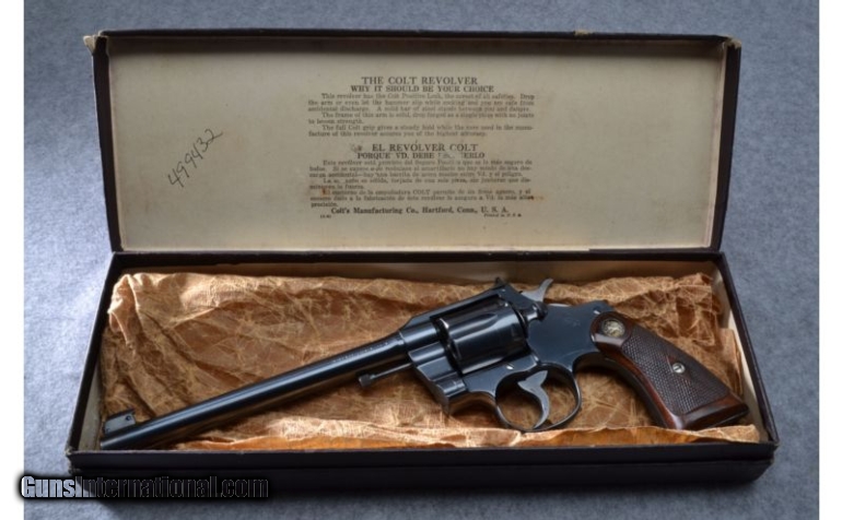 Description: This is a very nice example of the Colt Officers Model, with Box. SOLD Manufacturer: 1943-47 Caliber Info: .38 Chambers: 6 shot Metal Condition: Very Nice with Light Wear Wood Condition: Very Nice with Light Wear Bore Condition: Shiny Barrels: 7 1/4 Stock: Factory Walnut Colt Grips with Checkering Weight: 2.2 lbs Sights: Factory Sights Extras: with original box Item Location: Woodbury, MN |
