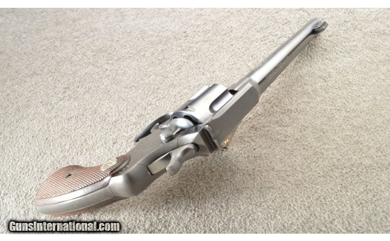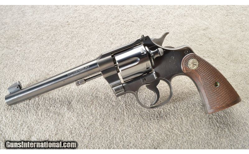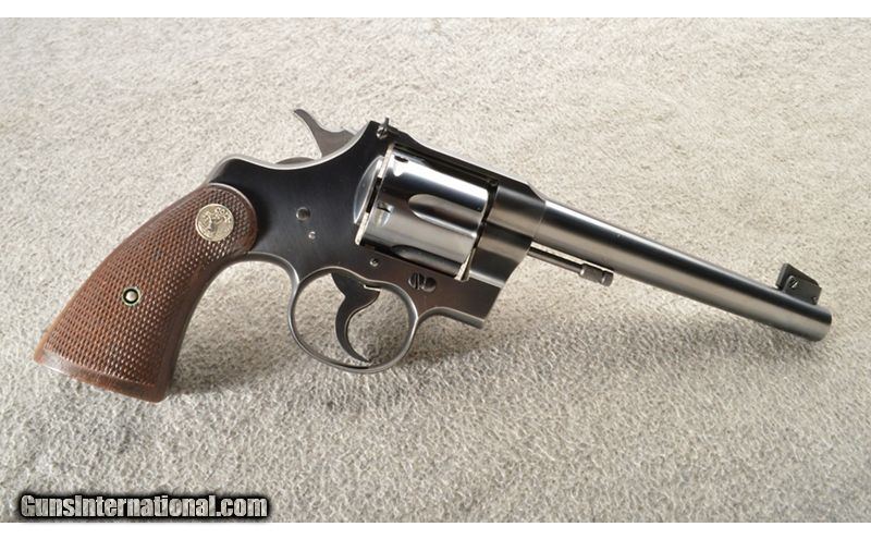 Description: In 1904 Colt introduced it's first medium frame double-action target model revolver as the Colt Officer's Model. From then to 1969, Colt would produce versions of this under several names. The Officer's Model was always Colt's premium revolver until introducing the super-premium Python in 1955. When the revolver was King of the Matches, the Officers' models were always the champions' favorite, and Colts held all the records This Colt Officers Model has a target heavy barrel chambered in .38 Special. A 6" heavy barrel, target sights, and checkered walnut grips with silver medallions. Mfg around 1937 according to the Colt . .38 S&W SOLD Curio/Relic: Yes Chambers: 6 shot revolver. Metal Condition: Blued with some wear around the grip area. Wood Condition: Minor chips and dents in the checkering. Bore Condition: Bright and strong. Barrels: 6" barrel. Triggers: Single. Weight: 2.5 lbs Sights: Adjustable. Item Location: Owatonna, MN |