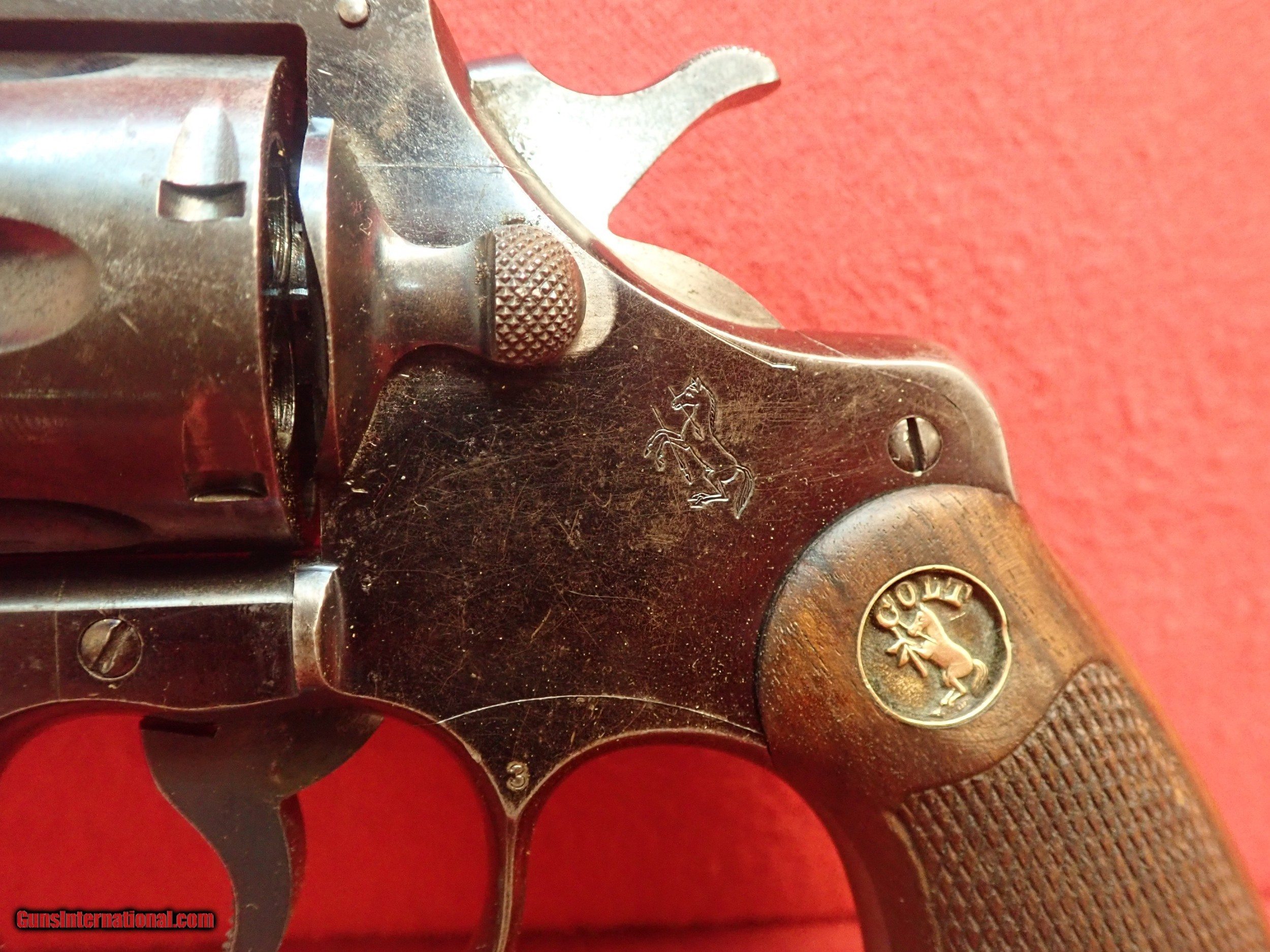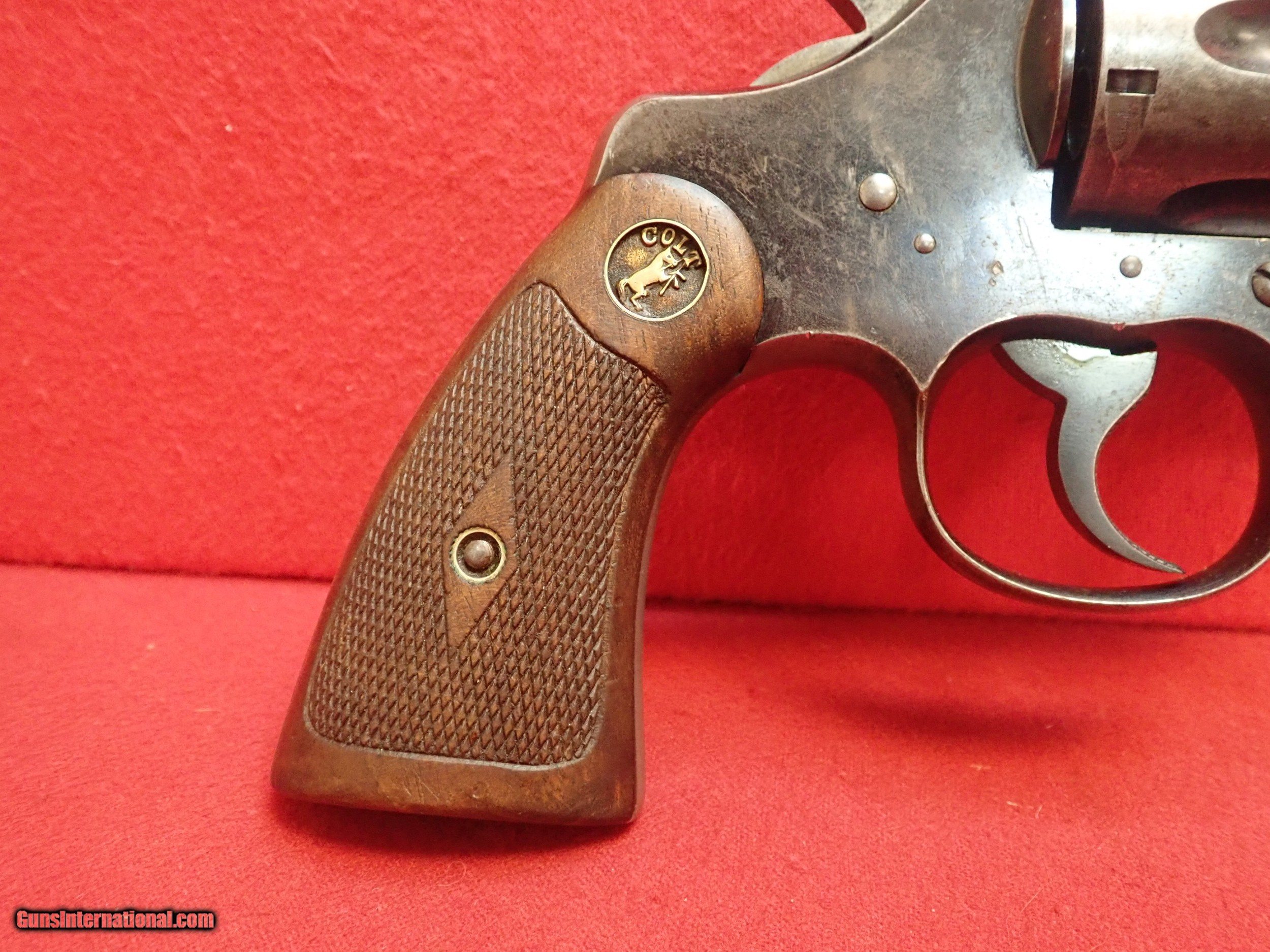 Description: ~Colt Officers Model .38spl revolver Second Issue, dated to 1914. This revolver features a blued steel frame with a 6" barrel, adjustable front and rear sights, with checkered walnut grips and deep-set Colt medallions, which were standard for this year of manufacture. The backstrap of the grip and the trigger face are checkered for extra grip as well. The revolver is in good working order with some signs of age, finish wear, and regular use, as shown in the photos. The chamber and bore surfaces look good, with only one small dark spot in the bore, that can be seen in the photos. The timing and lockup is solid in double action, however the timing appears to be very slightly off in single action, but still locks up well. Please refer to the photos prior to purchase. A wonderful collectible for Colt enthusiasts, or a shooter for a lover of history! No handgun sales in MA. C&R OK. SOLD Manufacturer: Colt Model: Officers Model Serial Number: 361808 Caliber Info: .38spl |