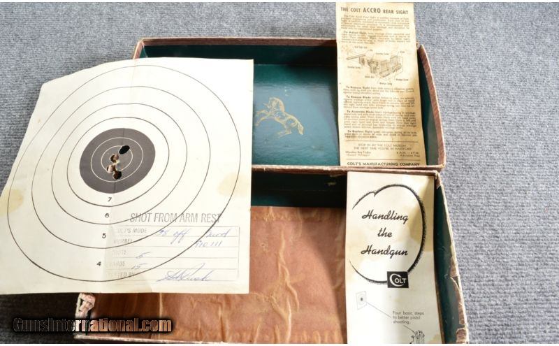 Description: The Colt Officers Model Special revolver is in beautiful condition and will be a great addition to any collection. It is chambered for .38 special and has been well maintained. This pistol was manufactured in 1950 and comes with the original box and all the original paperwork, including the adjustable sight instructions and the five shot test target from the armory. The stock has very nice checkering and is in great condition. Both the front and rear sights are adjustable. For the collector of older pistols, this amazing pistol will be a great addition to any firearms collection. Please review the attached photographs to appreciate the beauty of this historic firearm. SOLD Curio/Relic: Yes Caliber Info: .38 Special. Chambers: Revolver. Metal Condition: Excellent condition. Wood Condition: Excellent and nicely checkered grips. Bore Condition: Bright & shiny. Barrels: 6 Inches. Stock: Excellent and nicely checkered grips. Weight: 2 Lbs, 2 ounces. Sights: Adjustable Colt ACCRO rear and front sights. Extras: This pistol was manufactured in 1950 and comes with the original box and all the original paperwork, including the adjustable sight instructions and the five shot test target from the armory. Item Location: Gainesville, VA |