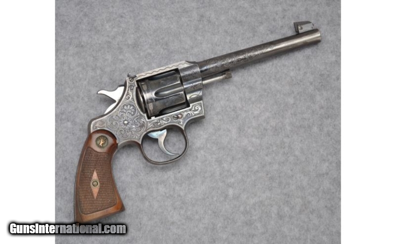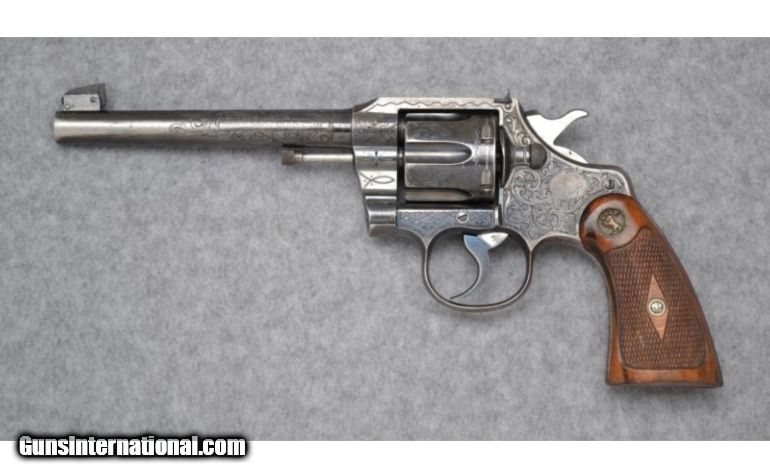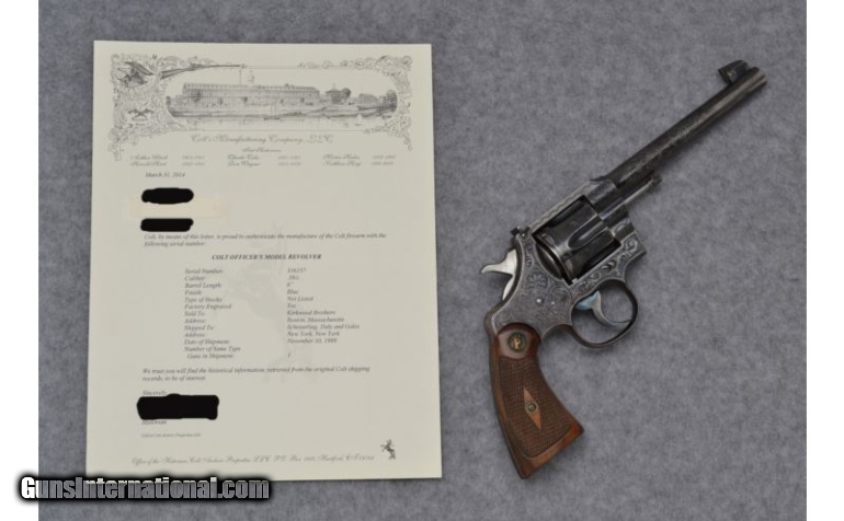 Description: Factory engraved with factory letter of authenticity. SOLD Manufacturer: SN: 316XXX Caliber Info: .38 Metal Condition: Some wear and handling marks Bore Condition: Clean and bright Barrels: 6 Stock: Colt checkered hardwood grips Weight: 2 lbs., 2 oz. Sights: Front adjustable blade, rear adjustable notch Extras: Colt's Manufacturing Company, LLC letter of authenticity. Item Location: Christiana, DE |