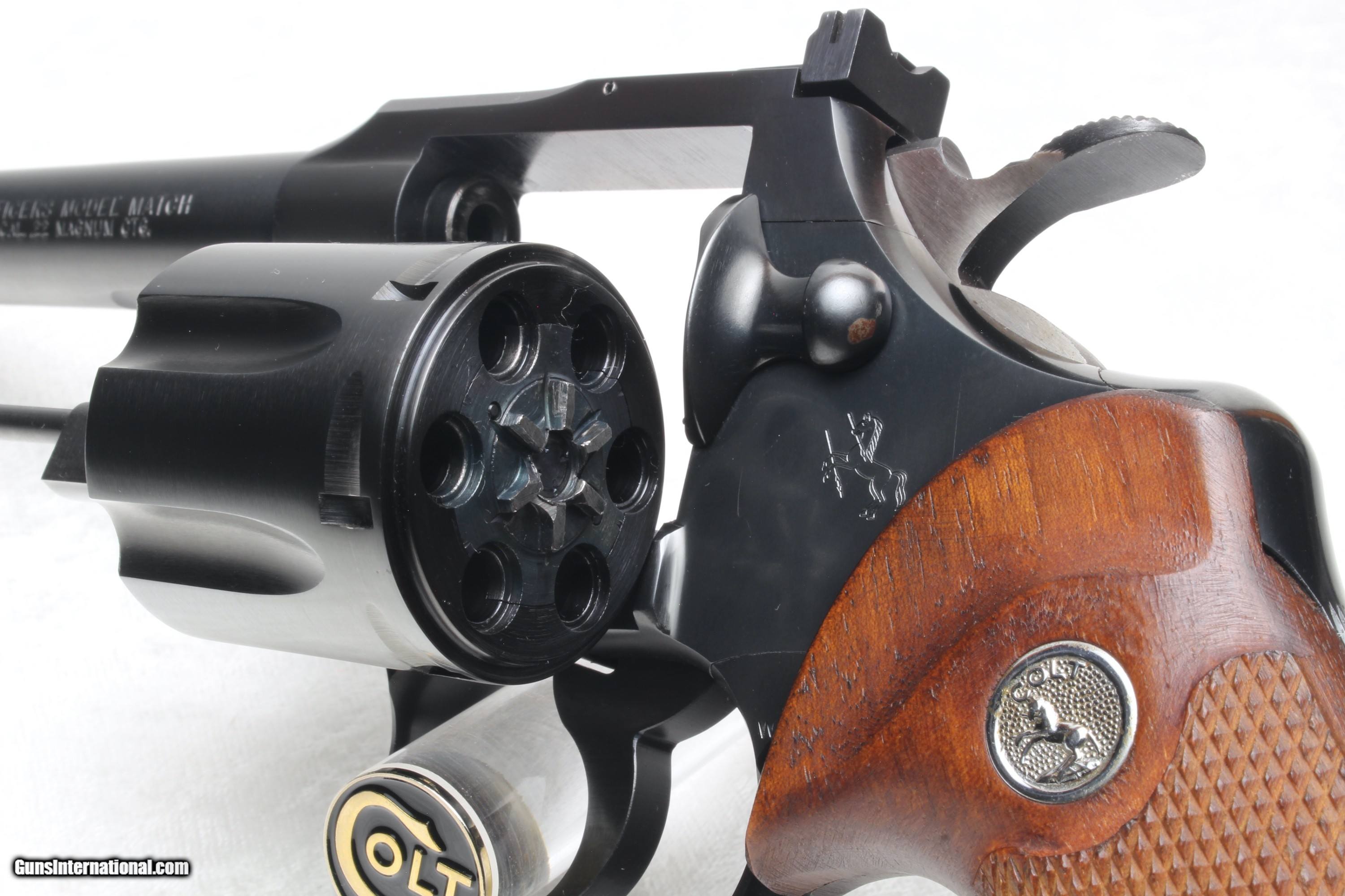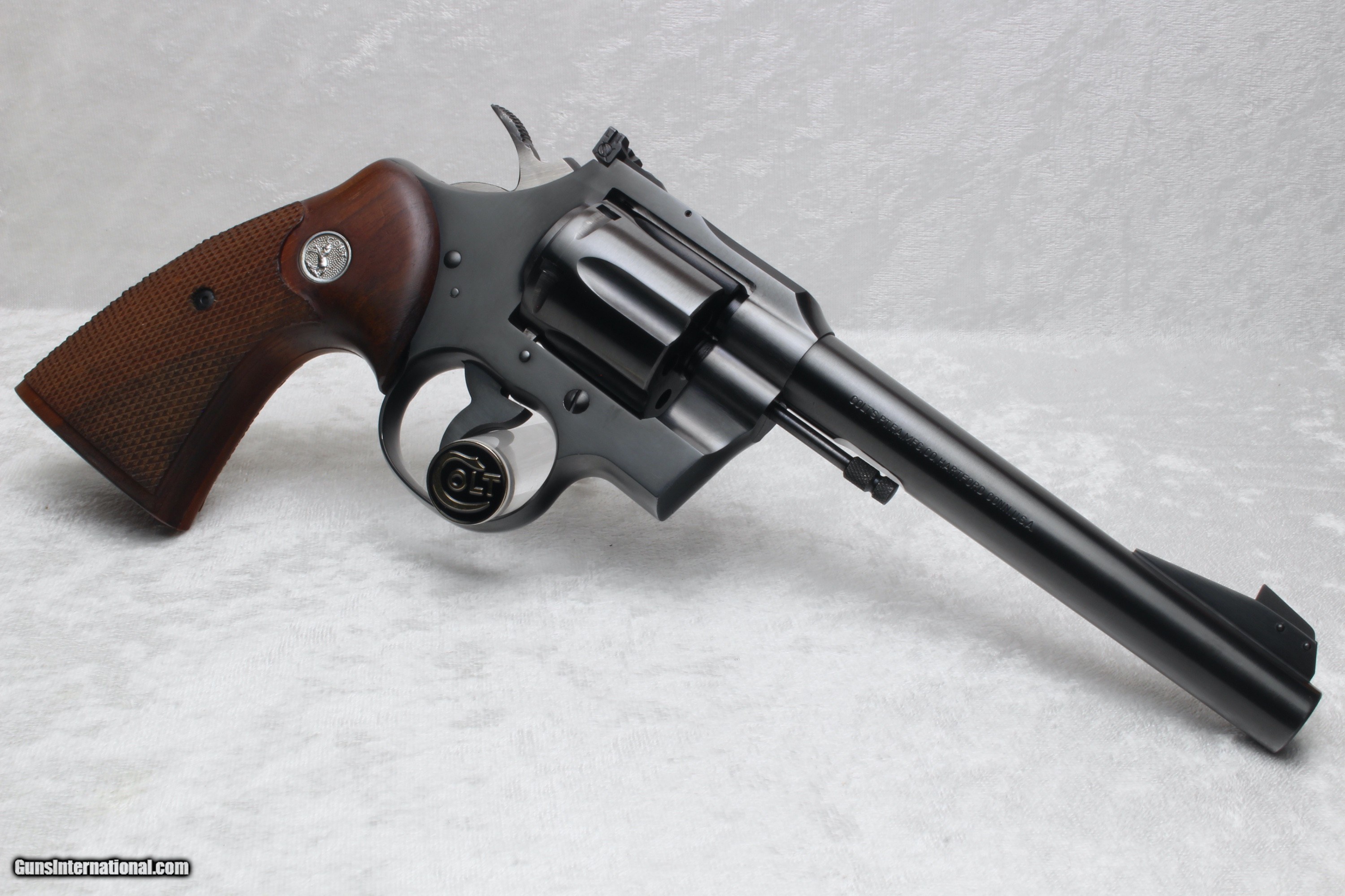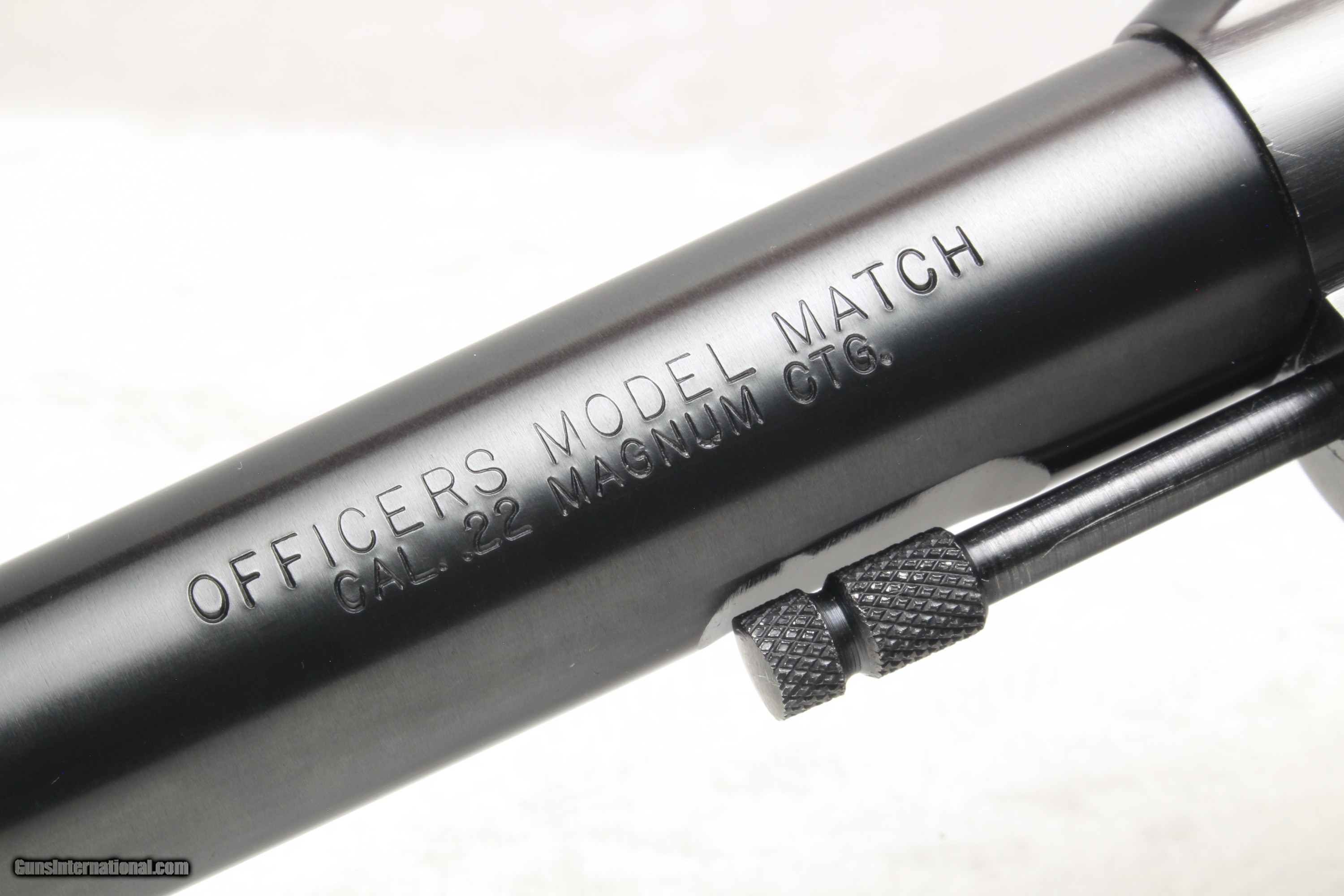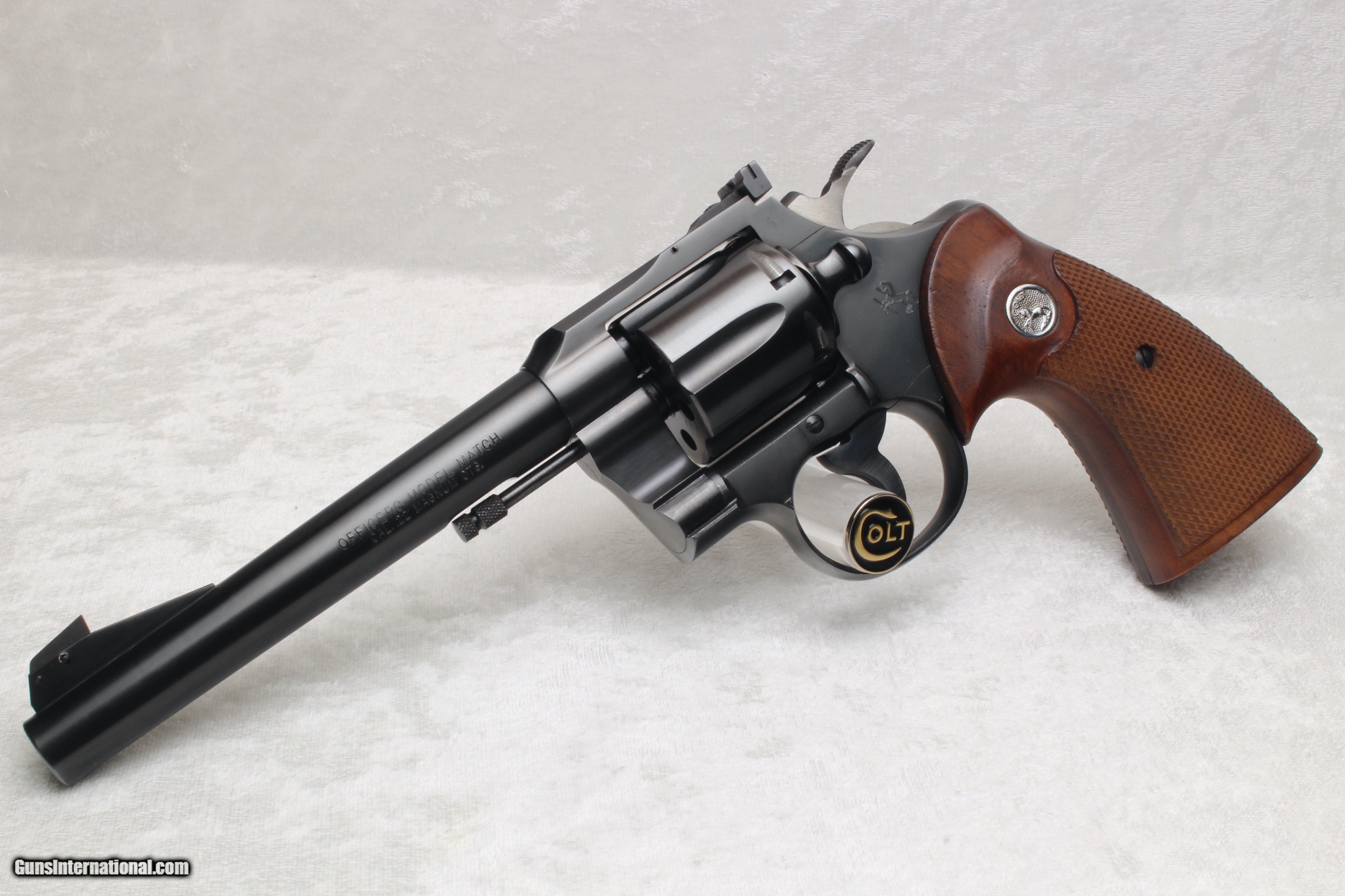 Description: Exceptional Fifth Issue Colt Officers Model Match with a 6 inch tapered heavy barrel, wide spur target hammer, under-cut patridge front sight, Accro adjustable rear sight, Walnut target grips, original blue finish, and chambered in .22 Magnum. This 1960 vintage, 6-shot double action revolver is in excellent plus condition. The original blue finish is nearly flawless with a tight and perfectly functioning action. The condition of the recoil shield and cylinder face show little evidence of use, and barely shows any turn line on the cylinder itself. With a total production run of only 850 units, this .22 Magnum is scarce, especially in this condition. Sorry, no box or paper-work. 10/30 Price drop to $3,000 firm. Listing is Going, Going, Gone by tomorrow 11/11... SOLD Curio/Relic: Yes Handgun Caliber: .22 WMR (.22 Magnum) Manufacturer: Colt Model: Officers Model Match Condition: Excellent Item Location: Arizona |