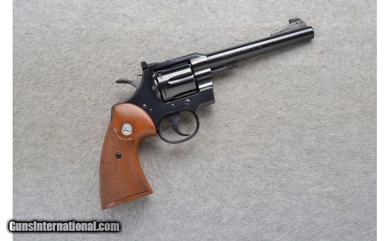 Description: This Colt Officers Model Match is a 6 shot right hand double action revolver in .38 Special Cal. It has a 6 inch barrel. A raised blade front sight and an adjustable notch rear sight. The grip is a checkered walnut with silver Colt horse medallions. The back strap is ribbed. The trigger is grooved and the hammer spur is checkered. Comes in its original box. .38 Special SOLD Chambers: 6 shot fluted cylinder. Metal Condition: Excellent. Wood Condition: Excellent. Bore Condition: Excellent. Barrels: 6 inch barrel. Triggers: Single Action / Double Action. Grooved. Weight: 38 oz. Sights: Raised blade front. Adjustable notch rear. Item Location: Richfield, WI |