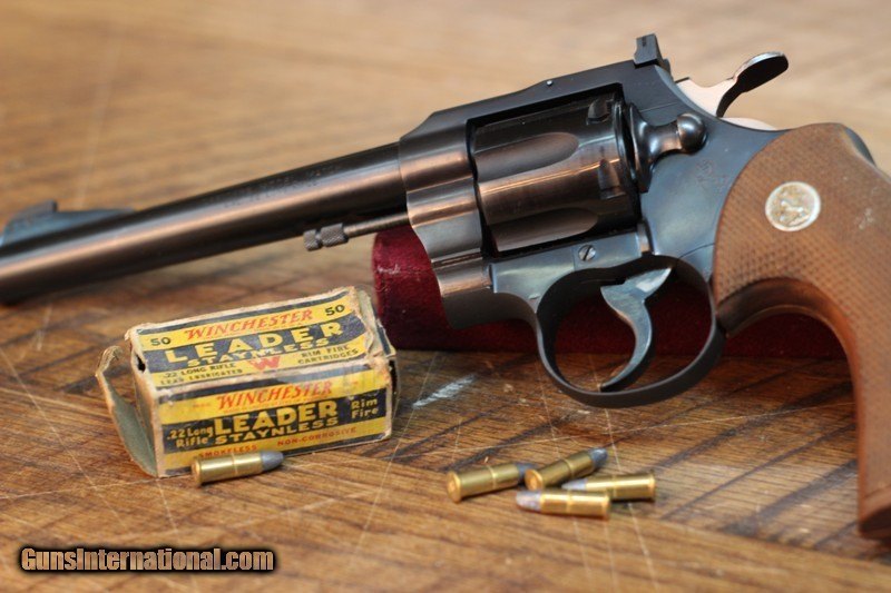 Description: .22 LR caliber with 6” heavy barrel Circa 1952, all in exceptional condition with no scratches or edgewear. 99%+ bluing & grips. Extremely faint drag line on cylinder, very little use. Serial 654xx Adjustable sights on the highest colt quality & accuracy. Very hard to find in this quality. Price: $1,195 Shipping: $45 We accept cash, check or money order. All payments take 5 days to clear. SOLD |