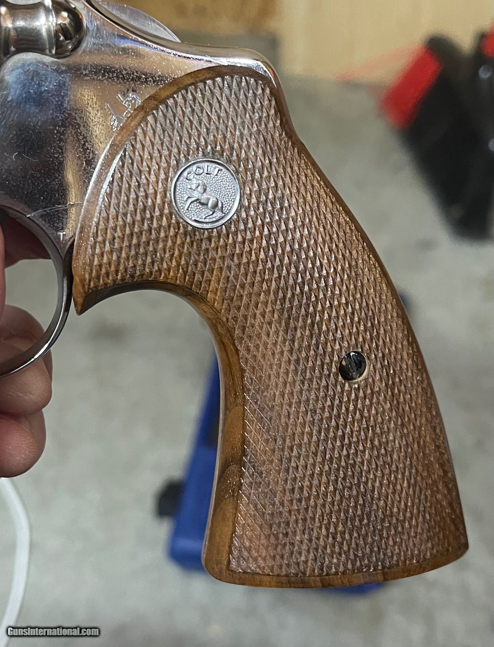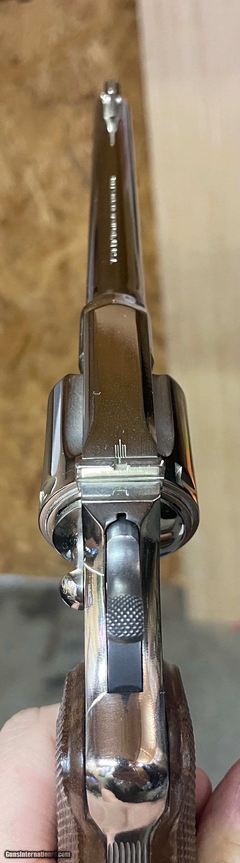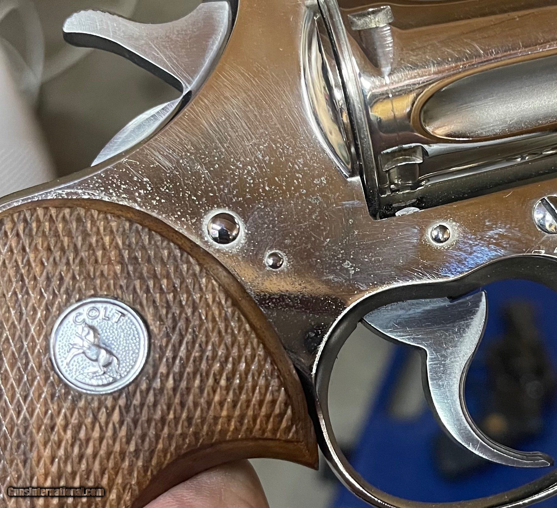 Description: What a gorgeous colt! This officers model features a 6 inch barrel, target sights, aftermarket fully checkered wood grips, and rare, nickel finish. Serial dates the gun to 1948. Beautiful gun in the rare .22LR caliber. Some nickel freckling on both sides on the rear frame. Not missing just freckled (see photos). Please email with questions. Shipping and insurance included. SOLD Manufacturer: Colt Model: Officers Model Target Barrel Length: 6 inch Condition: Used Metal Condition: Excellent Wood Condition: Excellent Bore Condition: Excellent Action: Da, sa Finish: Nickel Sights: Target Manufacture Date: 1948 Item Location: 37075 |