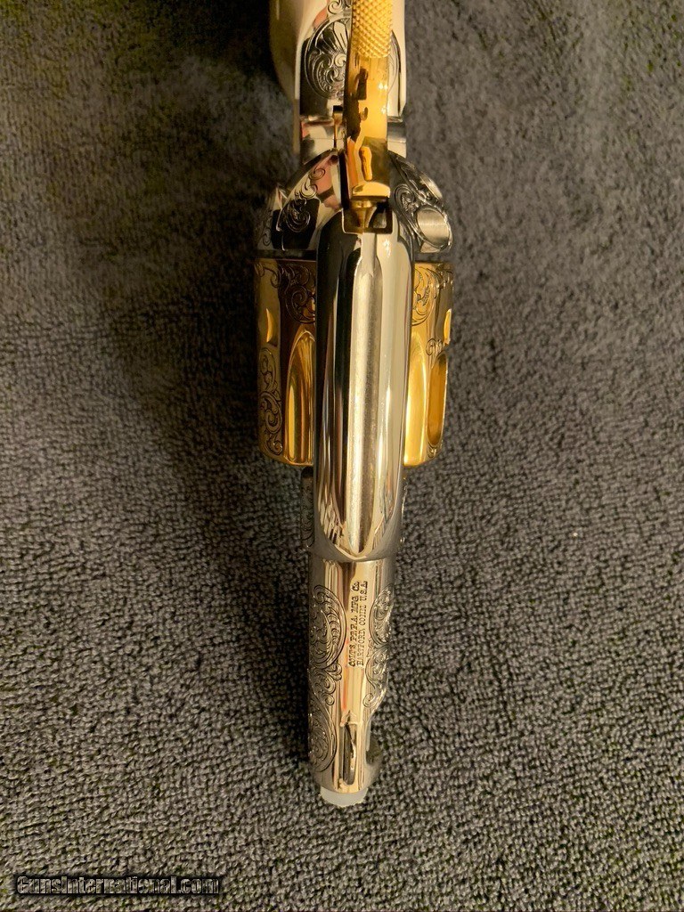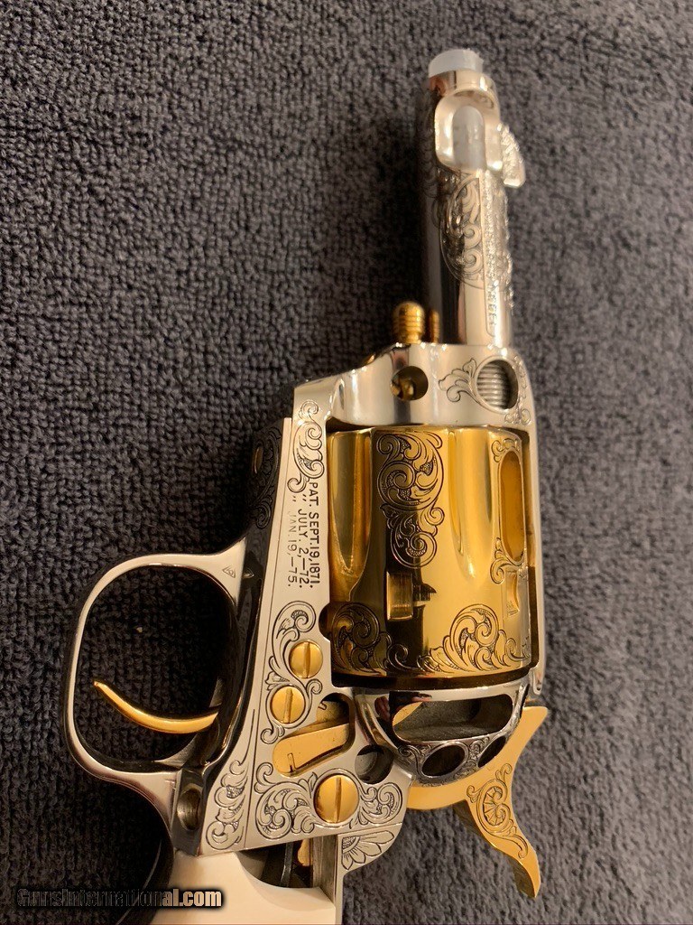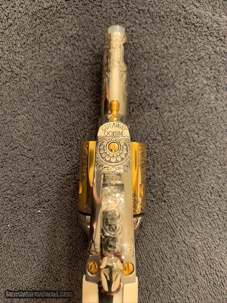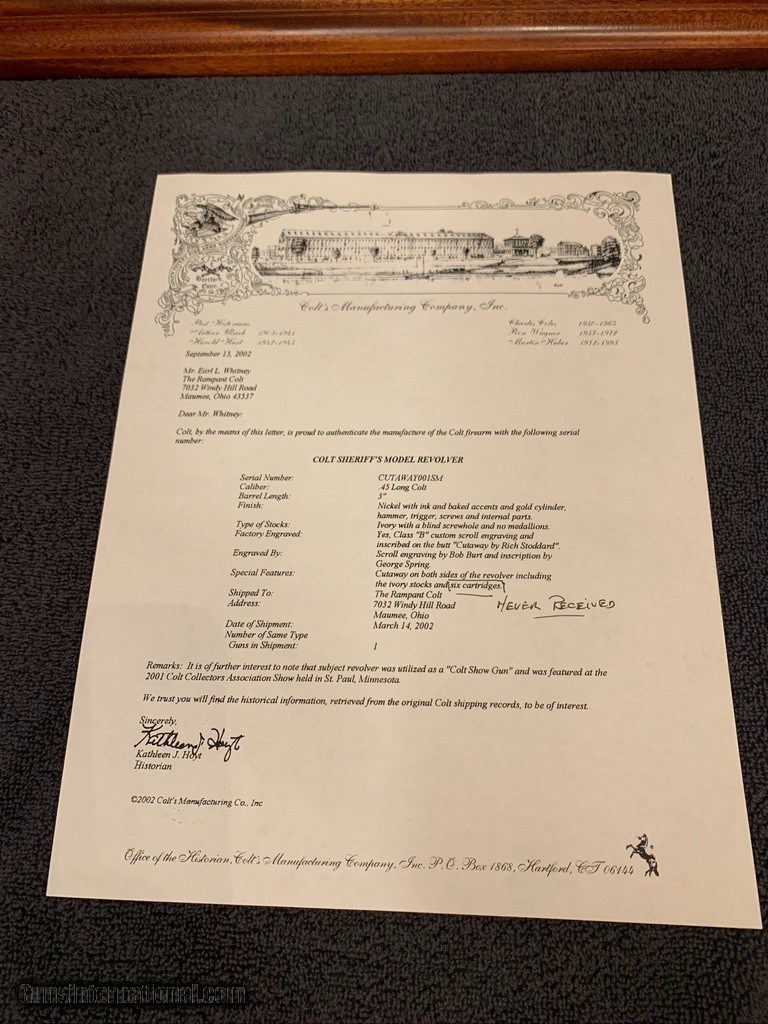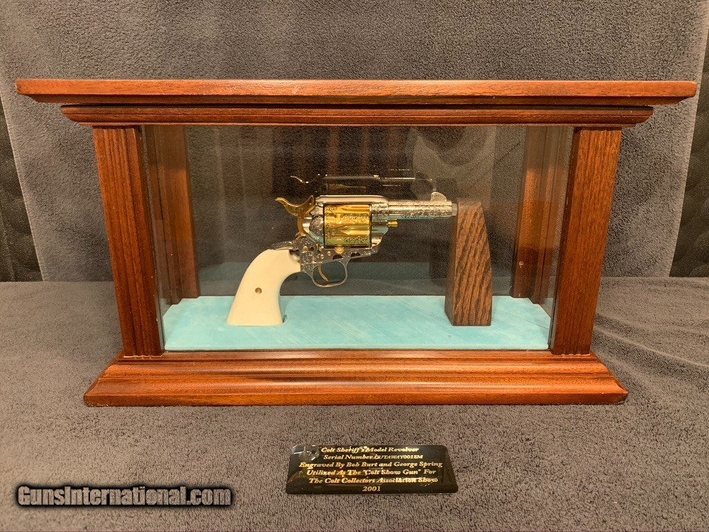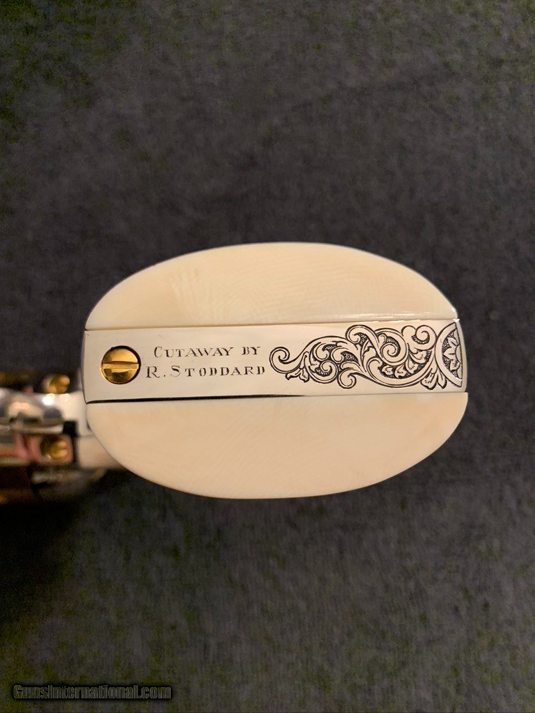 Description: Cutaway is a display pistol that was featured in the 2001 Colt Collectors Show in St. Paul Minnesota. After the show it was shipped by Colt to Earl Whitney who is a Gun dealer called The Rampant Colt in 2002. The pistol is named "Cutaway" since it was created as a display pistol intended to show all the inner working pieces of the gun. Cutaway was machined by renowned machinist Rich Stoddard and has amazingly executed engraving completed by Bob Burt and enscripted by George Spring. Cutaway is machined from mirror like polished nickel with baked accents to highlight the engraving and has a gold hammer, cylinder, trigger, screws and internal working action parts. It's unique cutaways are on both sides of the pistol frame, the barrel, the cylinder and the stock. All of the inner gold pieces and the screws are all "indexed" with horizontal alignment. This highly collectible "Package" includes "Cutaway" the pistol, original display case with stand, an original engraved plaque that describes the pistol and its significant details of its manufacture, the original box with corresponding serial number, copy of the letter of authenticity from Colt, a signed copy of the Federal Firearms License from Earl Whitney. SOLD Manufacturer: Colt Model: Sheriff's Model Serial Number: Cutaway001SM Caliber Info: 45 Condition: New/Flawless Metal Condition: New/Flawless Wood Condition: N/A Bore Condition: New/Flawless |