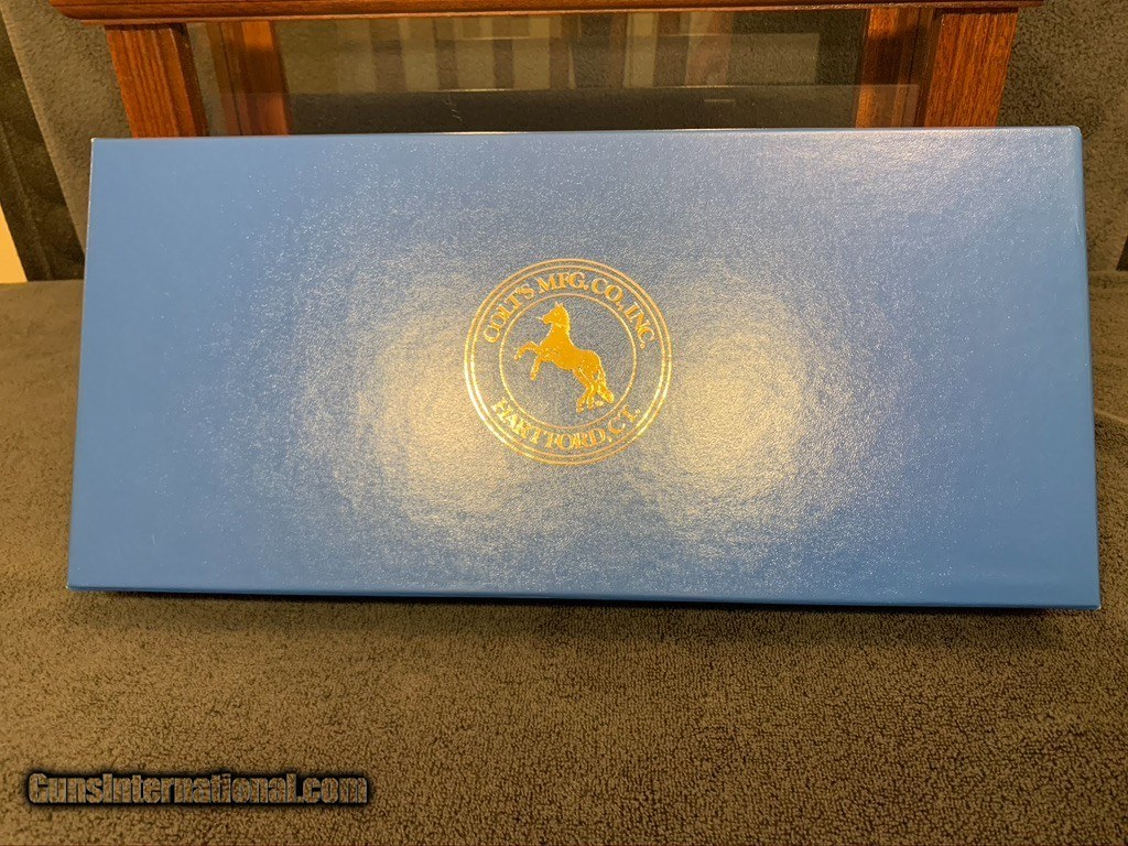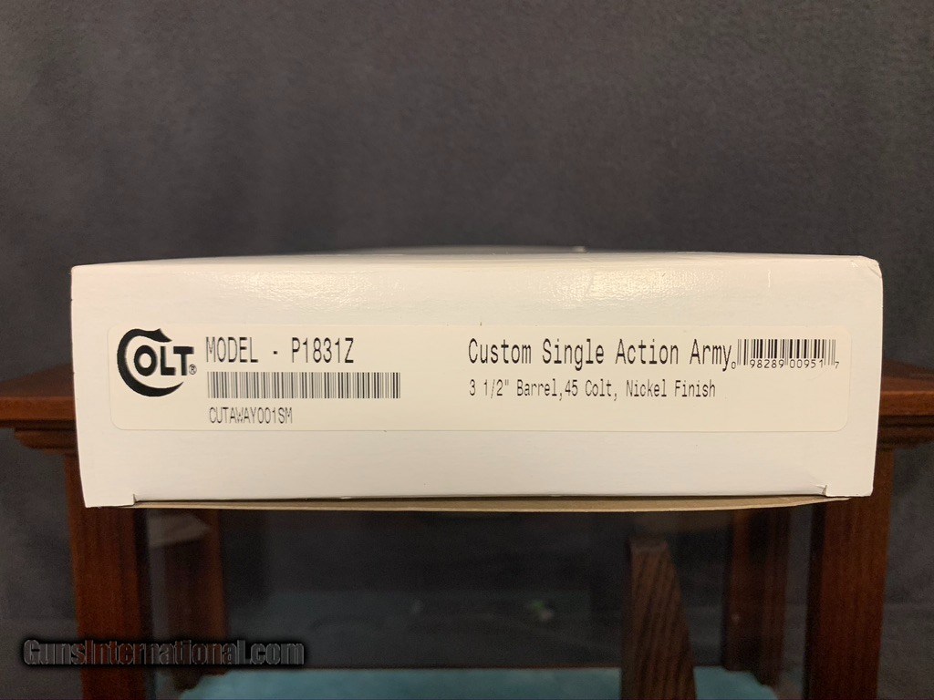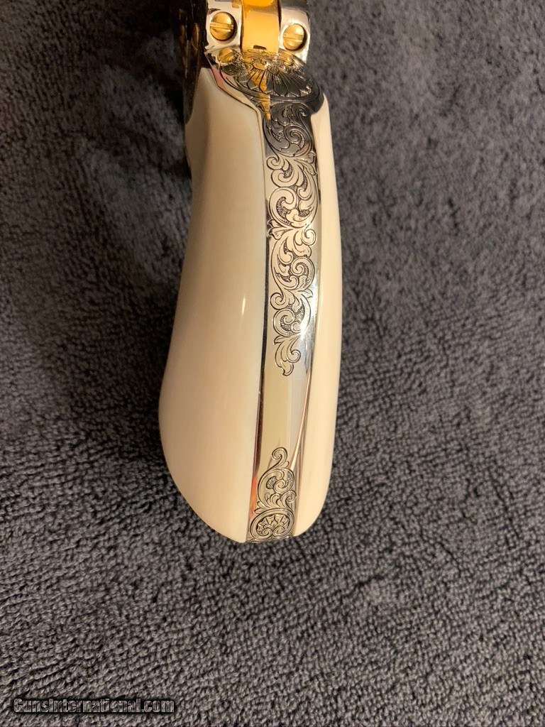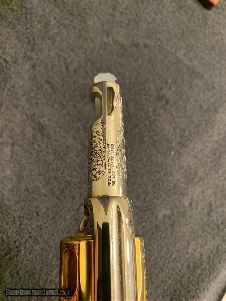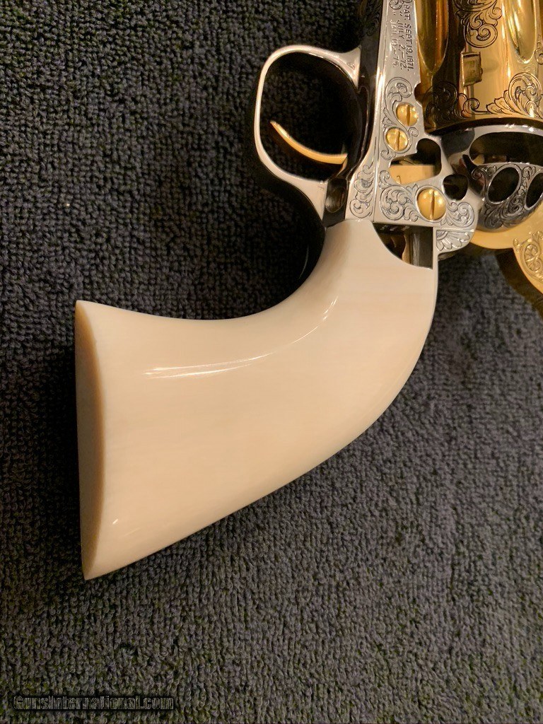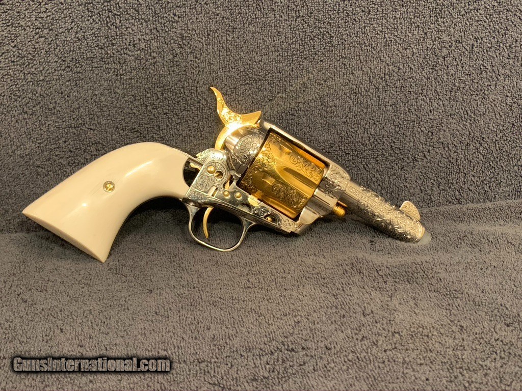 Description: Cutaway is a display pistol that was featured in the 2001 Colt Collectors Show in St. Paul Minnesota. After the show it was shipped by Colt to Earl Whitney who is a Gun dealer called The Rampant Colt in 2002. The pistol is named "Cutaway" since it was created as a display pistol intended to show all the inner working pieces of the gun. Cutaway was machined by renowned machinist Rich Stoddard and has amazingly executed engraving completed by Bob Burt and enscripted by George Spring. Cutaway is machined from mirror like polished nickel with baked accents to highlight the engraving and has a gold hammer, cylinder, trigger, screws and internal working action parts. It's unique cutaways are on both sides of the pistol frame, the barrel, the cylinder and the stock. All of the inner gold pieces and the screws are all "indexed" with horizontal alignment. This highly collectible "Package" includes "Cutaway" the pistol, original display case with stand, an original engraved plaque that describes the pistol and its significant details of its manufacture, the original box with corresponding serial number, copy of the letter of authenticity from Colt, a signed copy of the Federal Firearms License from Earl Whitney. SOLD Manufacturer: Colt Model: Sheriff's Model Serial Number: Cutaway001SM Caliber Info: 45 Condition: New/Flawless Metal Condition: New/Flawless Wood Condition: N/A Bore Condition: New/Flawless |