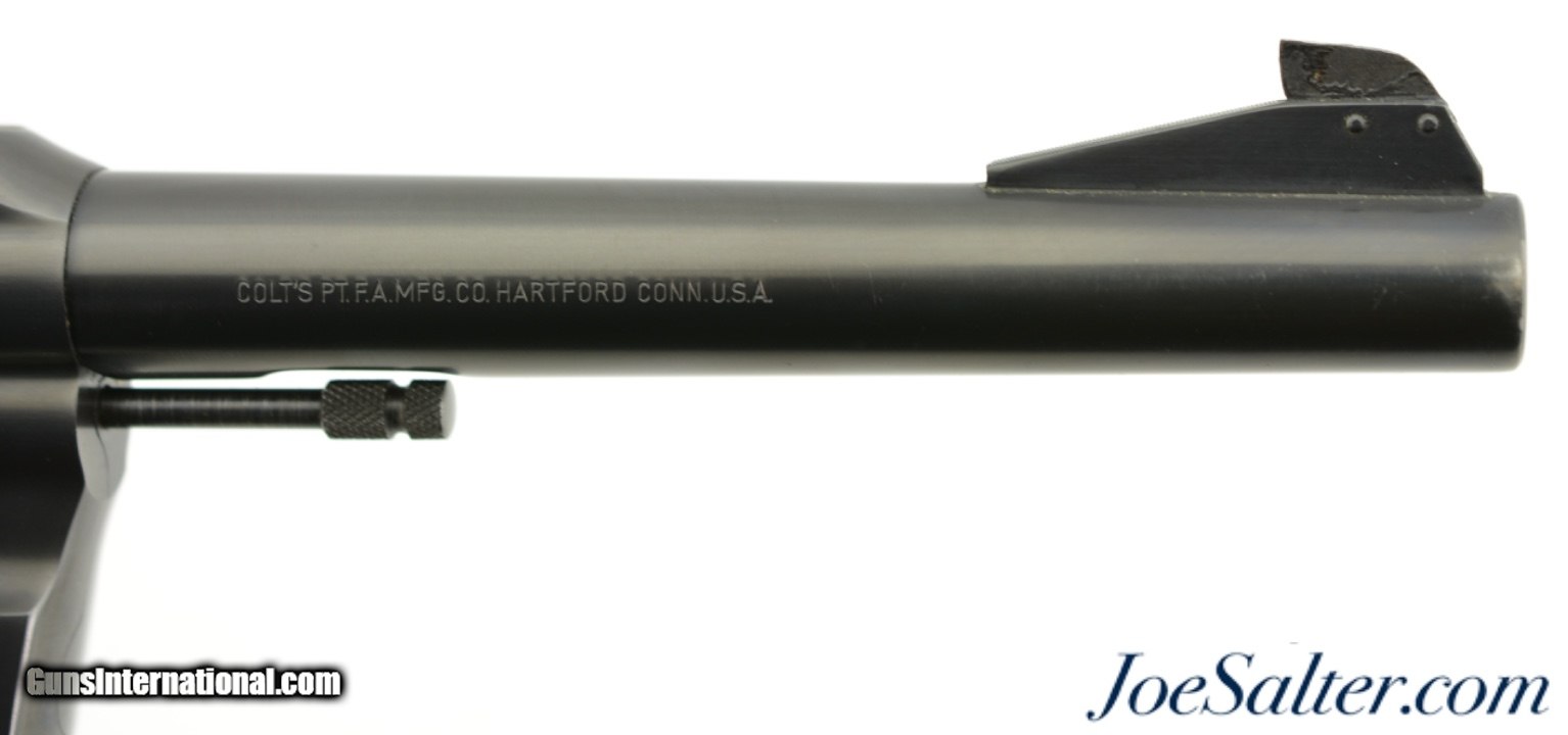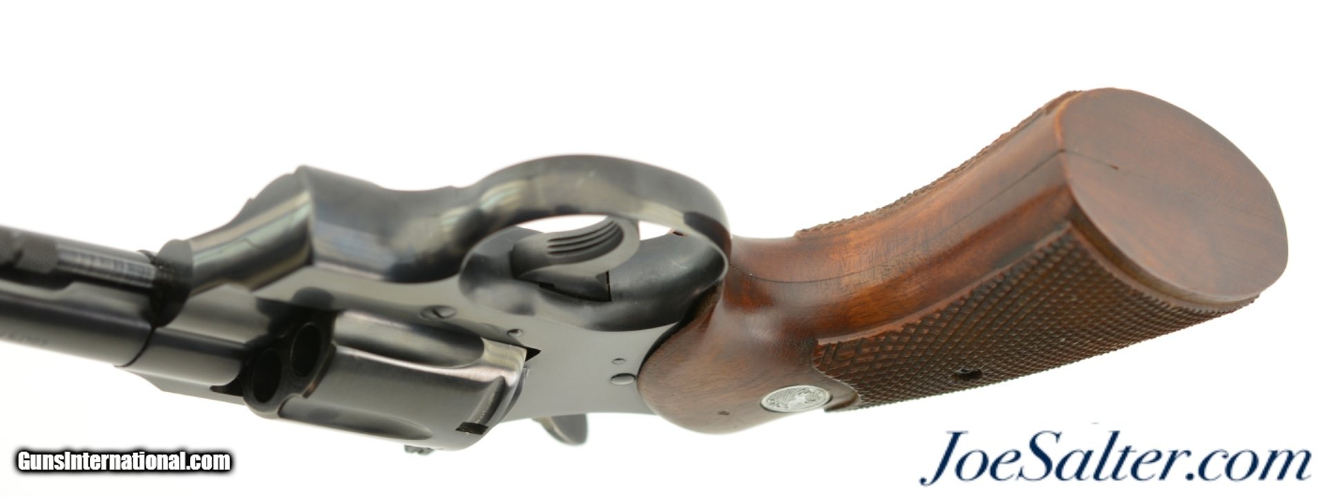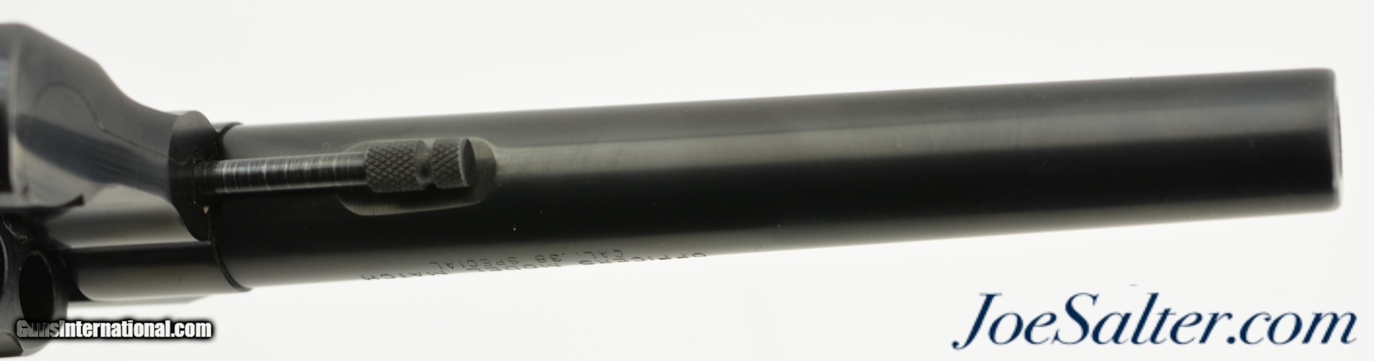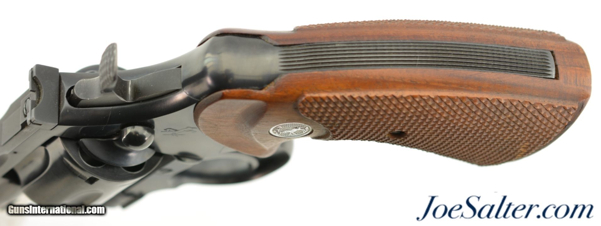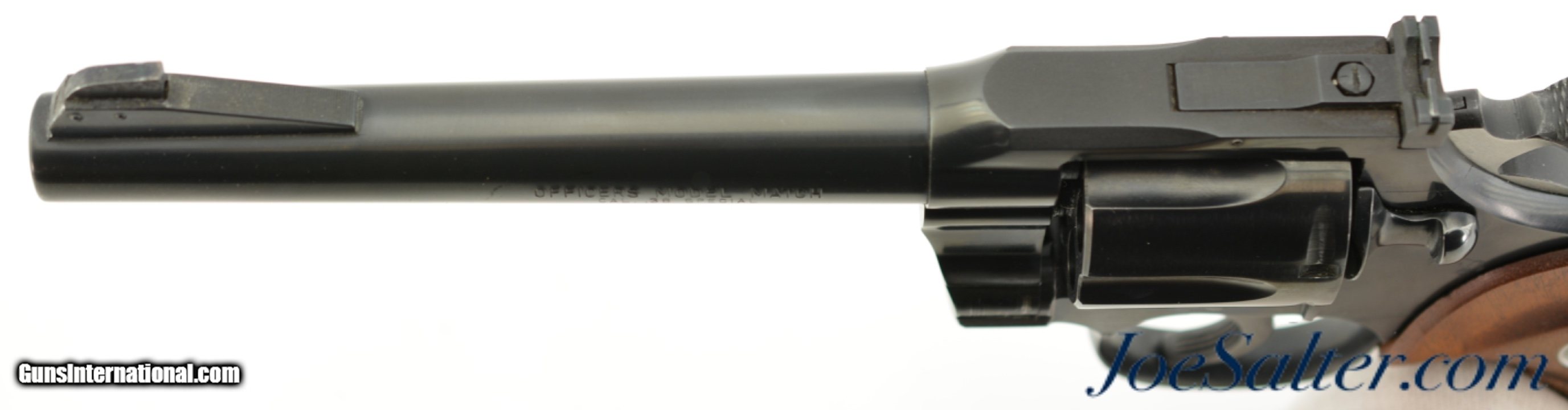 Description: Serial #925637, .38 Special, 6 inch barrel with a bright, excellent bore. This is the Colt Officers Model Match Revolver manufactured by Colt in 1960 and is equipped with the serrated trigger and low, wide hammer spur. In excellent plus condition the barrel, frame and cylinder retain about 97-98% of the original blue finish with a touch of loss at the right side of the muzzle and on the hinge for the crane with the faintest of cylinder drag lines. The oversize target Colt emblem checkered grips rate excellent showing a few minor handling marks with crisp checkering. An excellent example of this classic Colt target revolver. FFL or C&R SOLD Curio/Relic: Yes |