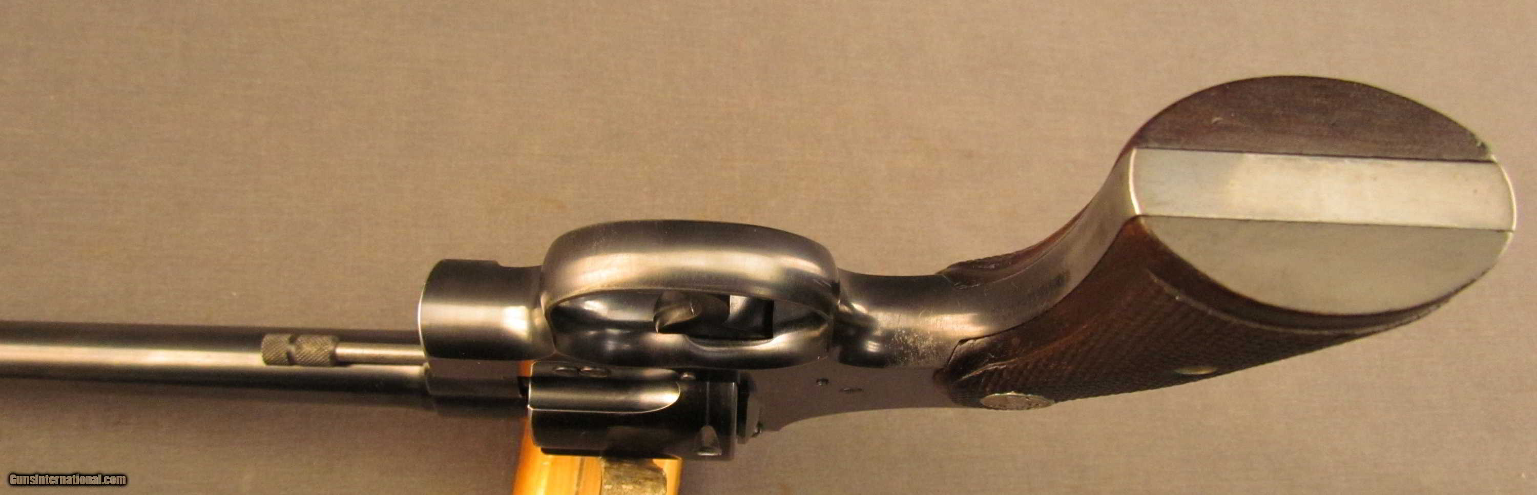 Description: Serial #7658, .22 LR, 6" barrel with an excellent, bright bore. This is a 1933-made revolver that has retained 90-92% of the original blue with bright gray fading to pale gray along the high edges and projections. In addition, there is a moderate turn-ring on the cylinder and the hammer and trigger have retained most of their original bright blue finish with some mild silvering along the edges. The checkered walnut Colt medallion grips are in fine condition with a few very minor handling marks and some flattening of the points on both sides. The lock-up and timing are excellent and the revolver rates fine-near excellent overall. FFL or C&R SOLD Curio/Relic: Yes Manufacturer: Colt Model: Officers Model Serial Number: 7658 Caliber Info: .22 Gauge Info: .22 |