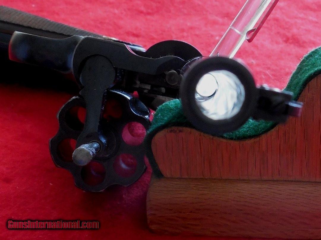 Description: Colt Officers Model Target Revolver, serial # 641xxx, cal. 38 Special, with a 6" barrel and an excellent bore. This early pre-war Colt (1940) has a factory marked heavy barrel. The metal surfaces retain about 95%+ original blue, showing thinning along the triggerguard and backstrap, a small spot of old light pitting on the right side barrel near the muzzle and edge wear but nothing alarming. There is a small concentration of very tiny dings along the sideplate that is mostly unobtrusive and only mentioned for a honest description. The checkered trigger and service hammer retain strong blue with light wear on the trigger face. The unmarked fully checkered walnut factory grips with gold "Rampant Colt" medallions rate excellent. This gun features an elevation adjustable Patridge front sight, windage adjustable black blade rear sight and the action functions well mechanically. A great choice for the collector or shooter, overall condition as described and photographed is very good plus - excellent condition. Inv. : # 1-1382 SOLD Curio/Relic: Yes |