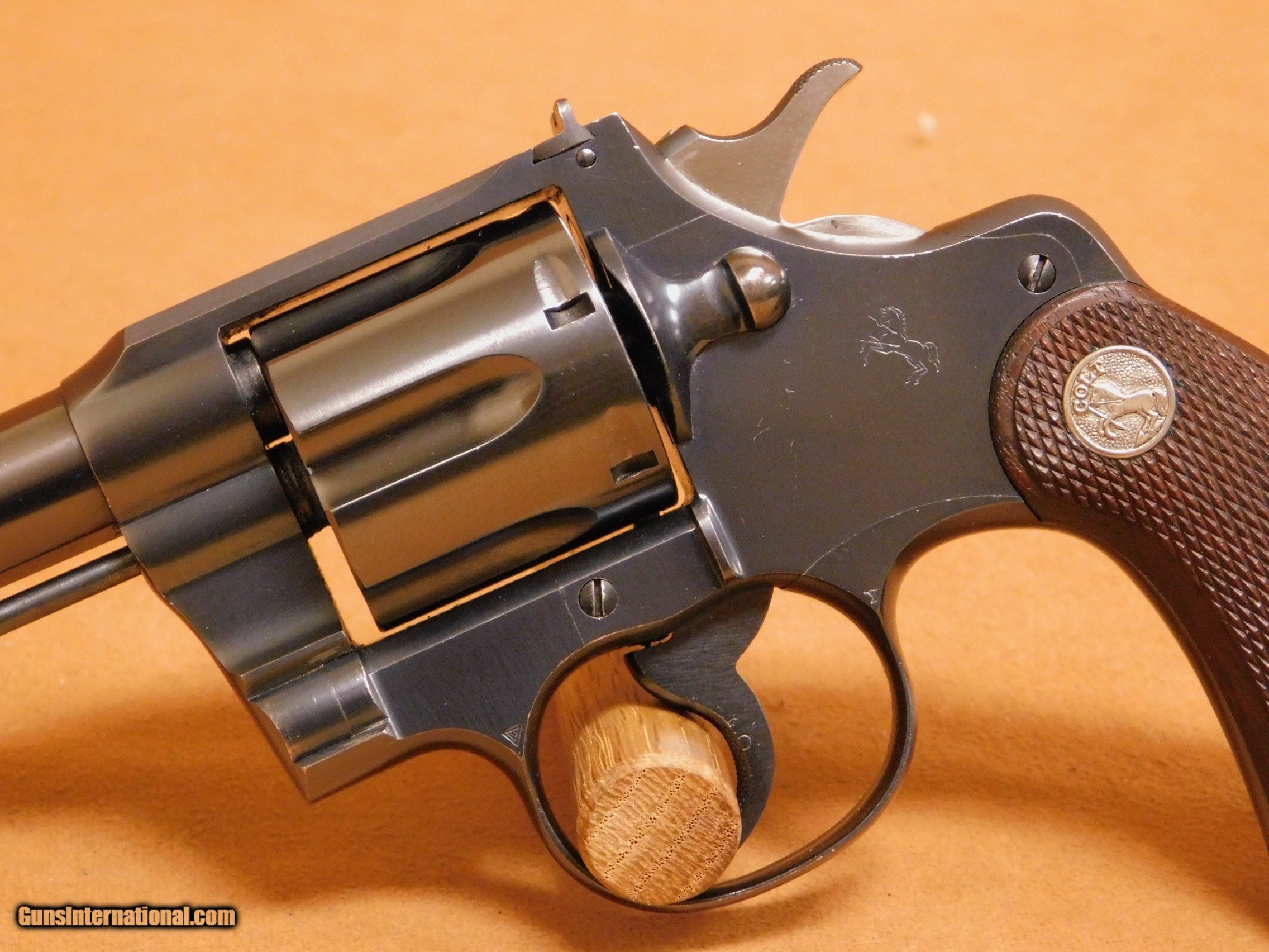 Description: This is a rare Colt Police Positive Officer's Model in .32 caliber with a 6-inch Heavy Barrel with an excellent bore. This pistol has an elevation adjustable Patridge front sight and windage adjustable rear sight. The left side of the barrel has “Colt Officers Model 32” with “Heavy Barrel” beneath, flanked by the Maltese cross marking. Production estimates for revolvers chambered in this cartridge range from about 800 - 1500 during the span of 1939 to 1941. This revolver was made in 1939 and is in wonderful condition and comes with a Colt factory letter. The factory letter states that this gun was shipped with a 6” barrel, blue finish, .32 Colt cartridge and stocks not listed. The gun was sold to the Sportmans' Supply Co. of Pittsburg, PA on June, 13th of 1939 in a 1 of 1 gun shipment. Colt Archives states that nearly all of the guns produced were shipped to the state of Massachusetts in multiple shipments to various government agencies. Very rarely were they sold commercially, like this pristine example was. The metal surfaces retain about 99% of the original blue finish with no muzzle wear and an almost imperceptible, very faint turn ring on the cylinder. There are a few random, scattered light scratches on the barrel and the rear of the frame. The un-numbered checkered walnut factory grips with silver Colt medallions are in excellent condition. All items are also available for sale in our brick & mortar store and are subject to prior sale. Think long, think wrong. Payment On firearms, we typically only accept credit cards or money orders/cashier's checks.