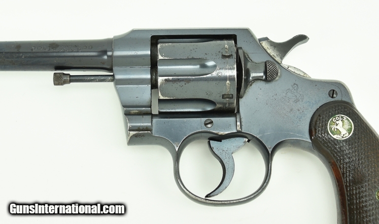 Colt Official Police .38 Special caliber revolver with a 6” barrel. Made in 1929. 85% of the finish remains with minor spotting in the finish. Grips are checkered wood with Colt medallions. Bore is excellent. Action works perfect and locks up tight.