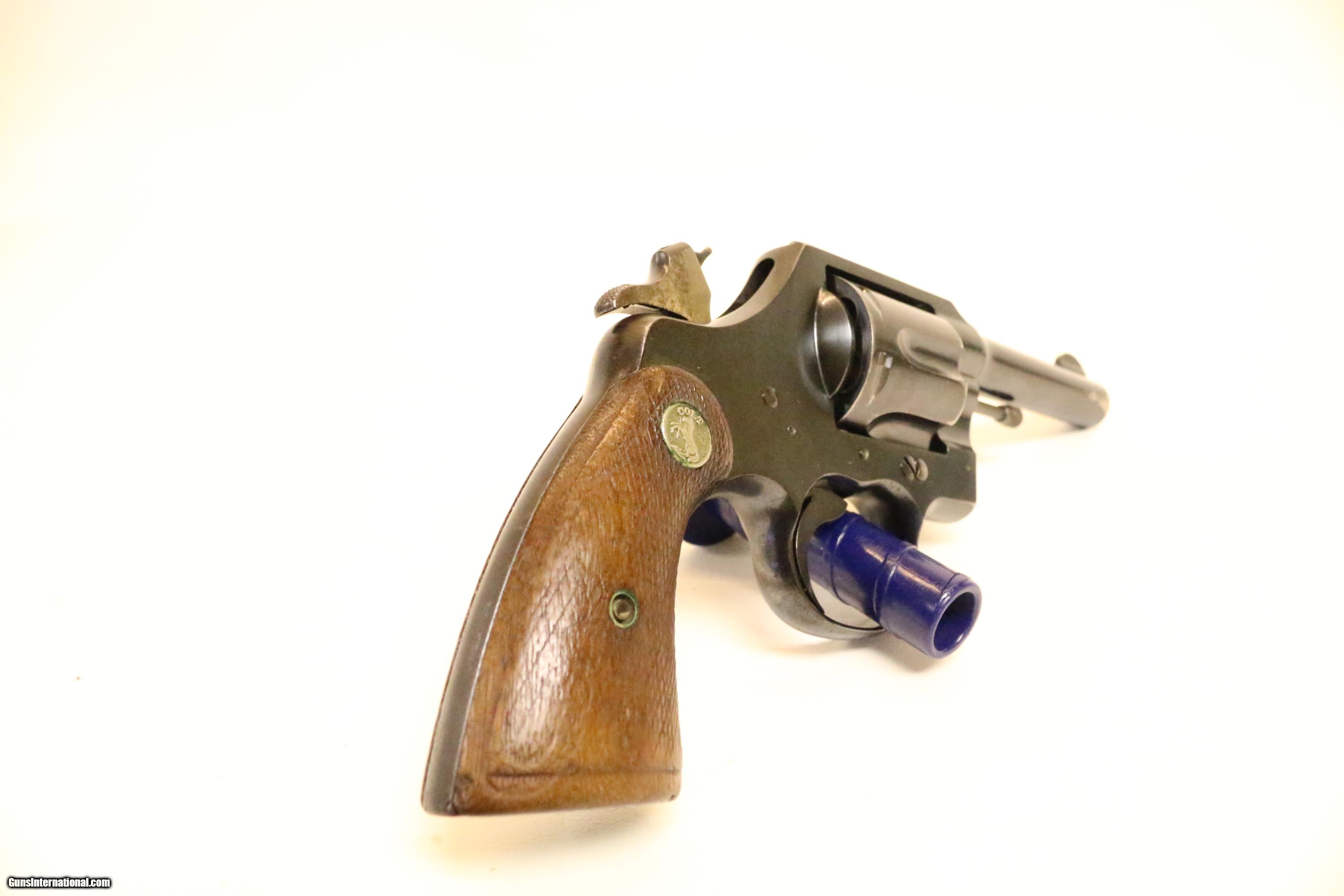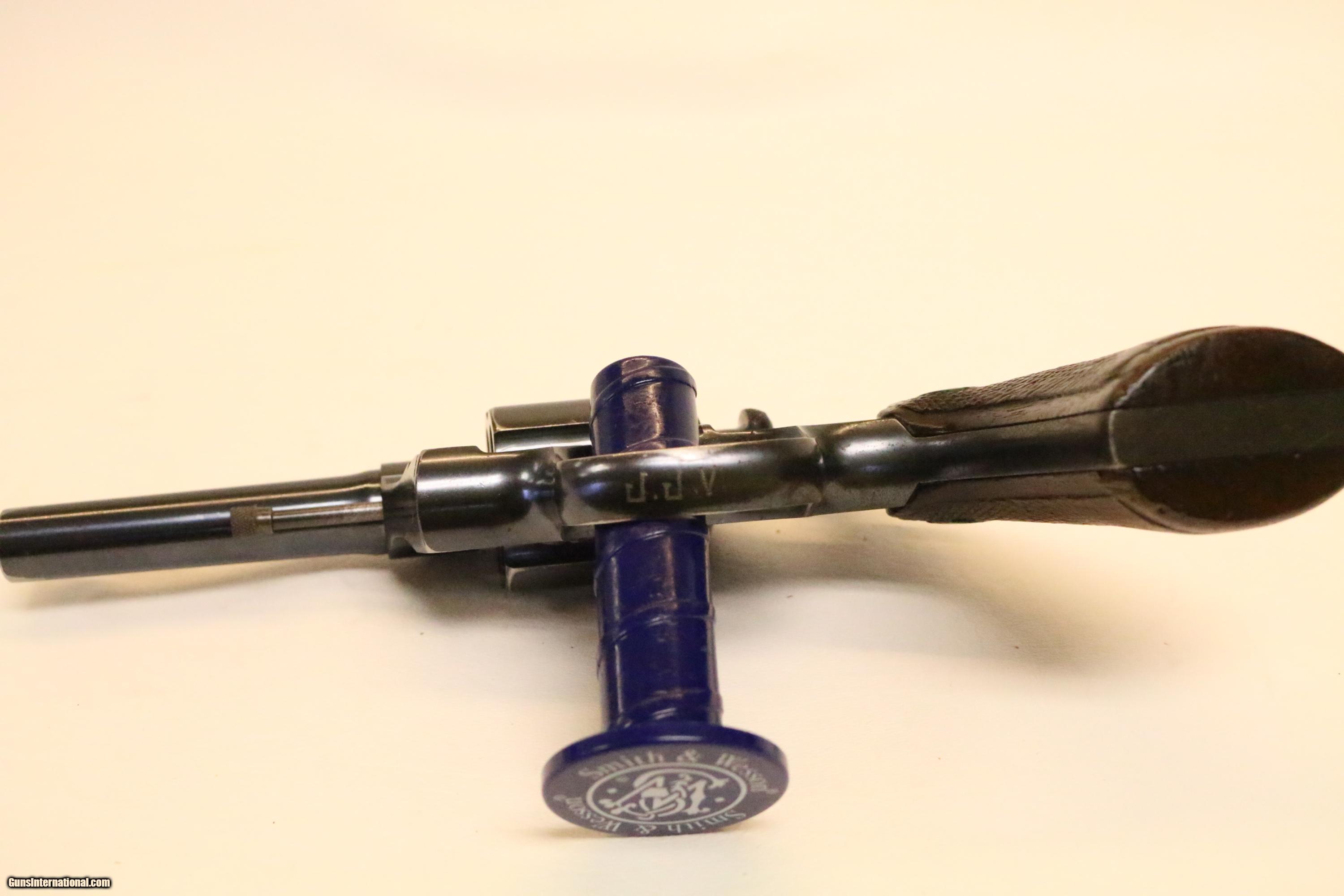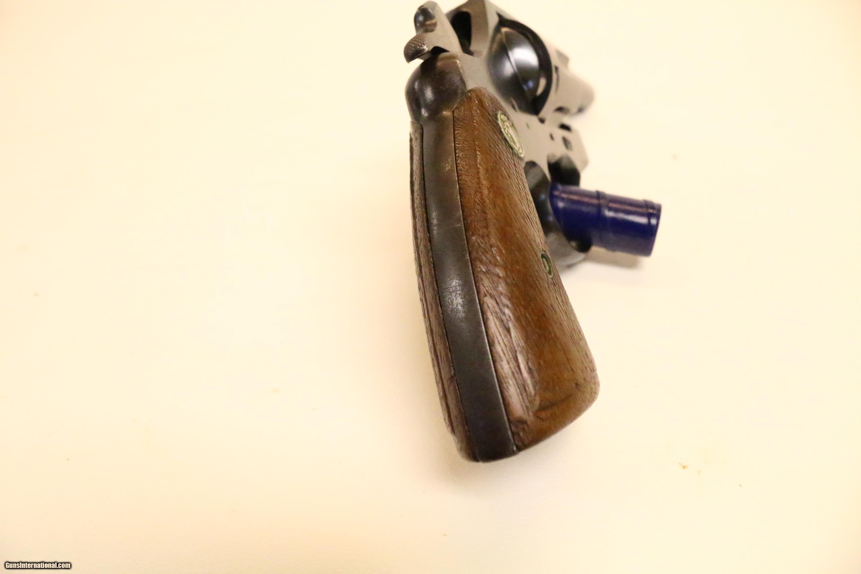 Description: This one has an A side and a B side. The left side is 96-97% original condition with strong blue and just a couple of freckles, The rights side is the B side the rear 1/3 or the gun shows light freckling from behind the flash shield back not deep and from 3 feet it looks great, the freckles are also on the back strap on right side of the hammer. The gun was made in 1933 per the 583xxx serial number. the lock up and timing are excellent and tight. there is holster wear on the muzzle as shown. The checkering on the right grip panel is worn more than the left but they match and appear to be the original medallion grips. The gun was stored a bit dry in the original owners leather duty holster laying predominantly on its right side until i purchased it and we believe that is what caused the surface freckles. It was his carry gun as a Chicago Police officer for his entire career and at some point he had his initials engraved on the bottom of the trigger guard. Overall a nice official police at a great price SOLD |