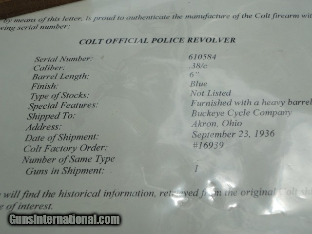 1936 Colt Official Police Special Order Buckeye Cycle Co Akron Ohio