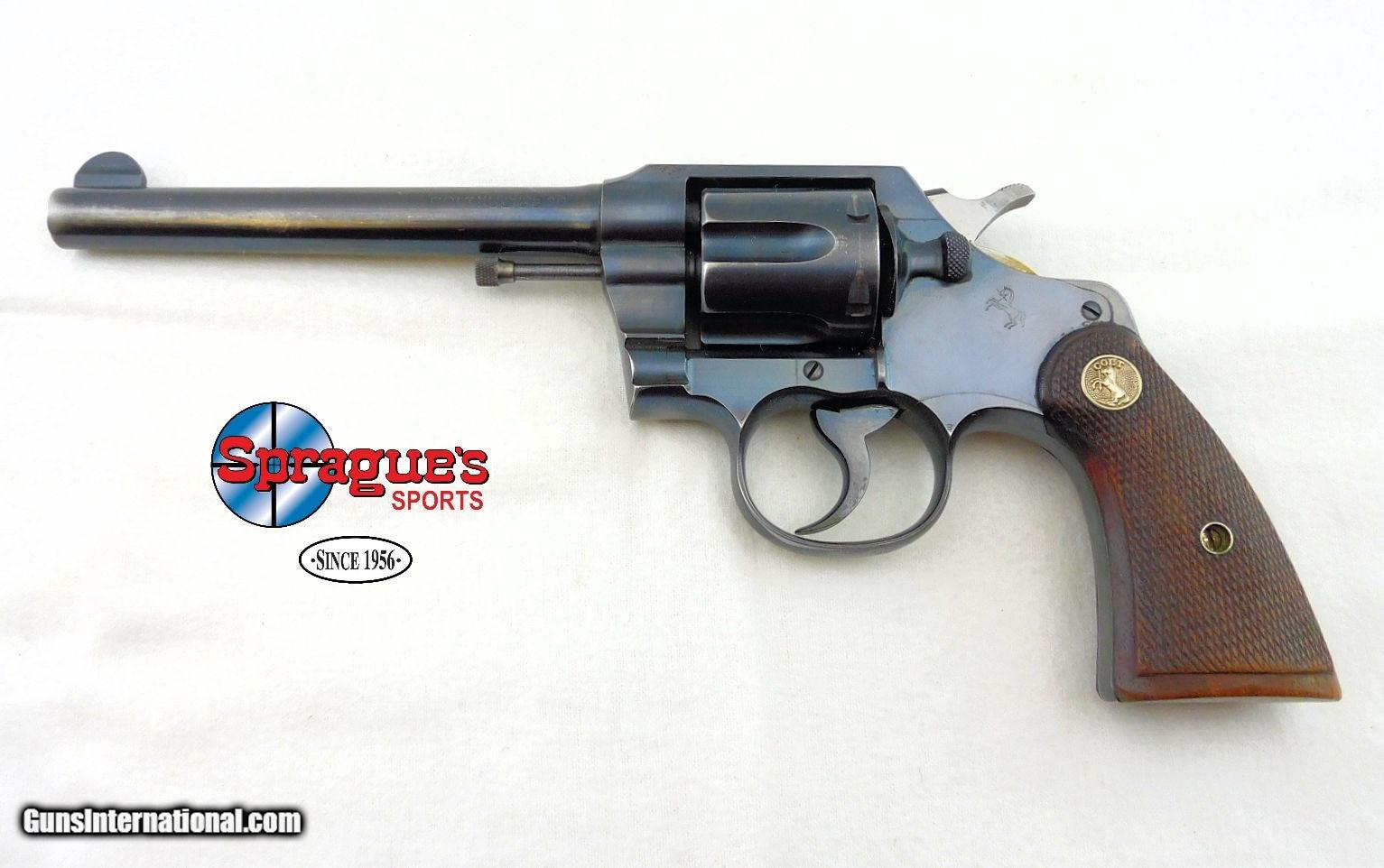 Description: Guns Listing ID: 402394 Colt Official Police MFG 1929 .38 SPL, 6\" bbl, bright shiny bore, good rifling, square notch rear sight, blade front sight, blued finish, and checkered walnut grips with inset Colt Rampant Colt medallions. SOLD Manufacturer: COLT Model: COLT OFFICIAL POLICE 38 Caliber Info: .38 SPL Condition: Used - Non-Certified Barrels: 6 BARREL Finish: BLUED |