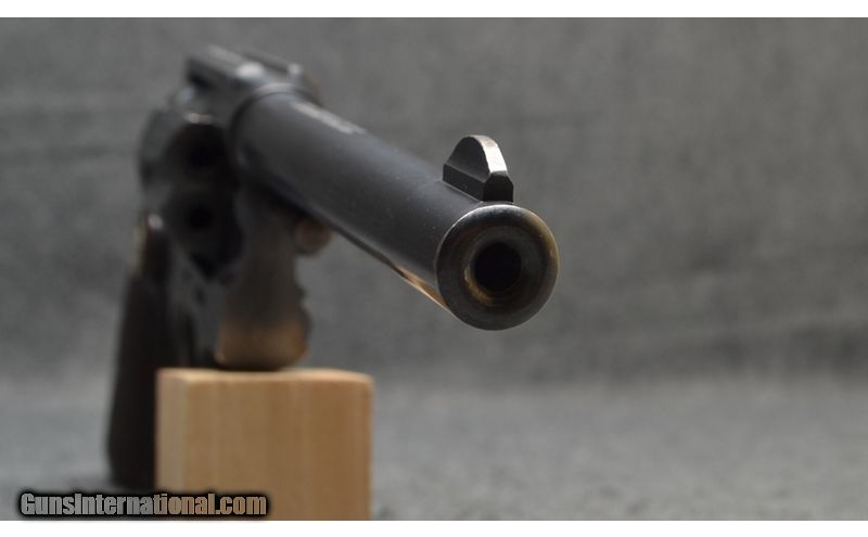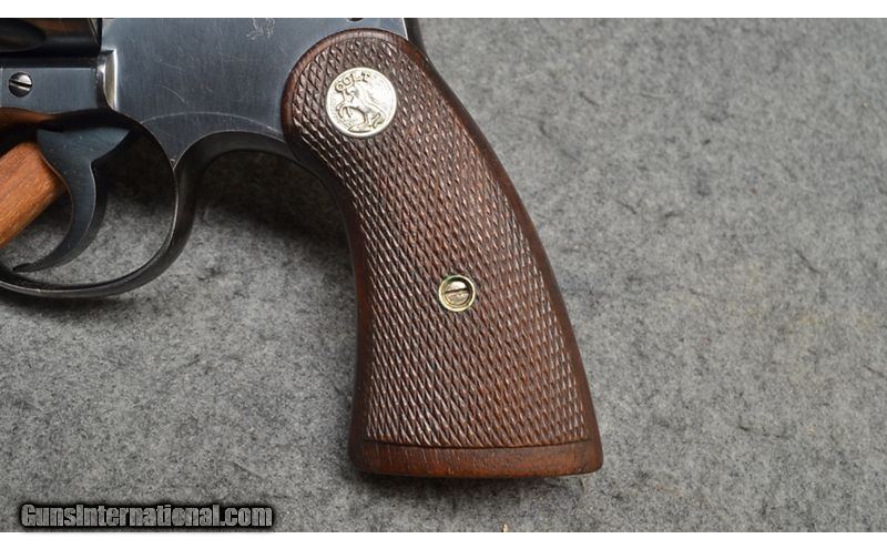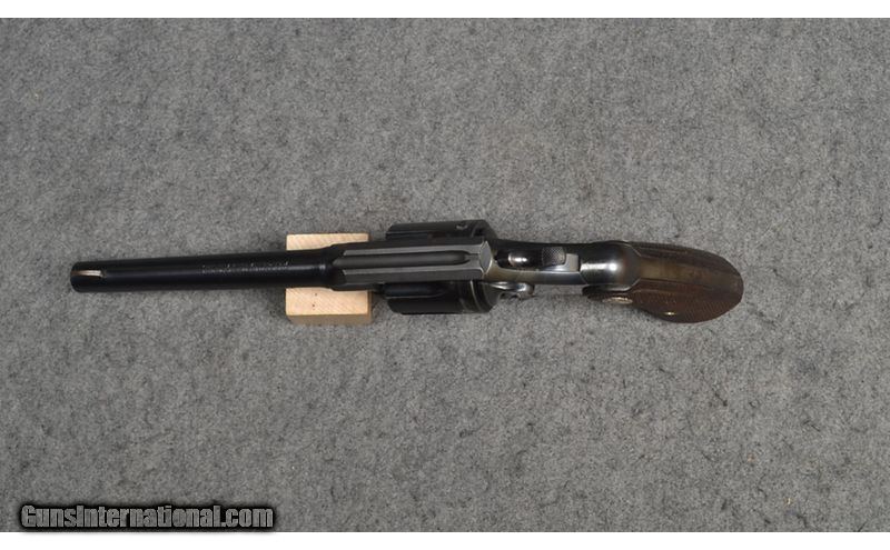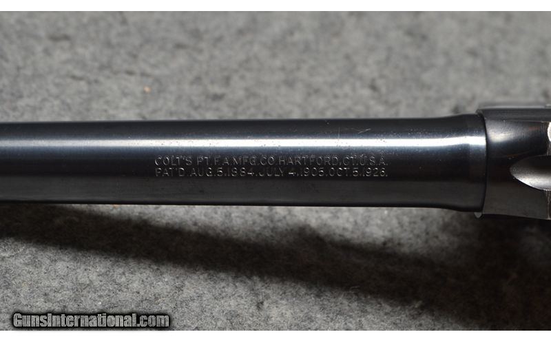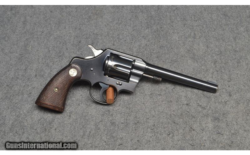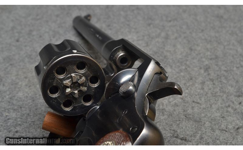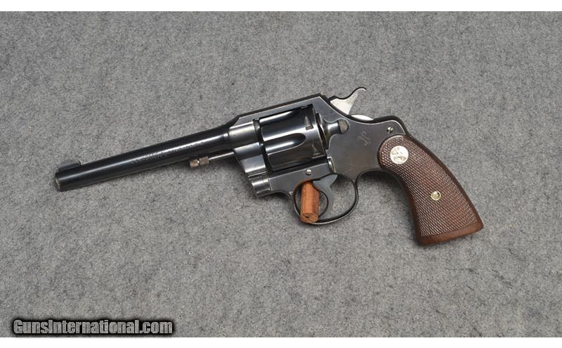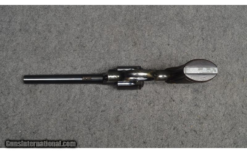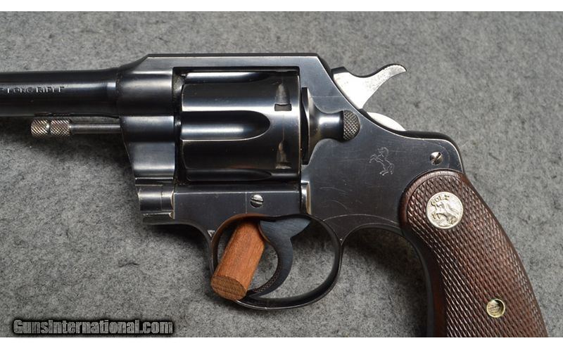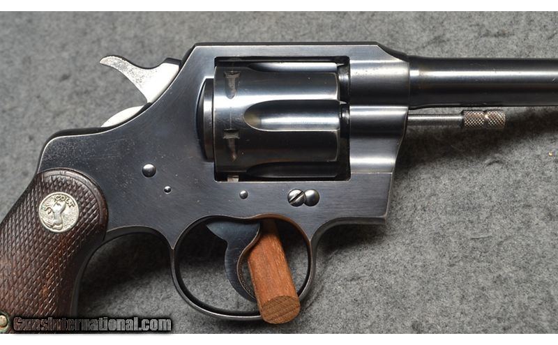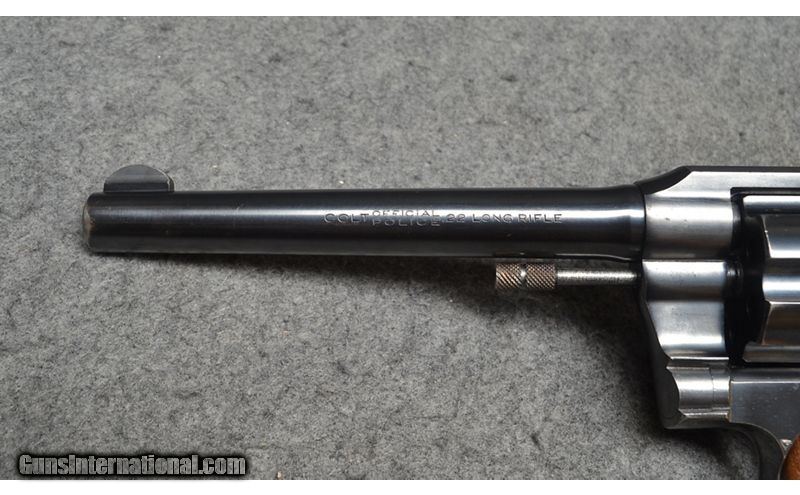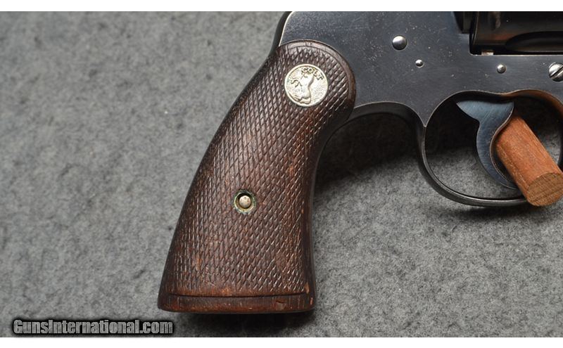 Description: This double action revolver is a pre-WWII Colt Official Police chambered for .22 Long rifle. This revolver features a polished hammer and trigger, checkered 2 piece wood grips with silver Colt medallions, and an exposed ejection plunger. This revolver is in overall fair to good condition, with finish wear to sharp edges and a drag line around the cylinder. The grips are in good condition, with no cracks, but the checkering is worn down on the right side from years of handling. The barrel rifling is still crisp, but there is a bulge right behind the front sight, that is visible on the outside from certain angles. Manufactured in 1940 according to Colt. .22 Long Rifle SOLD Metal Condition: Overall good condition Wood Condition: Overall good condition Bore Condition: "Bright and shiny, crisp rifling. Bulge underneath front sight. Barrels: 6in barrel Fore End: Checkered wood grips with silver colt medallion Weight: 2 Lbs 6 Oz Sights: "Groove rear sight, blade front sight Item Location: Wichita, KS |